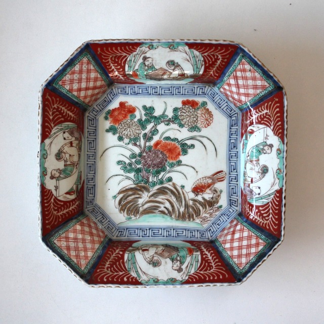 菊がモチーフとなった、古伊万里の隅切形のうつわです。 額皿と呼ばれたりもします。 菊のかたわらには、鳥の姿も。 また、周囲四方の窓絵には、囲碁を打つ人物や、筆で梅を描く人物の図。 おそらく、琴(→楽器)、棋(囲碁)、書、画(絵画)から成る四芸「琴棋書画(きんきしょが)」のうちの2つなのでしょう。 この一客のみで入手したのですが、もしかしたら、もとは本品と対となる同形同寸の皿があって、そちらには「琴」や「書」の図が描かれていたのかもしれません。 状態:口縁に小ホツ。 径 24.3×24.3cm 高さ 5.3cm 重さ 約824g 磁器 日本・有田 江戸時代後期・19世紀 A charming polychrome porcelain octagonal plate, with design of chrysanthemums and a bird. Chinese scholars are painted around. Playing Go and drawing a picture are two of the four arts of Chinese scholars. Porcelain Arita, Japan Late Edo, 19th C. Condition : Minor chips on around the rim. d24.3×24.3cm h5.3cm We ship worldwide. Please contact us for overseas shipping. We might offer you better rate.