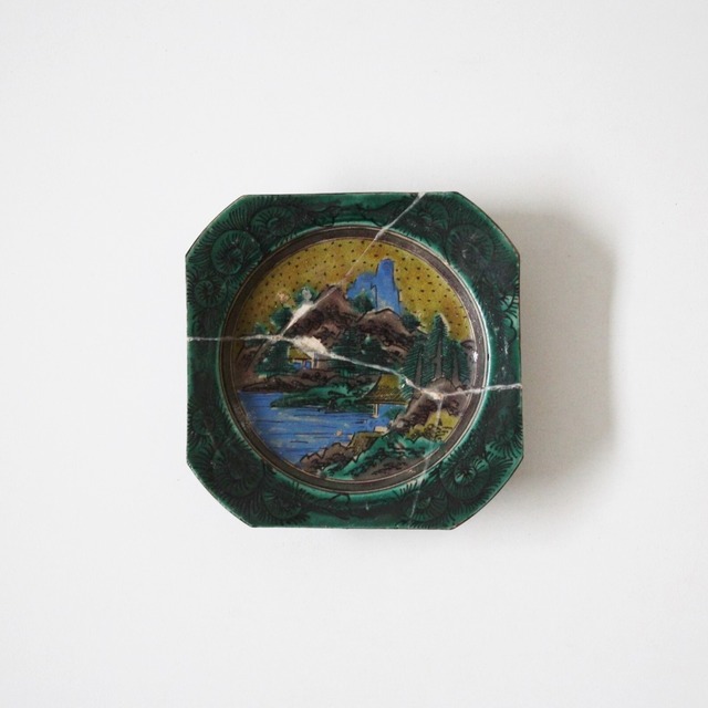 緑や黄色が基調となった「青手」「青九谷」と呼ばれる九谷のうつわです。 四隅を切り落として八角形の隅切形としています。 唐草に囲まれた山水風景です。 割れた箇所を釉薬(白)を接着剤として再度窯の中に入れて溶着しています。 継ぎの白い線を、(秋の)雷に見立て、文様のひとつとしてもお楽しみいただければと思います。 状態:硝子継ぎ。釉薬に煮え。 水漏れ:なし 径 12.7×12.7cm 高さ 2.5cm 重さ 約188g 磁器 日本・九谷・松山窯 江戸時代後期~明治時代 19世紀 Though repaired, a rare and charming enameled porcelain square plate with cut off corners. Landscape design. Porcelain Matsuyama Kiln, Kutani, Japan Late Edo to Meiji. 19th C Condition : Yakitsugi repaired. Glaze defects. d12.7×12.7cm h2.5cm We ship worldwide. Please contact us for overseas shipping. We might offer you better rate.