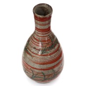 胴にめぐらされた赤いラインの上から、緑釉と金彩を用いてすすきが描かれています。