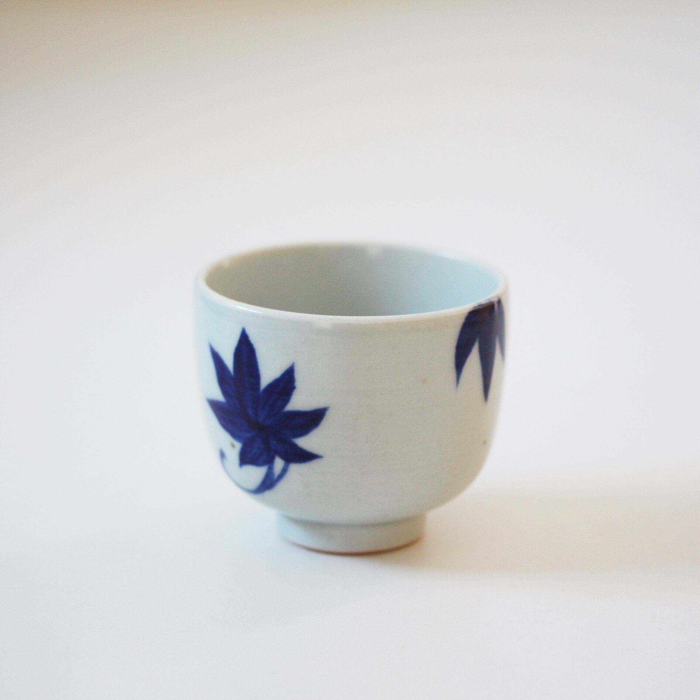 A charming blue and white porcelain cup with design of momiji maple leaves.