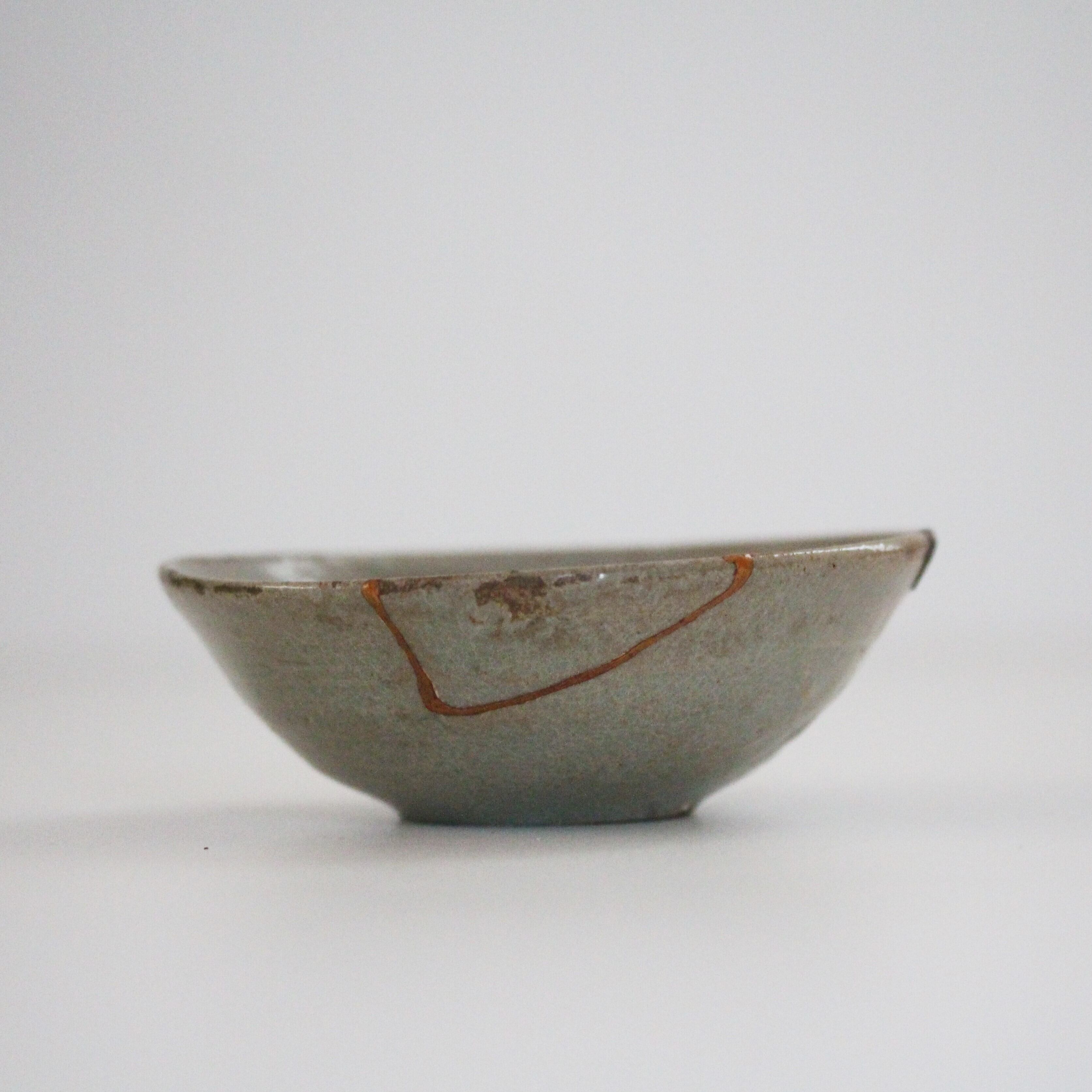 A charming Koryo celadon small bowl with chrysanthemum design in white slip. It can be used as sake cup. Kintsugi repaired on the rim.