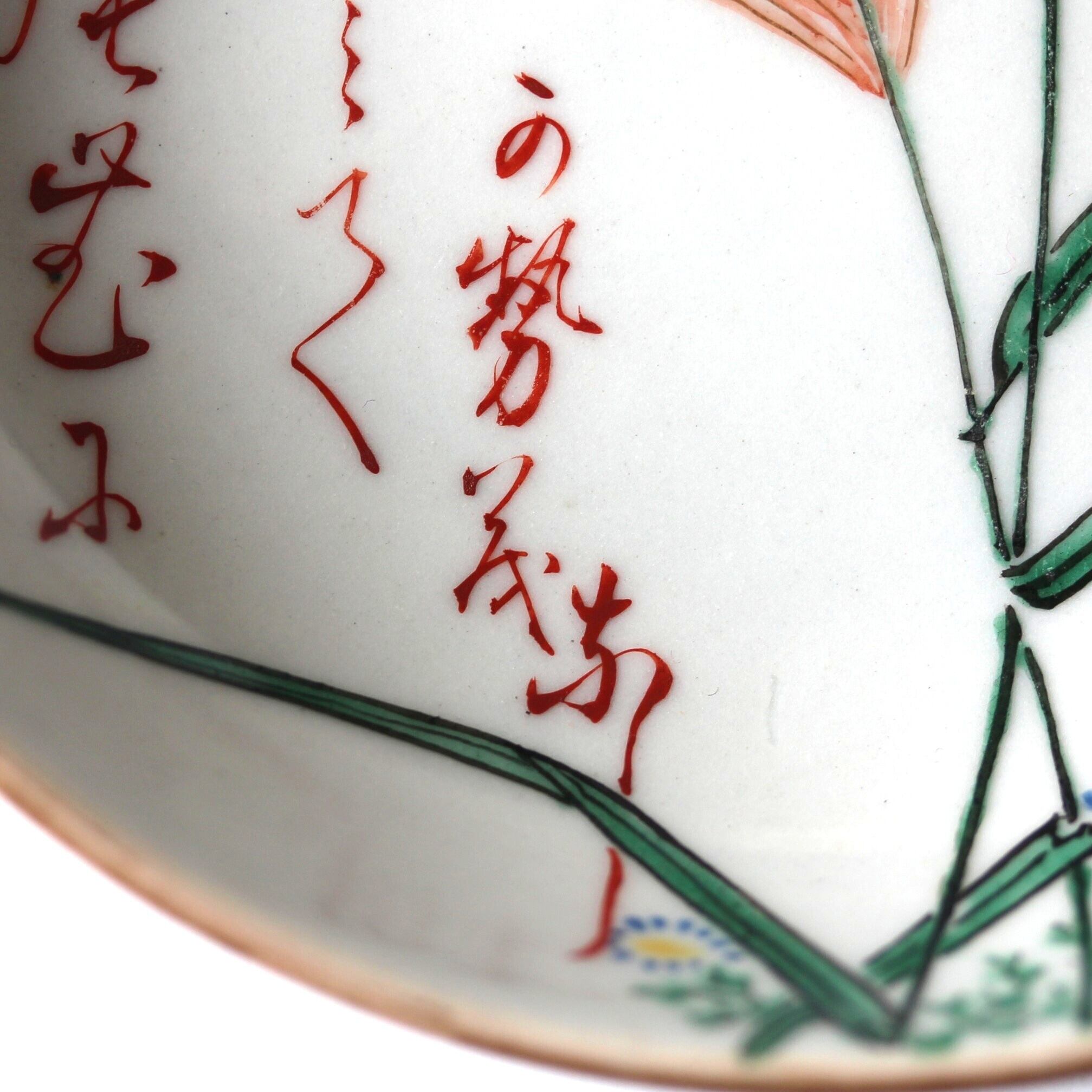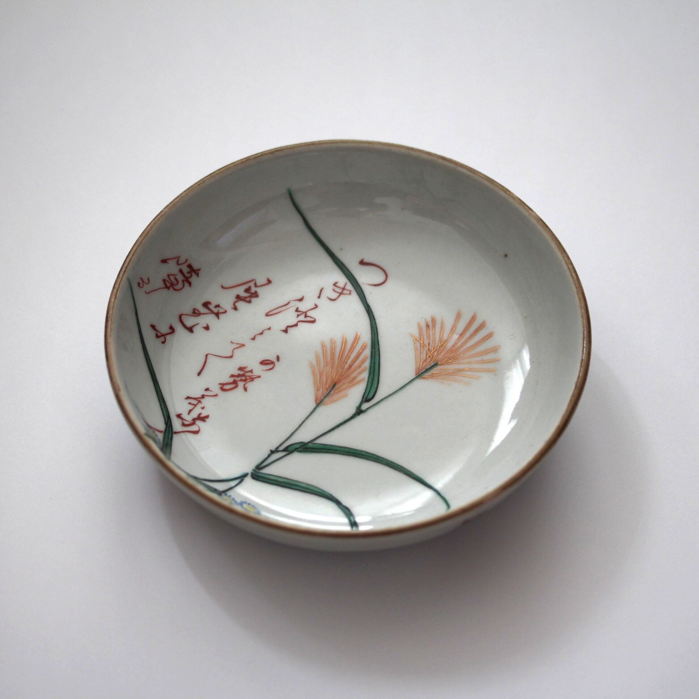 A charming enameled small dish, with design of susuki silver glass and chrysanthemus. Letters express a poem about susuki silver grasses.
