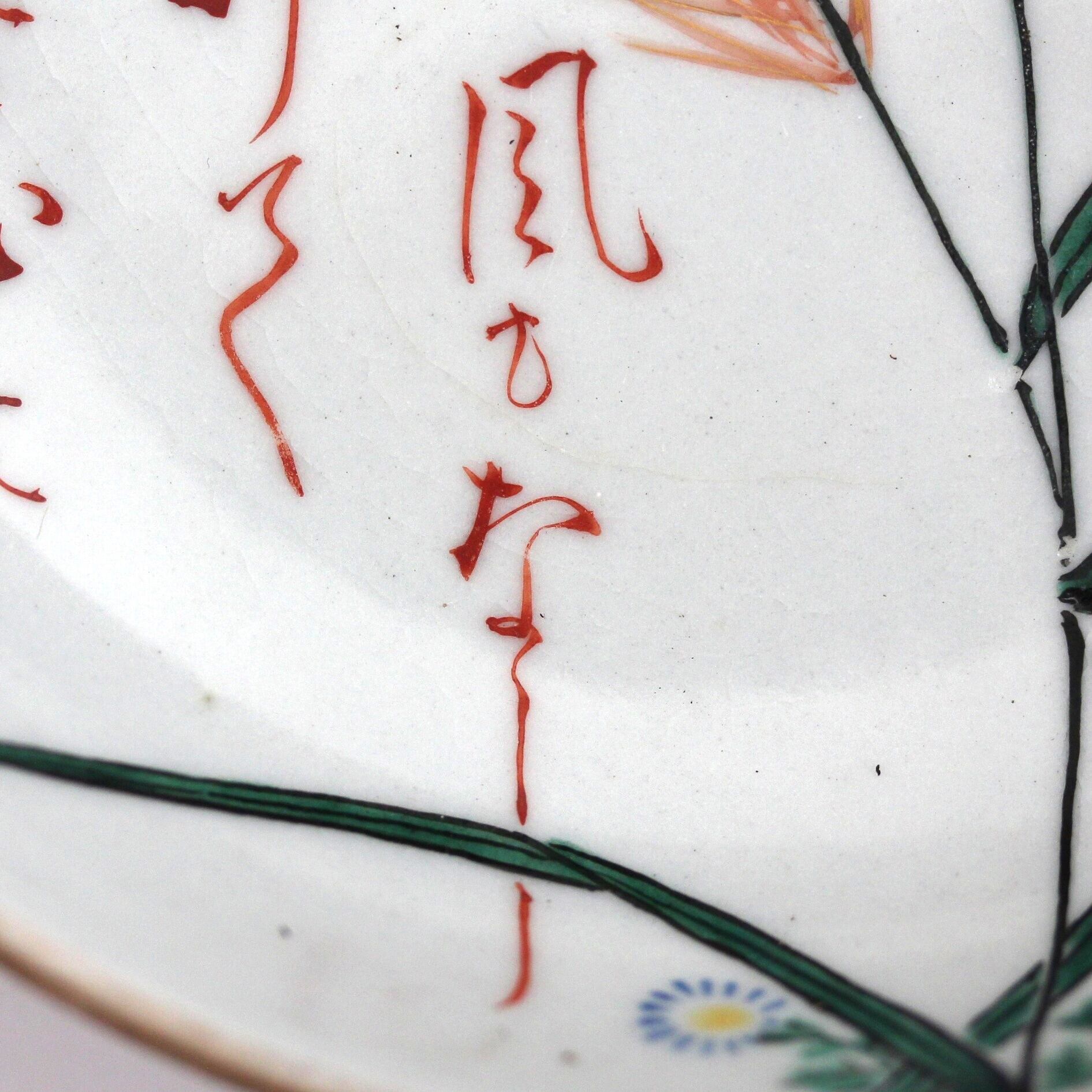 A charming enameled small dish, with design of susuki silver glass and chrysanthemus. Letters express a poem about susuki silver grasses.
