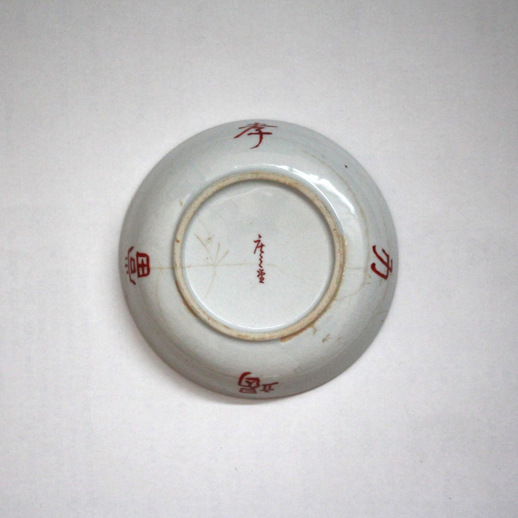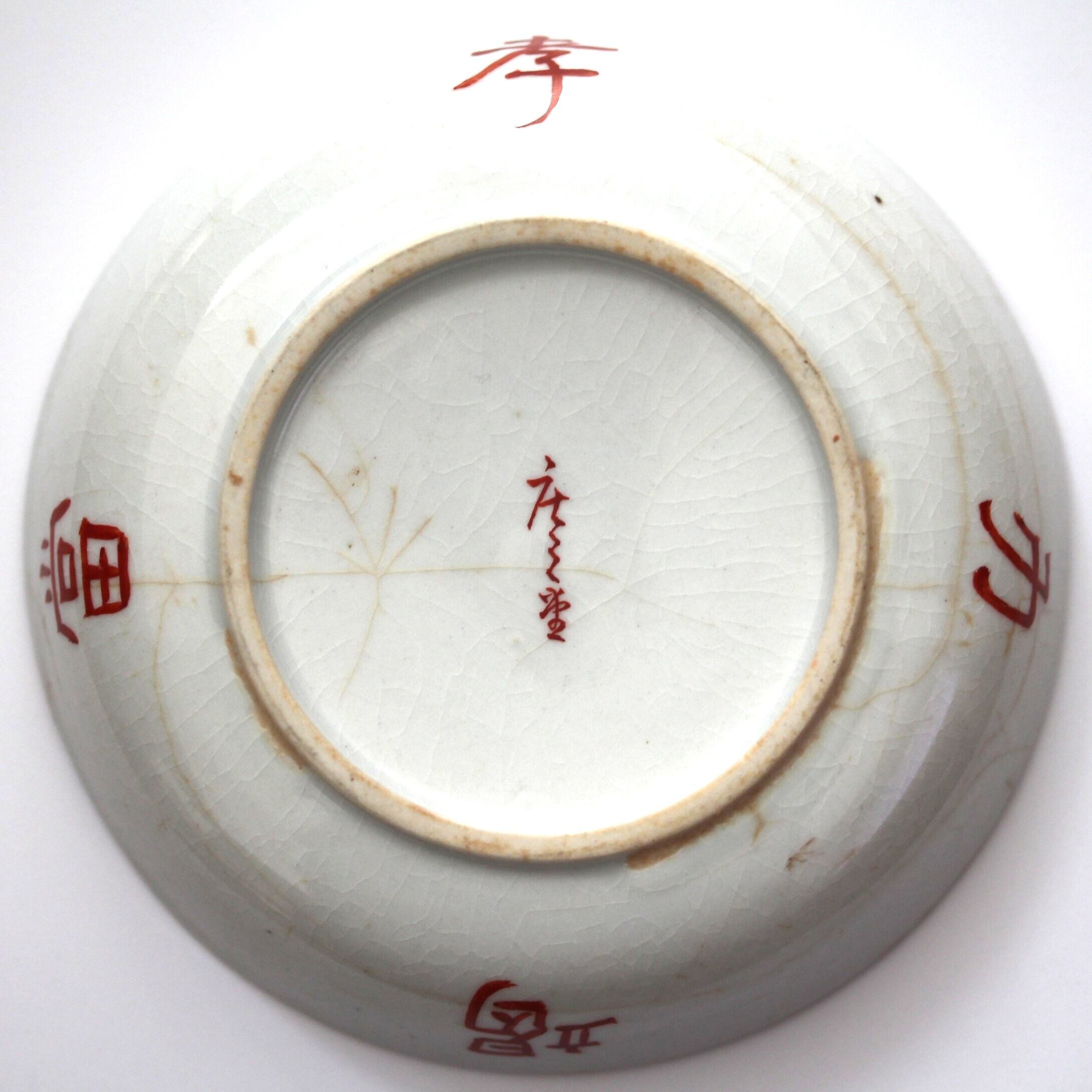 A charming enameled small dish, with design of susuki silver glass and chrysanthemus. Letters express a poem about susuki silver grasses.