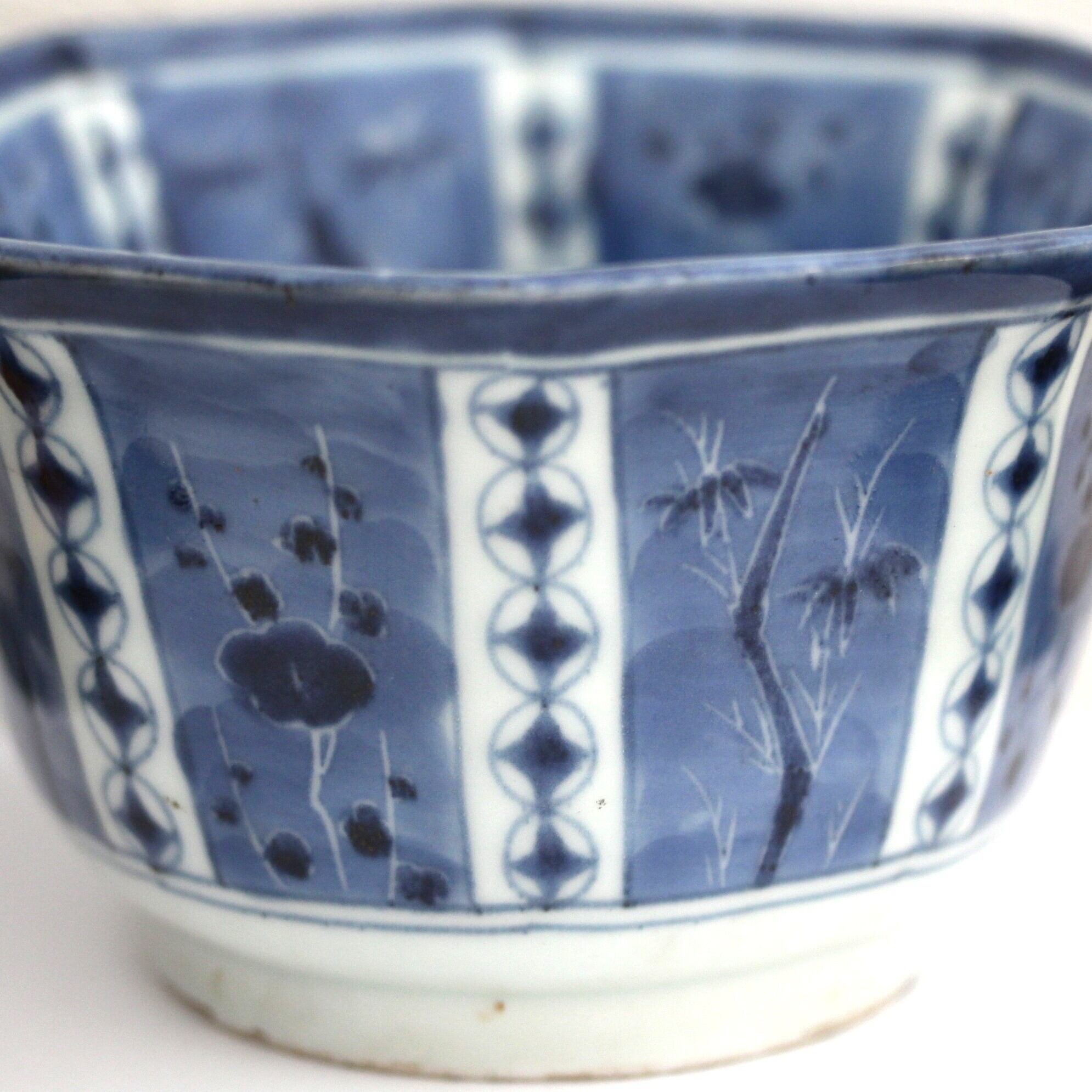 A charming blue and white porcelain octagonal bowl. Bamboos and plum trees are painted with "sumi-hajiki" ink technique, and shippo pattern between them.