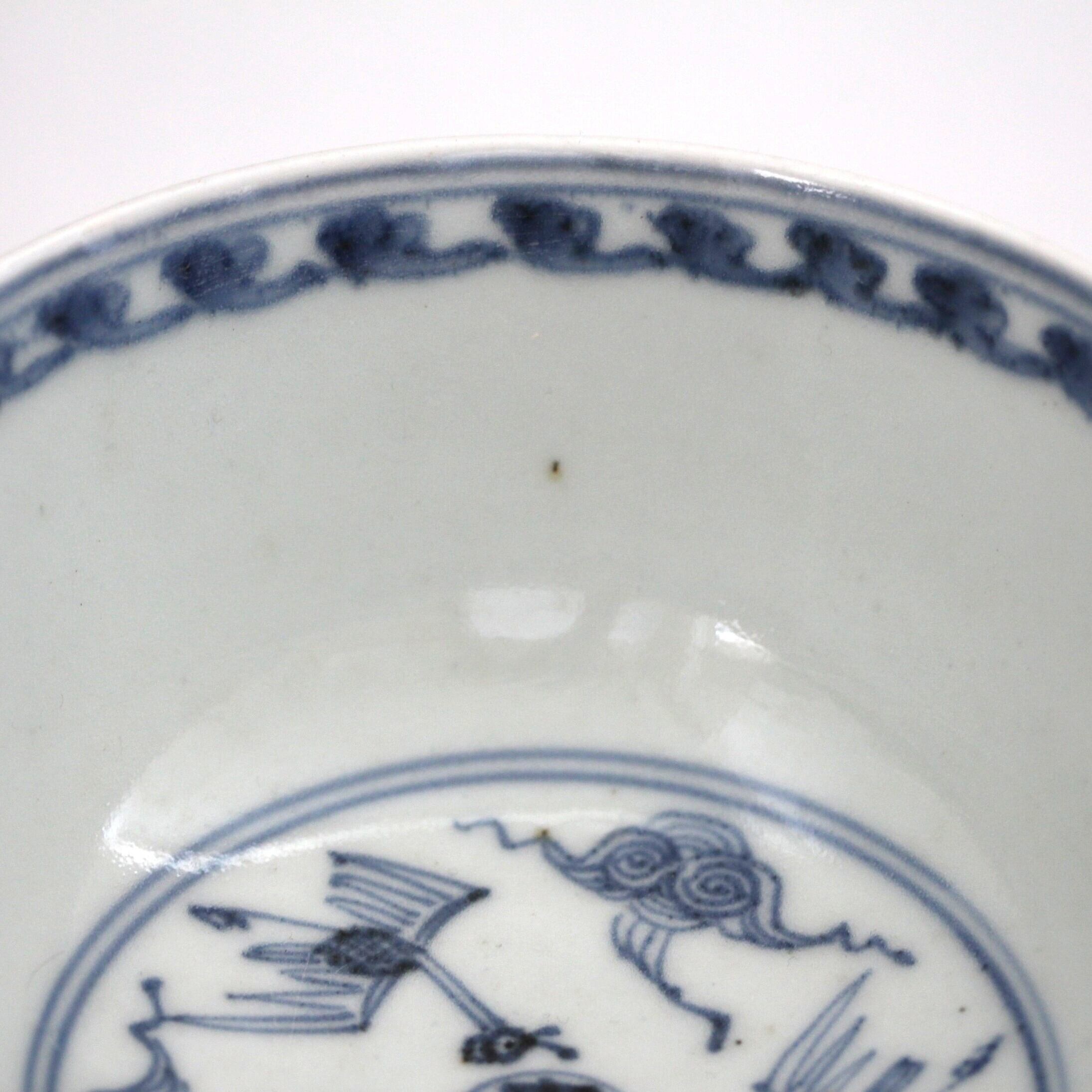 A charming blue and white porcelain bowl, with design of flying cranes amidst clouds. The design seems to be influenced by Chinese (or Korean) blue and white porcelain vessels.