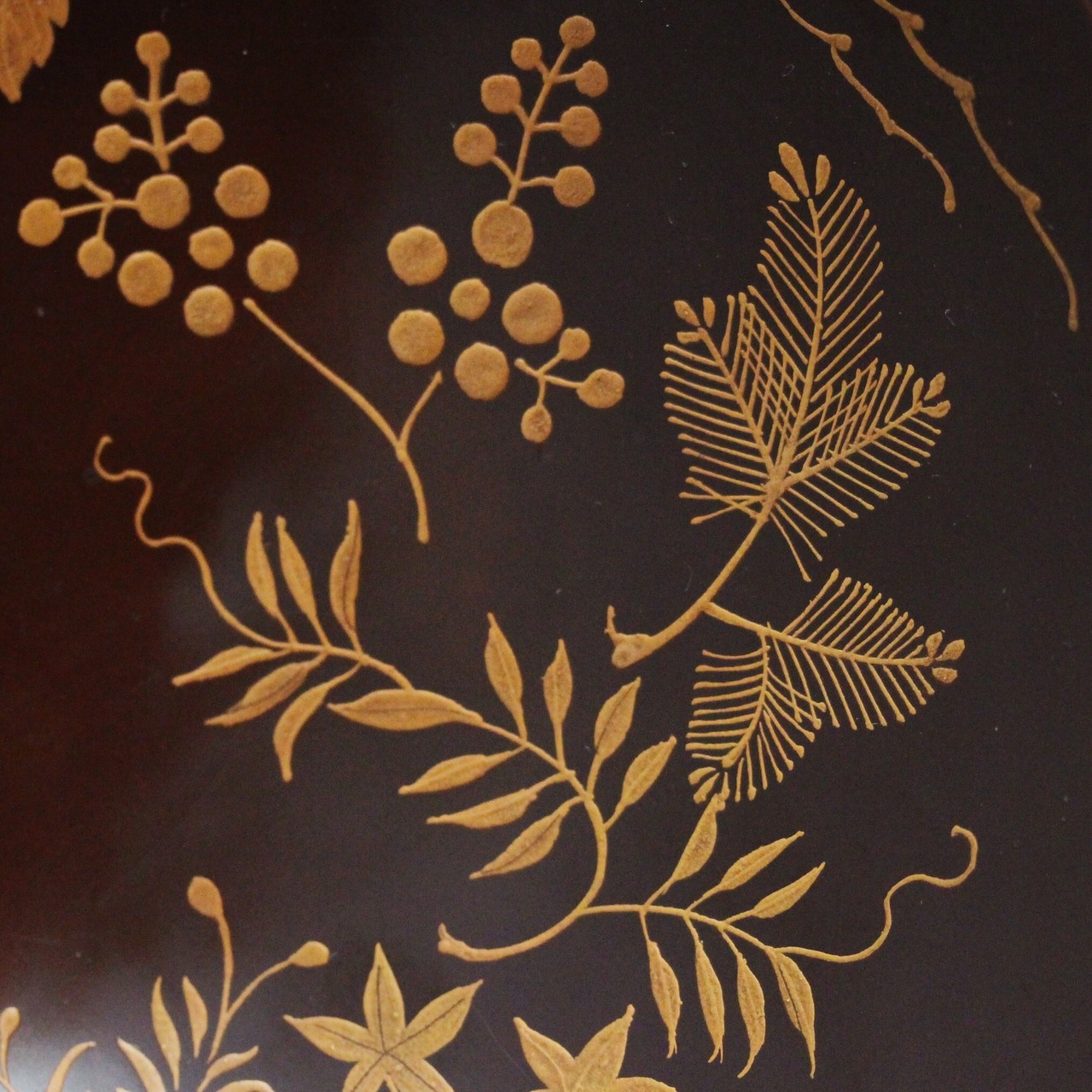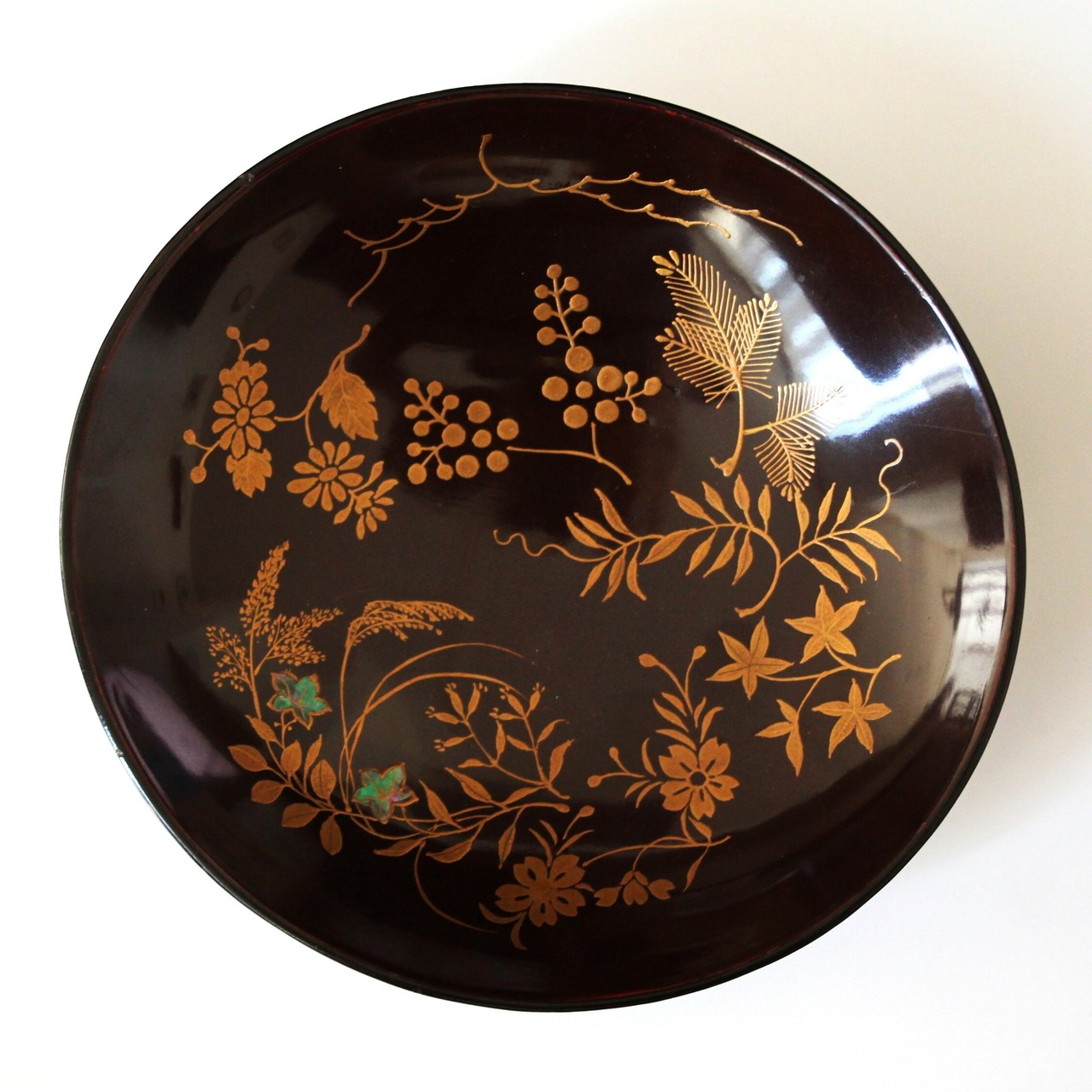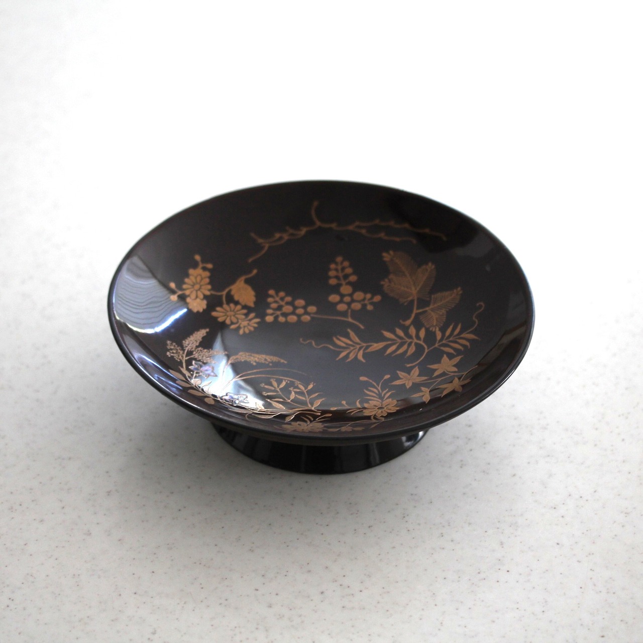 草花蒔絵菓子器 d17.1cm Lacquered Wooden Dish with Stand, Design of Autumnal and Other Seasonal Flowers in Gold Makie 19th-20th C | HANAFUDA