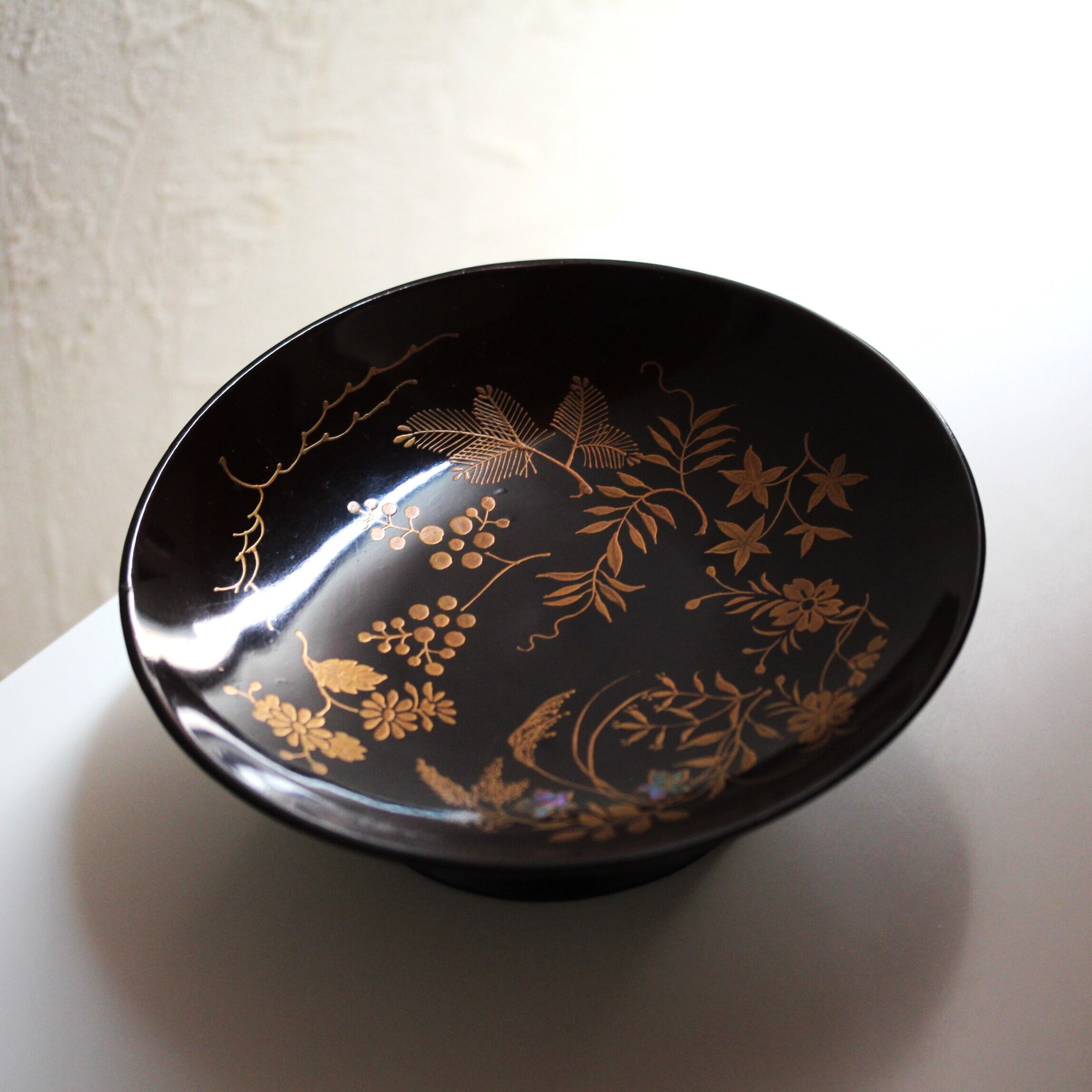 草花蒔絵菓子器 d17.1cm Lacquered Wooden Dish with Stand, Design of Autumnal and Other Seasonal Flowers in Gold Makie 19th-20th C
