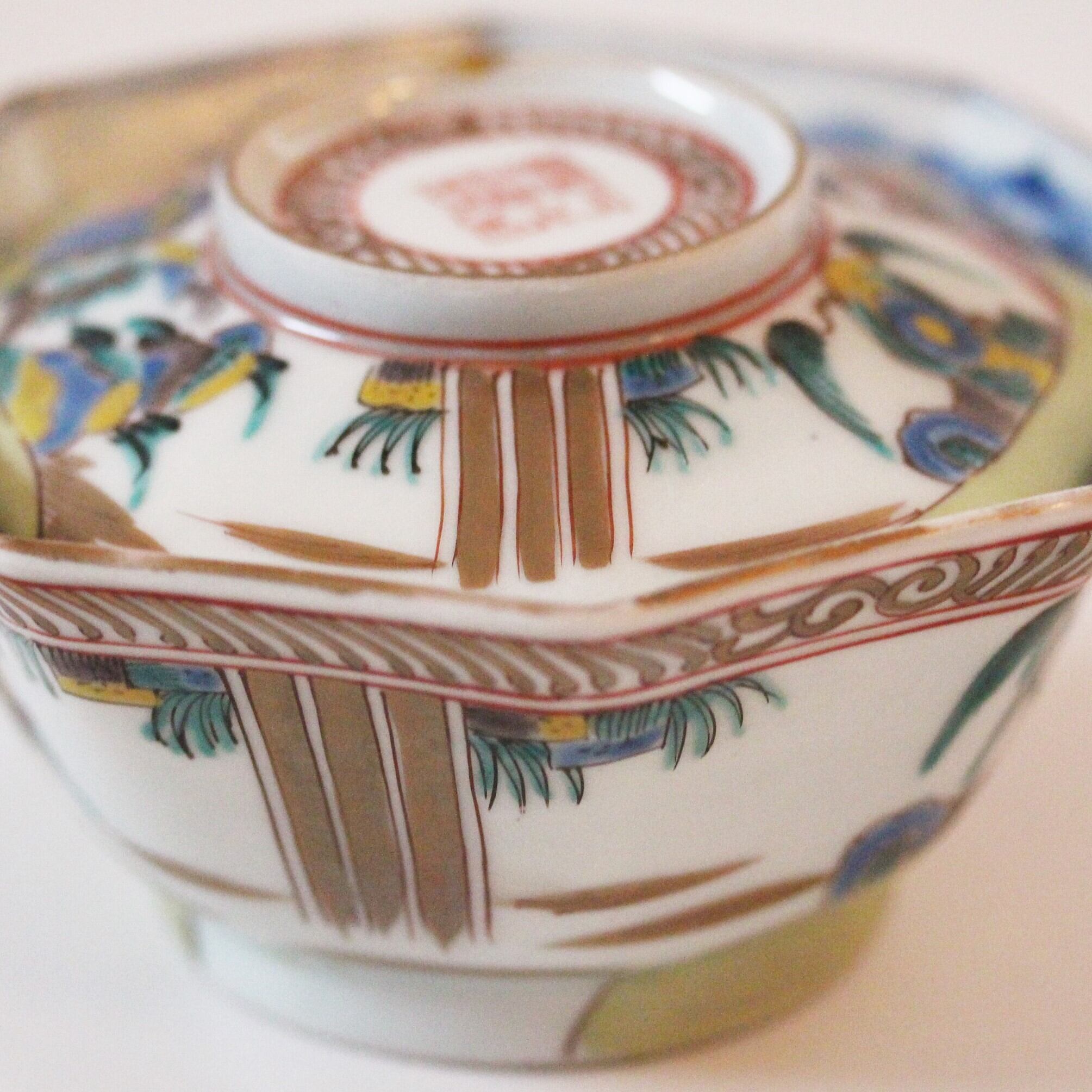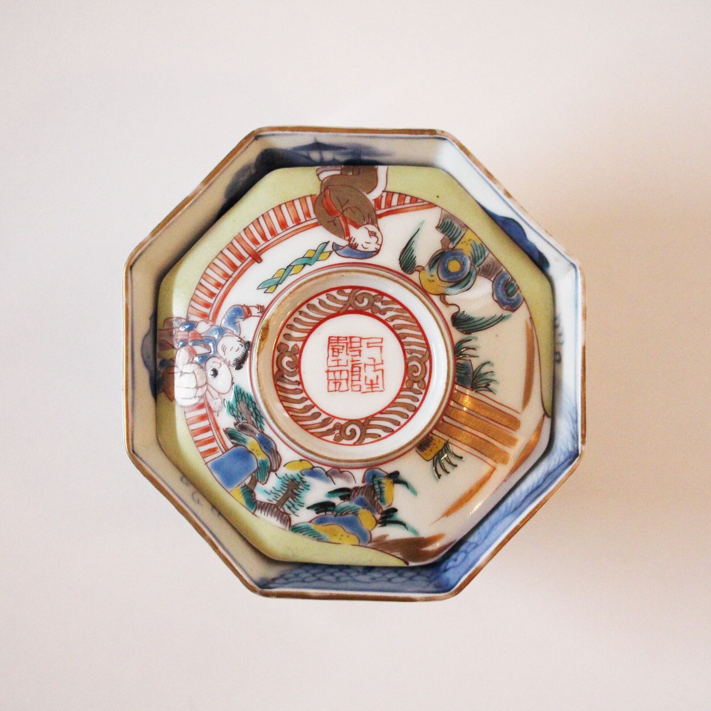 古伊万里色絵唐人物山水文八角蓋付碗 d12.0cm Imari Polychrome Covered Bowl, Design of Chinese Figures and Landscape 18thー19th C | HANAFUDA