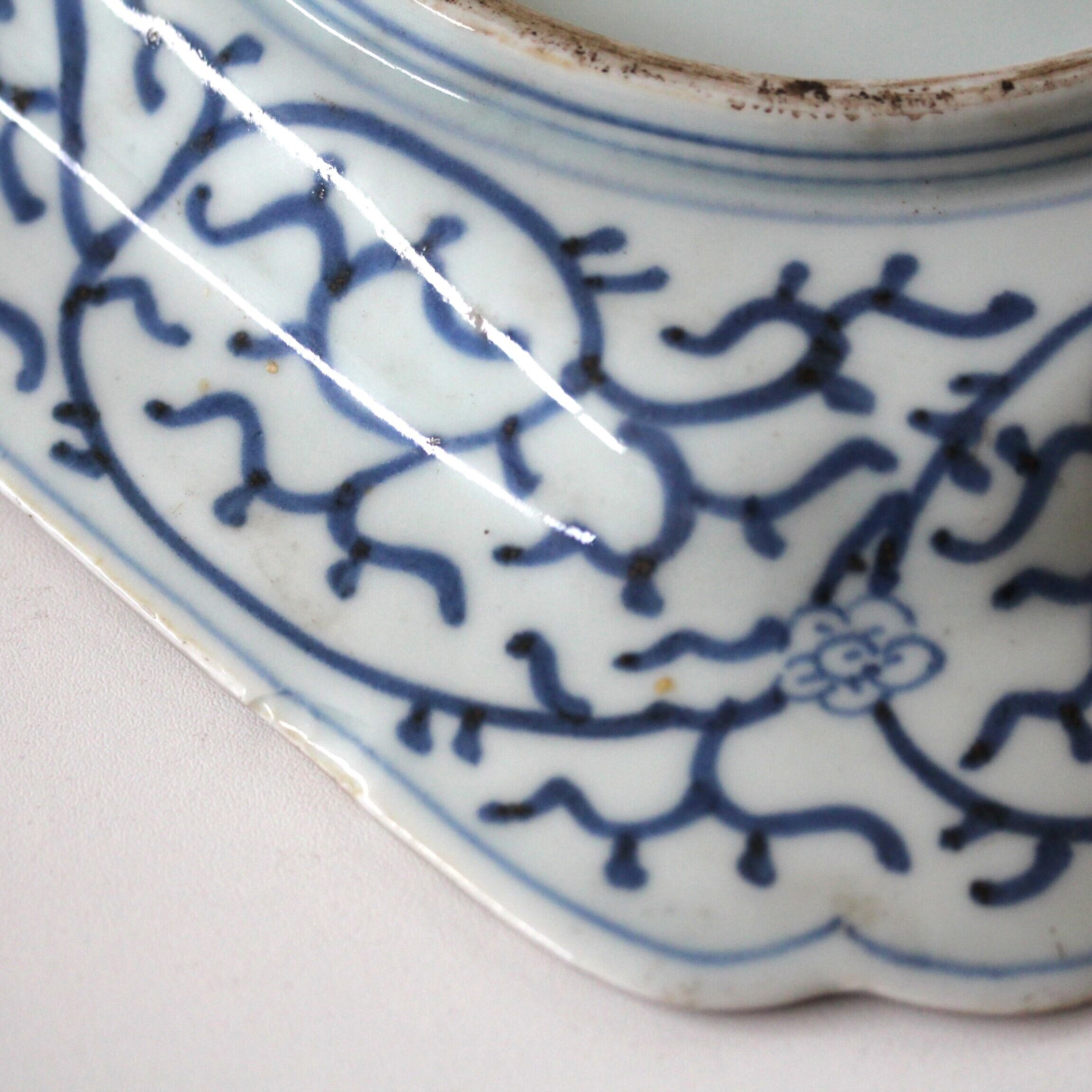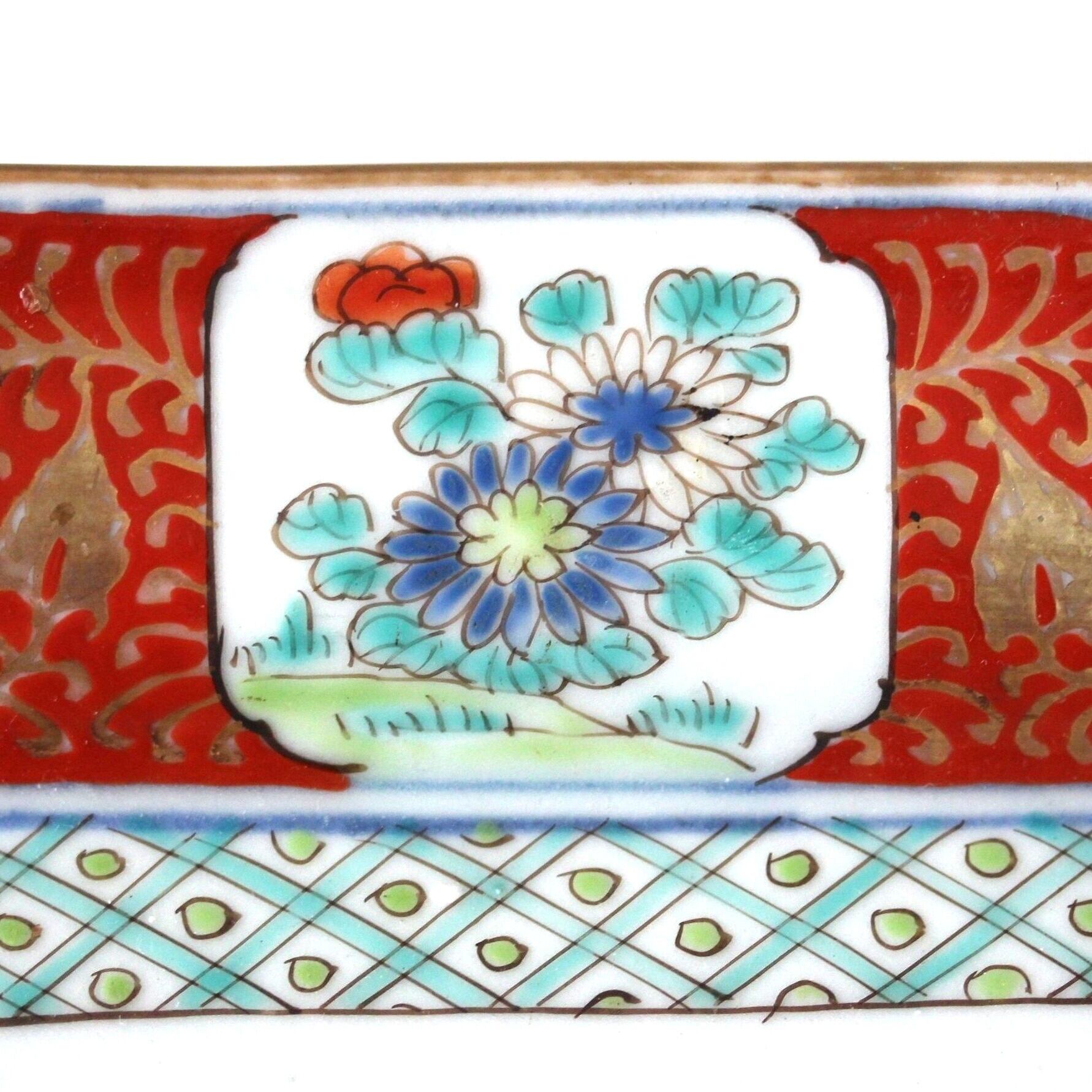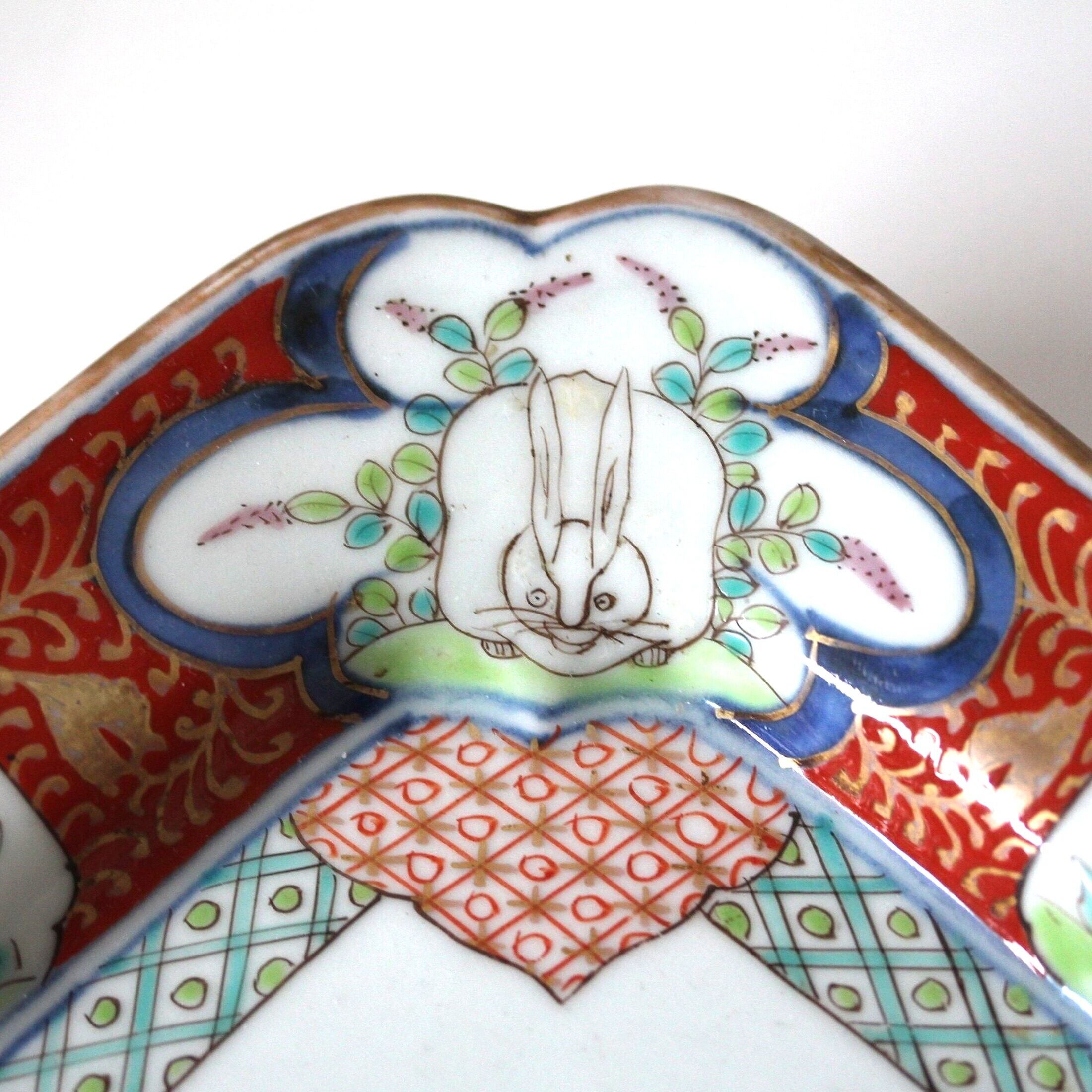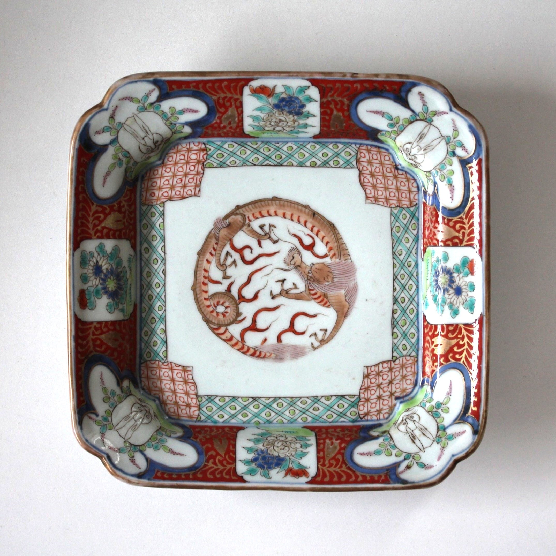 A charming polychrome porcelain square dish, with design of dragon, rabbits and flowers.