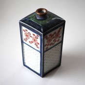 A charming polychrome porcelain square bottle. Chrysanthemums are embossed and painted in upper windows of each side, while matsukawabishi, diamond shaped pine bark, are embossed in lower part of each side.