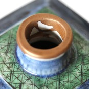 濃い染付のラインで縁取られ、上面は地紋が幾何学文となった緑釉による塗りつぶし。