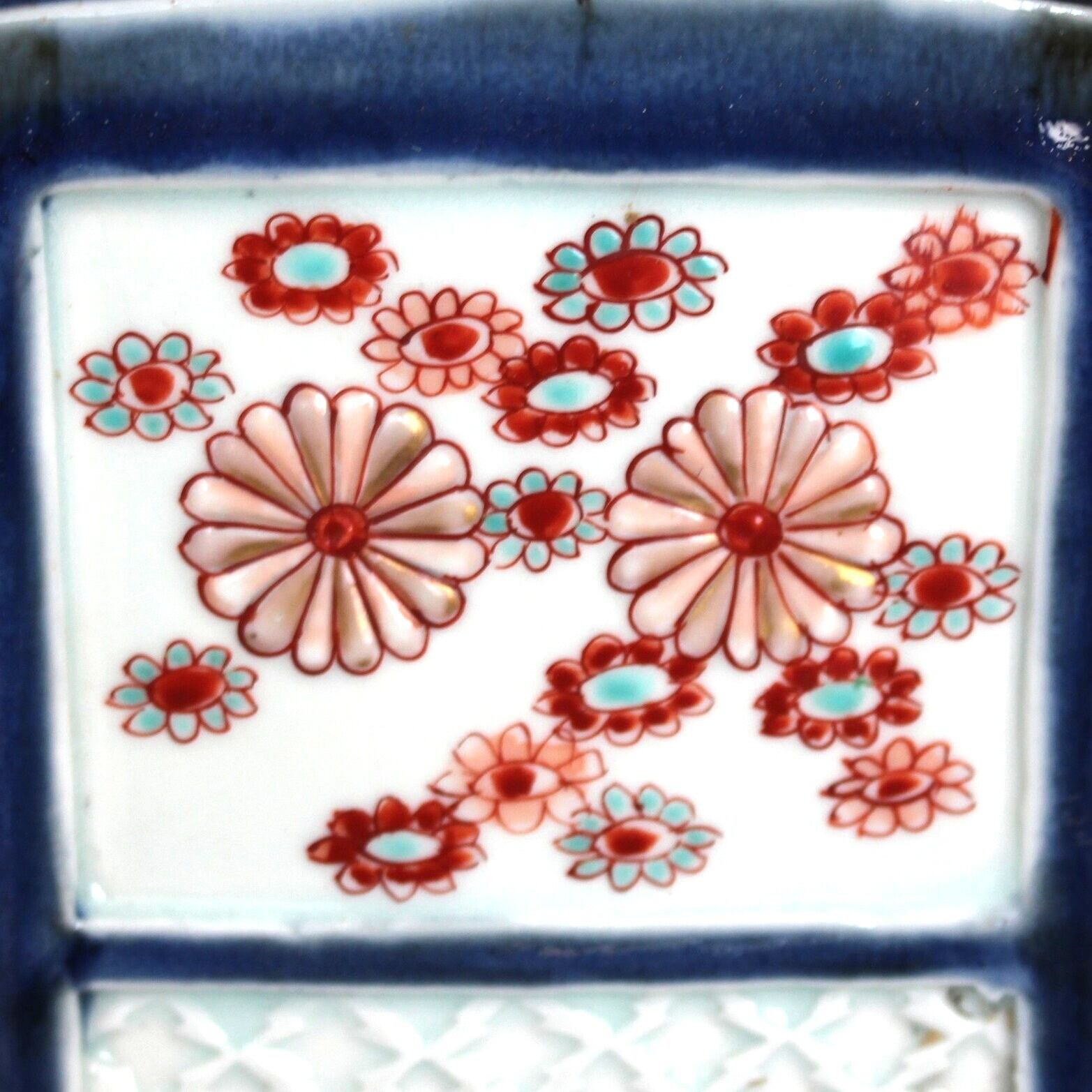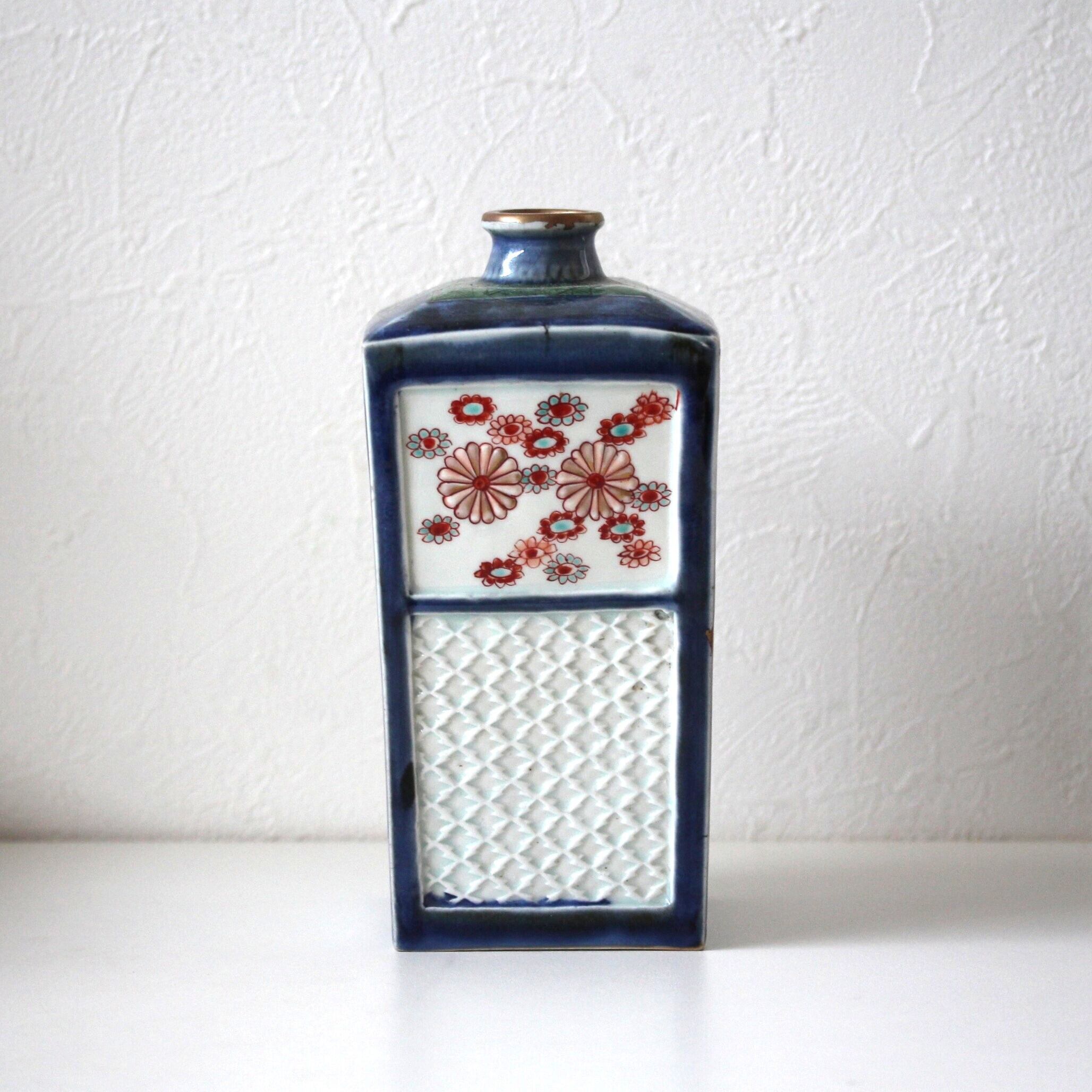 古伊万里陽刻色絵菊花松皮菱文角瓶 h20.9cm Imari Polychrome Embossed Square Bottle, Chrysanthemums Design and Matsukawabishi Pattern 18th C | HANAFUDA