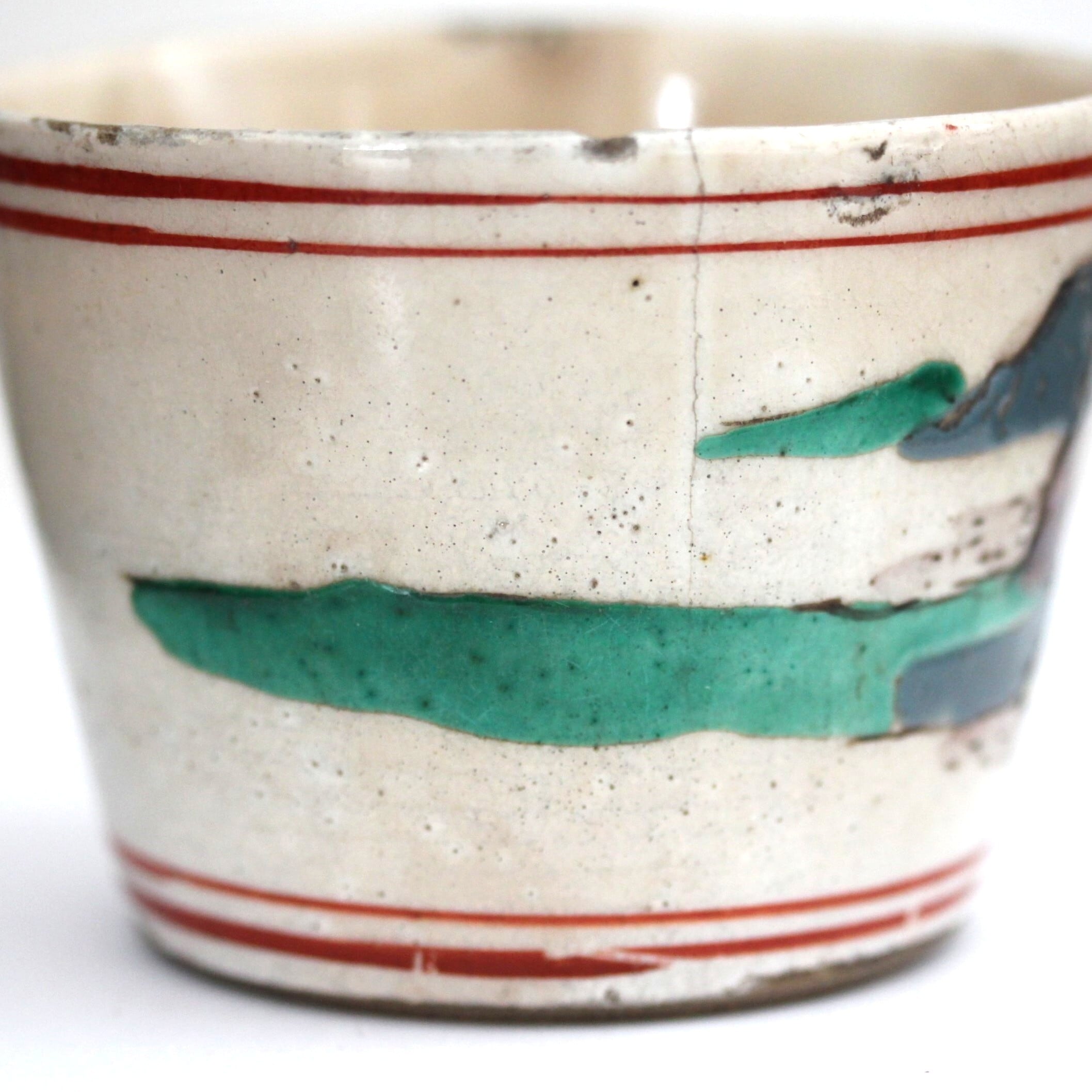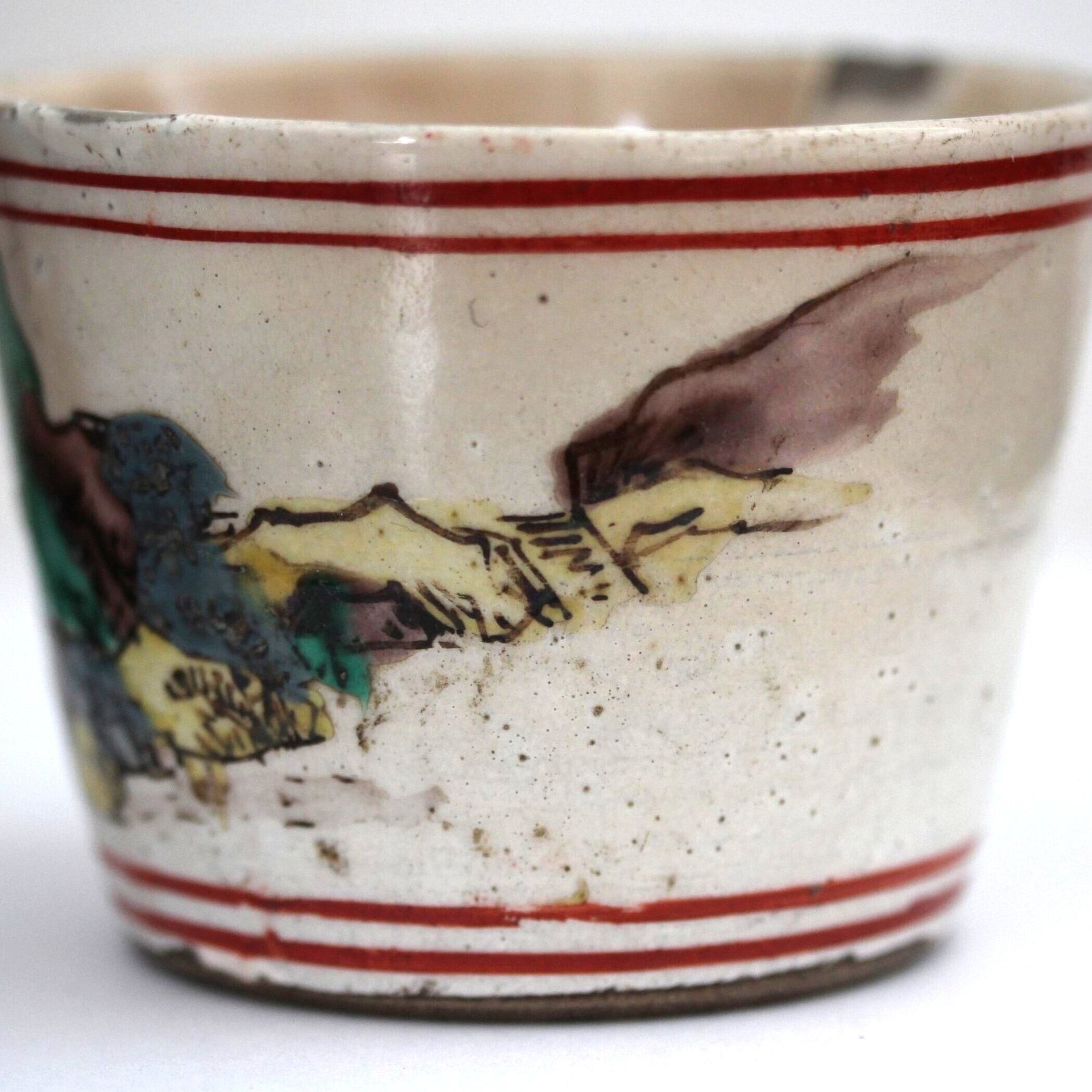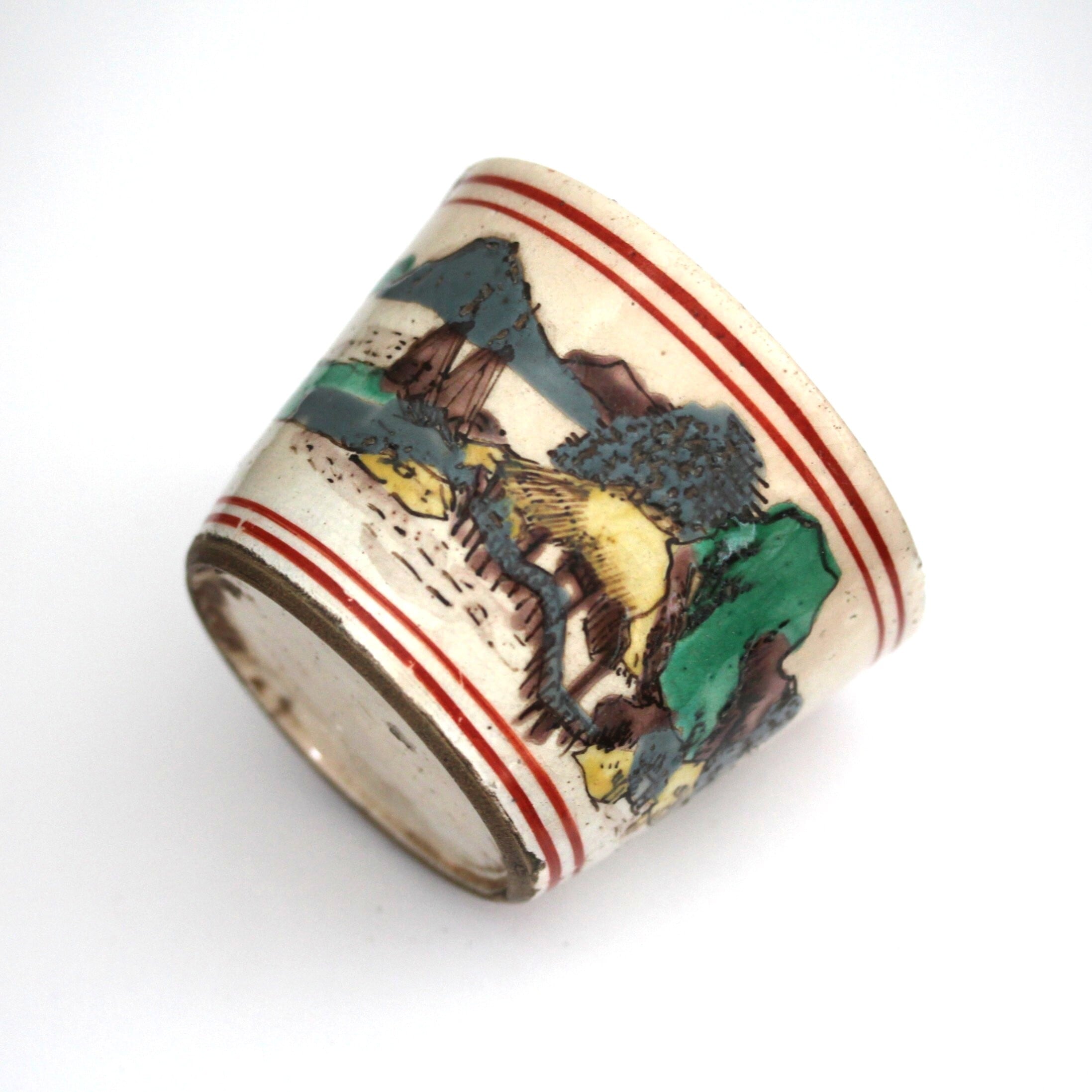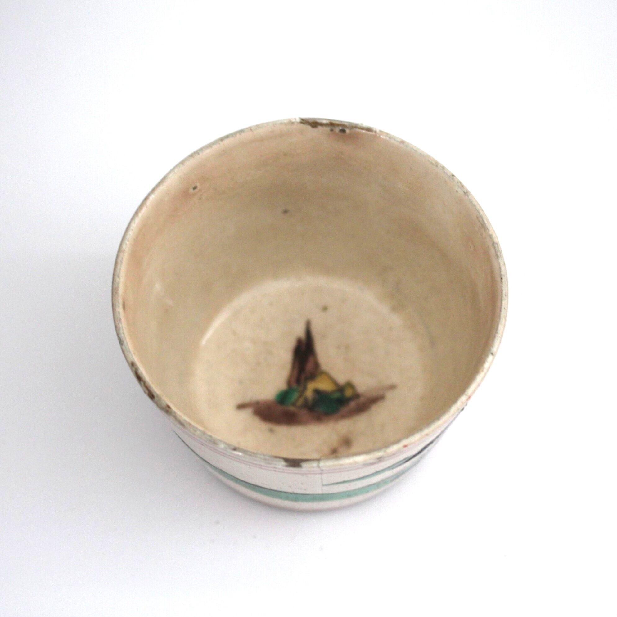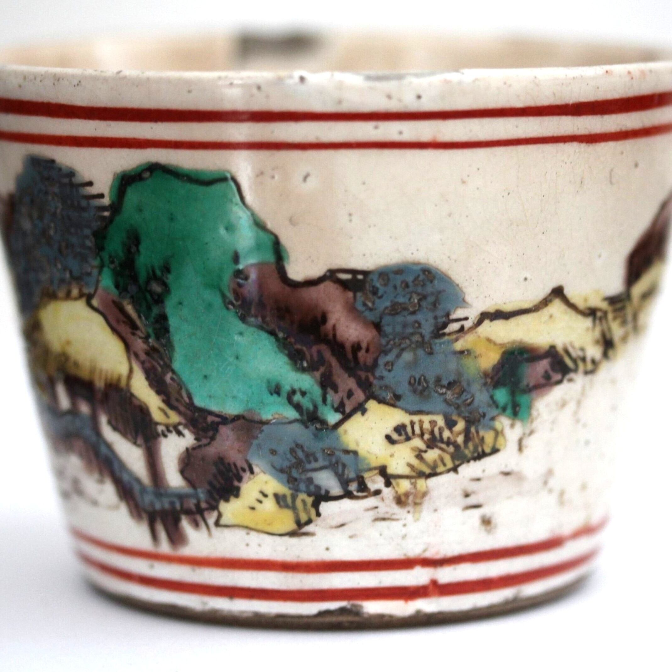A charming landscape designed ceramic cup. Seaside scenery is painted in color enamels on white slip.
