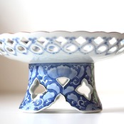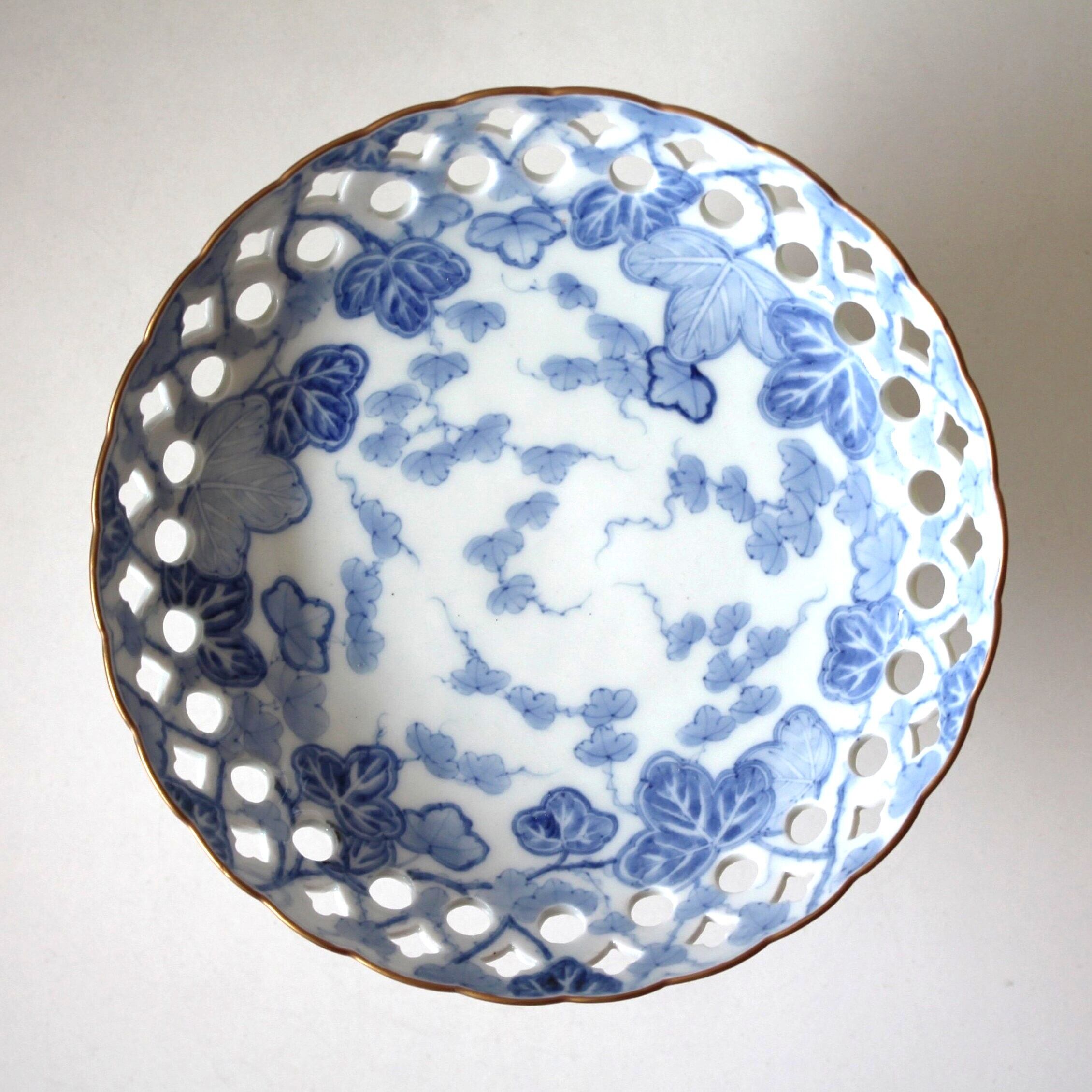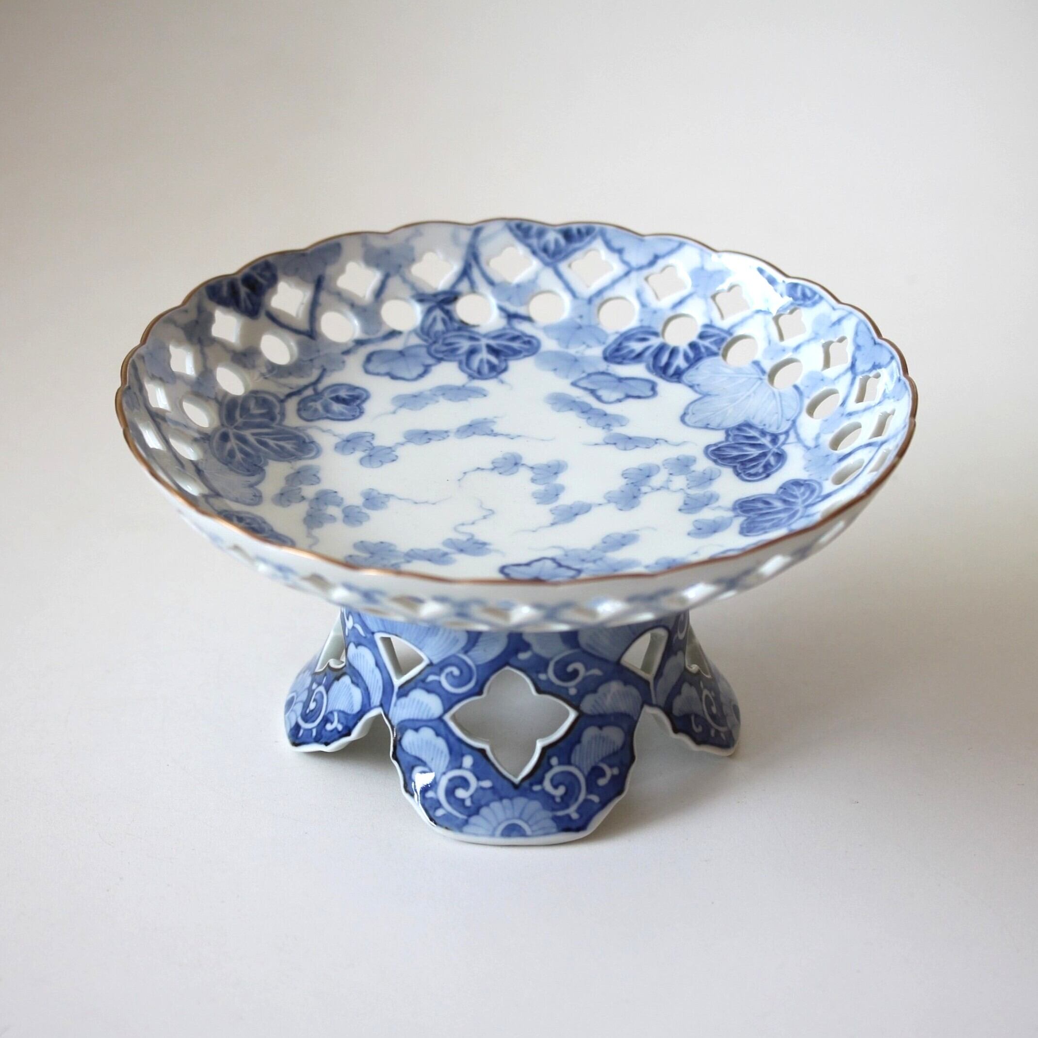 伊万里染付蔦瓔珞文輪花台鉢 d21.5cm Imari Blue and White Standed Dish with Openwork, Ivy Design a Enameled Vase, Design 19th-20th C | HANAFUDA