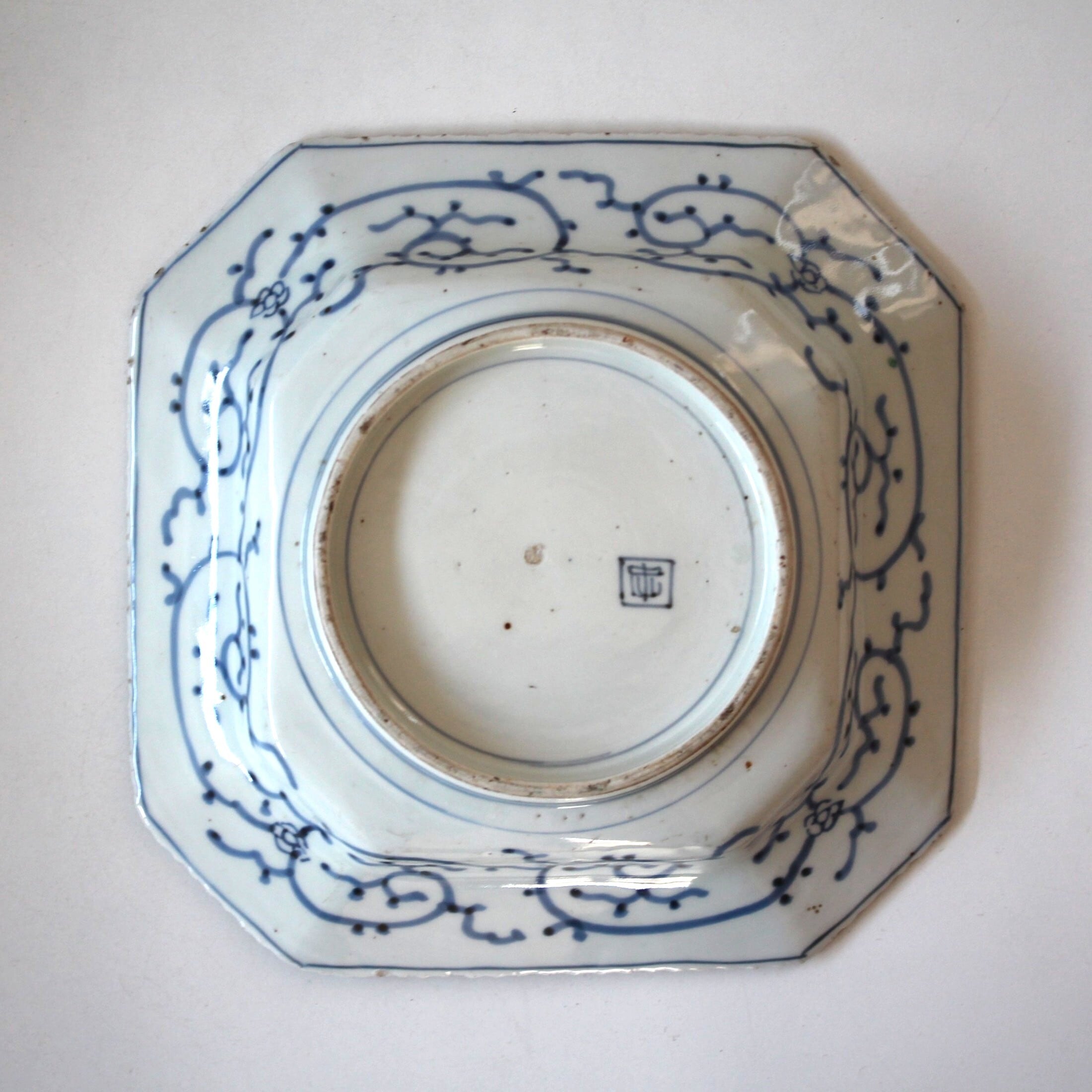 古伊万里色絵菊鳥文隅切額皿 d24.3cm Imari Polychrome Octagonal Dish, Design of Chrysanthemums and Bird 19th C | HANAFUDA