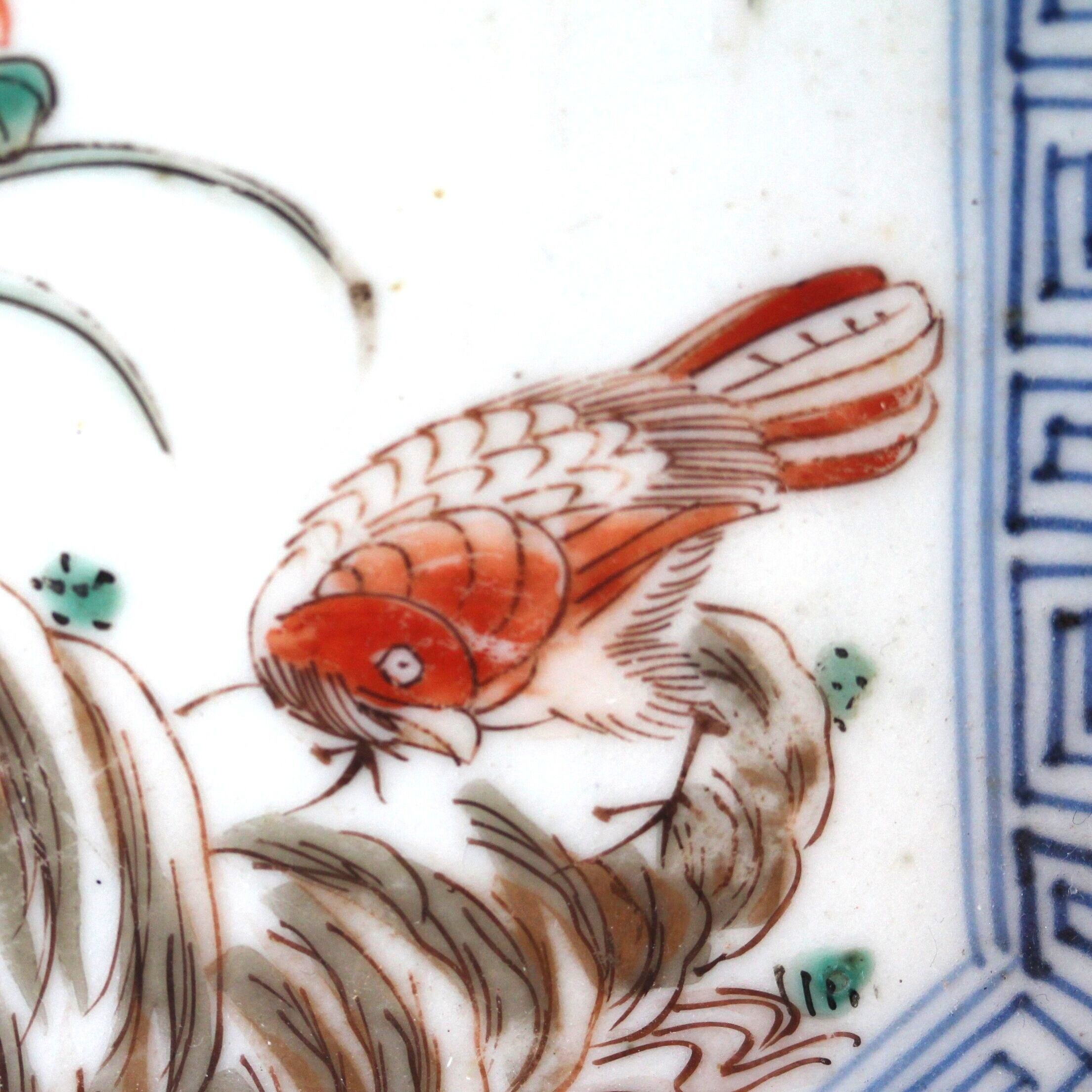 A charming polychrome porcelain octagonal plate, with design of chrysanthemums and a bird. Chinese scholars are painted around. Playing Go and drawing a picture are two of the four arts of Chinese scholars.