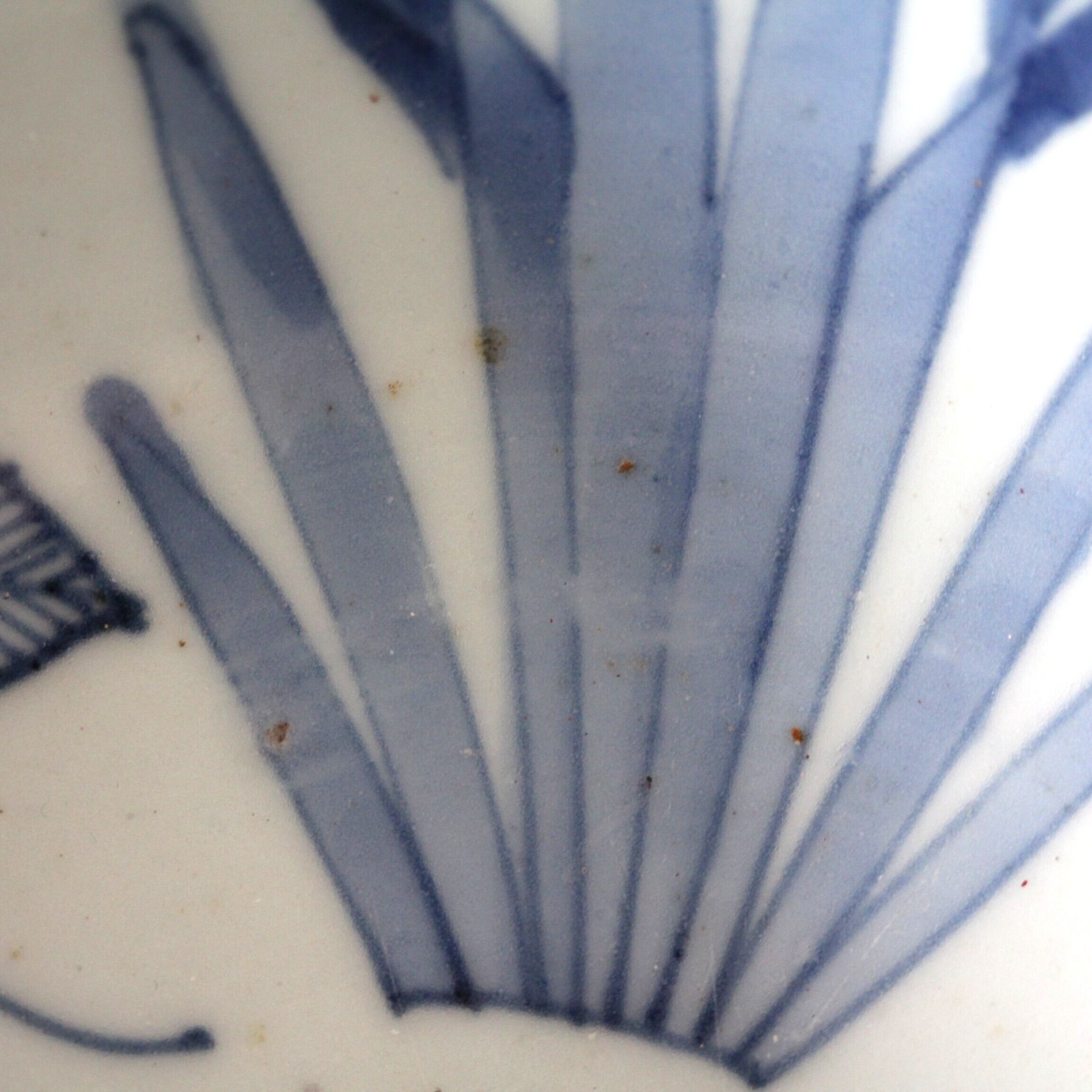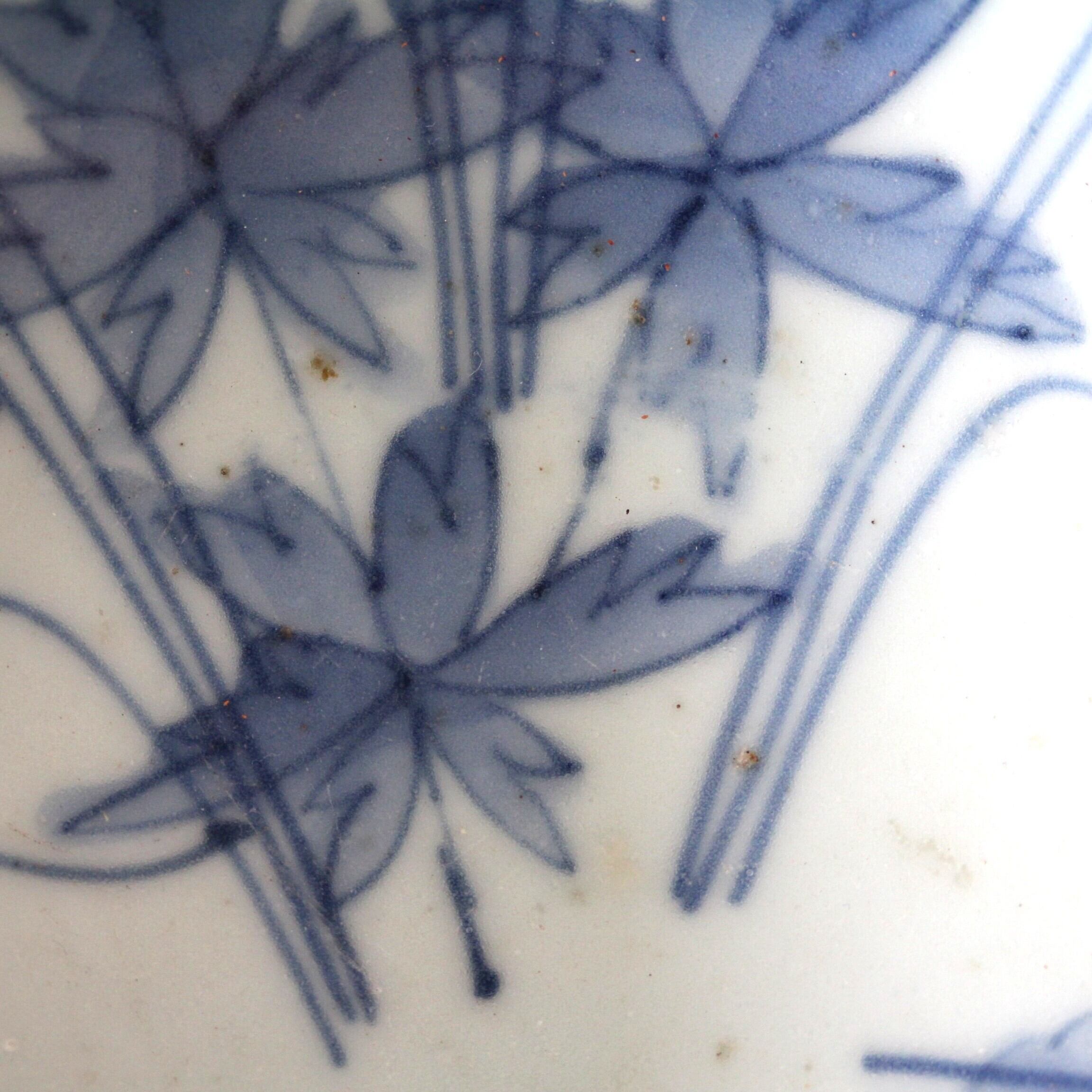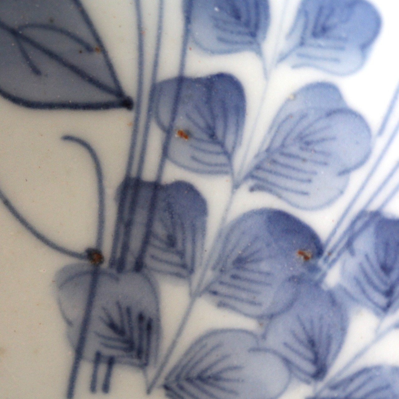 草花をモチーフとした深みのある染付のうつわで、花と葉とが交互に描かれています。