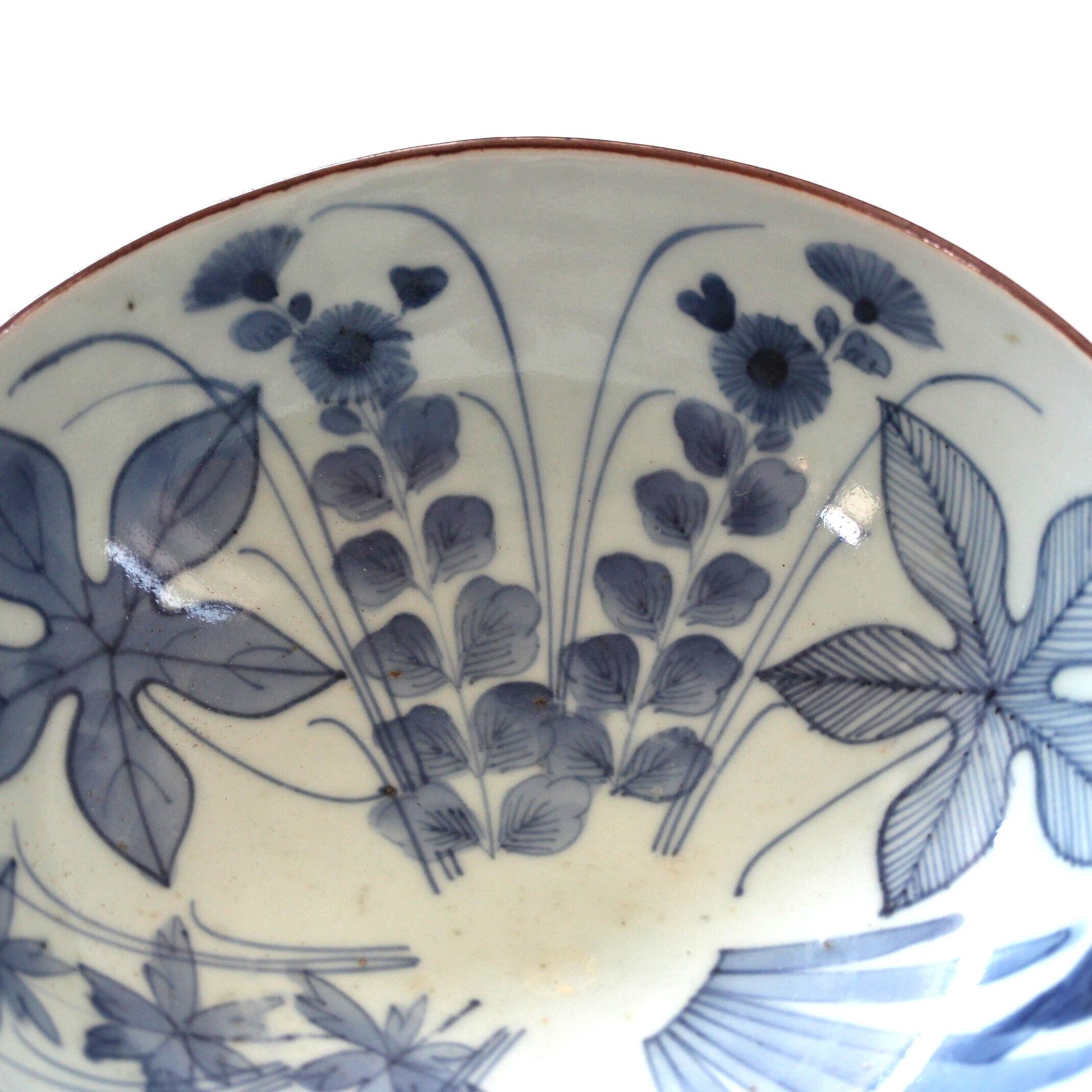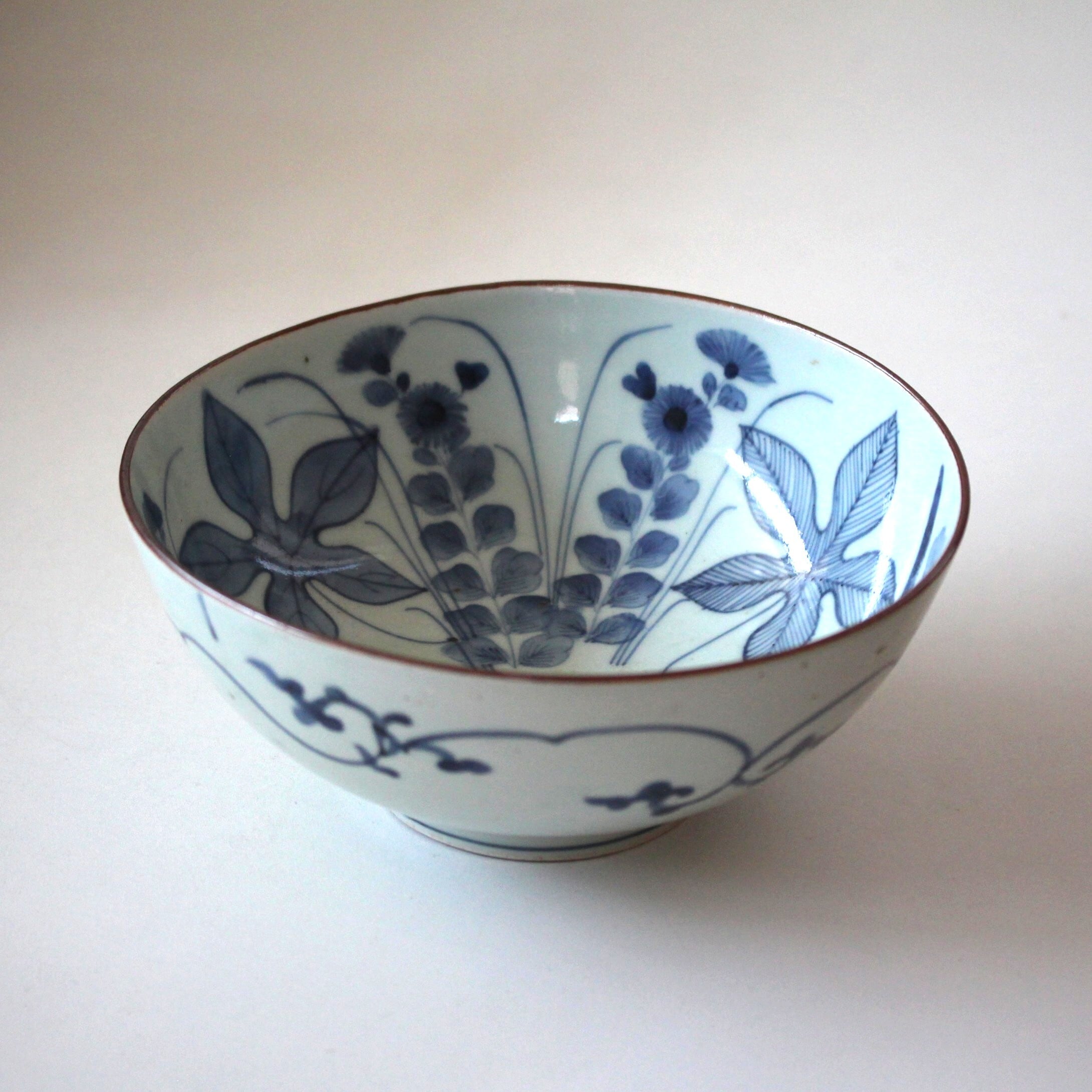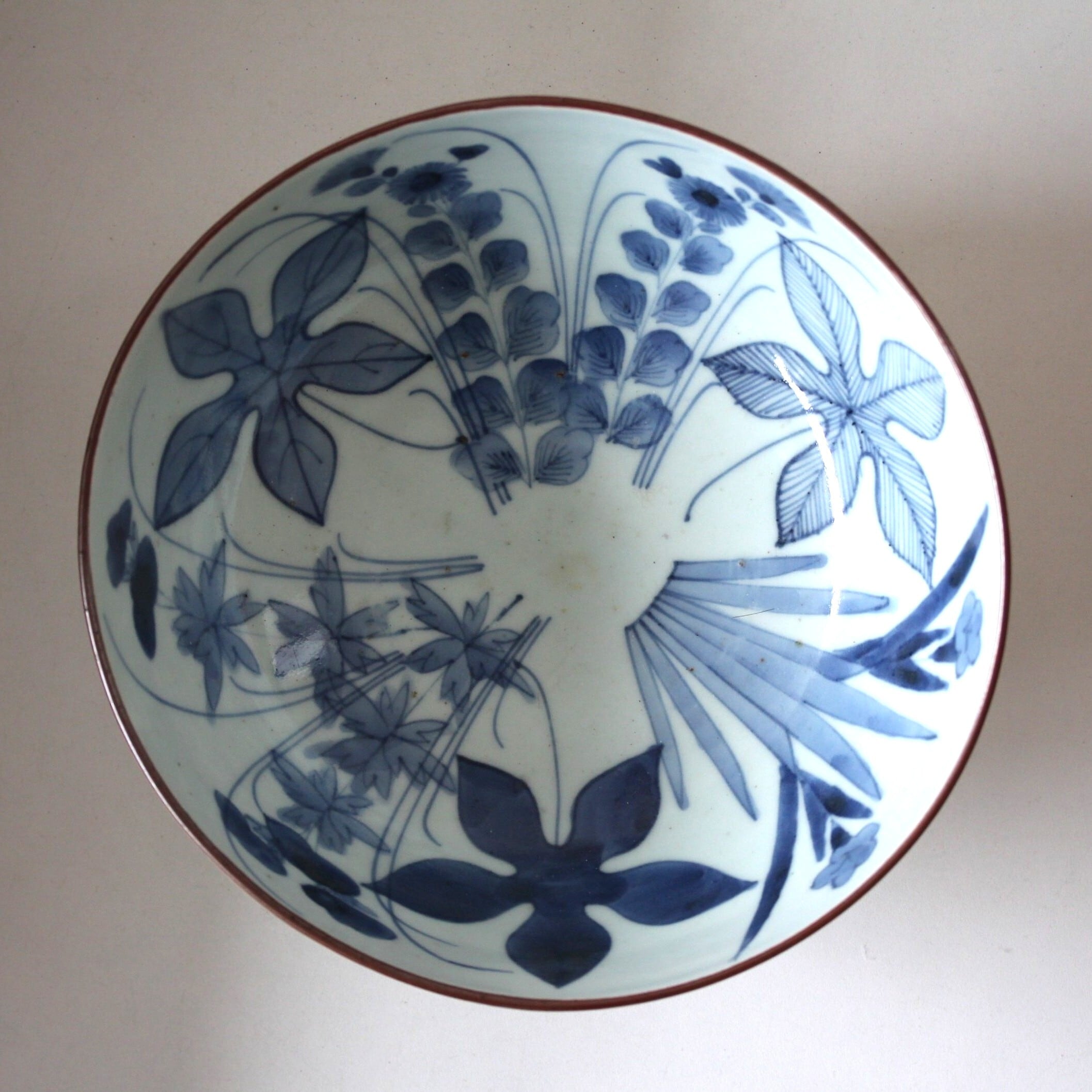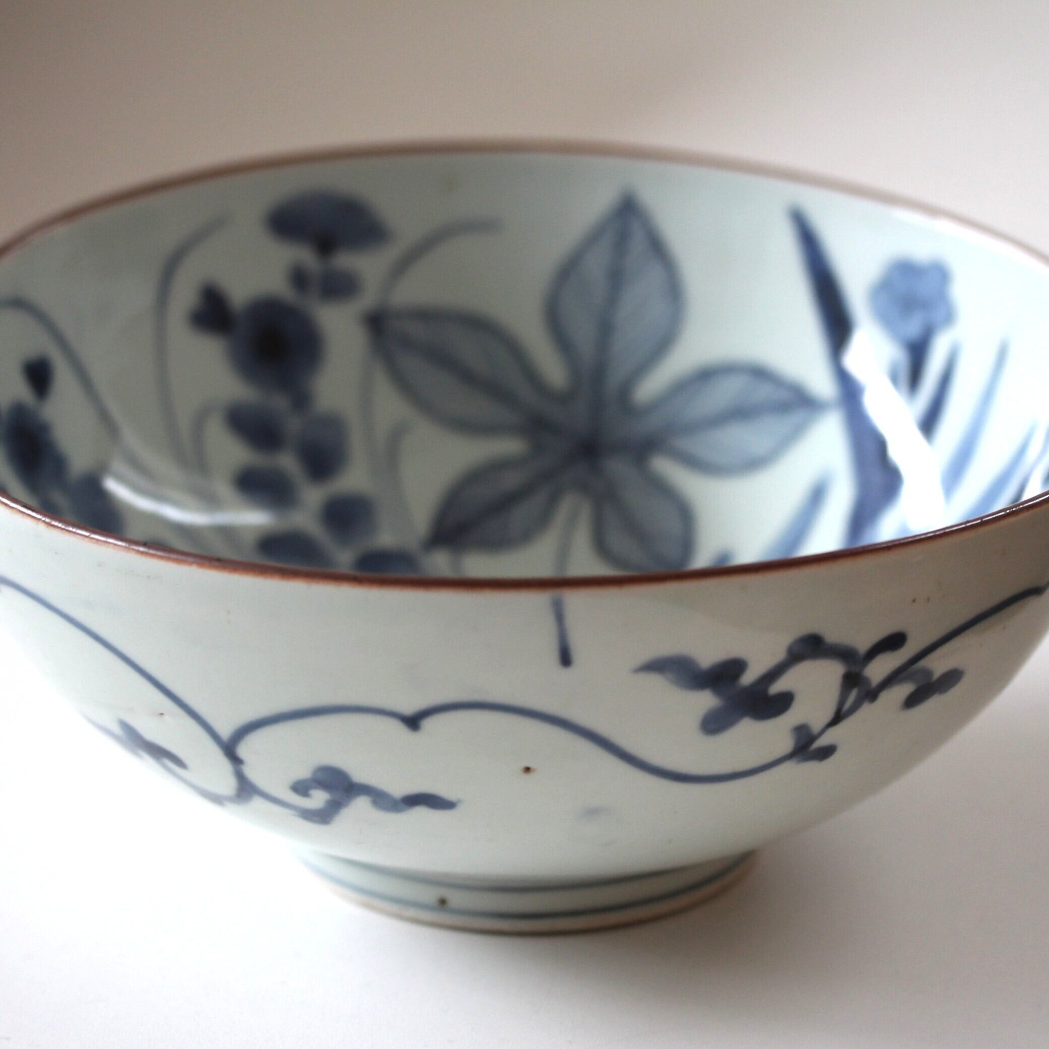 A charming blue and white porcelain bowl with design of flowers and leaves. Synmetry might be considered. Supposedly, chrysanthemums, daffodils, and fujibakama thoroughwort, as flowers and yatsude fatsia japonica as leaves.