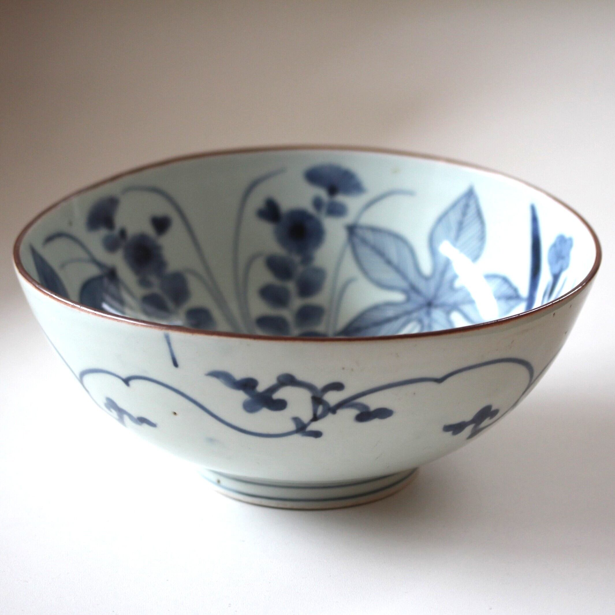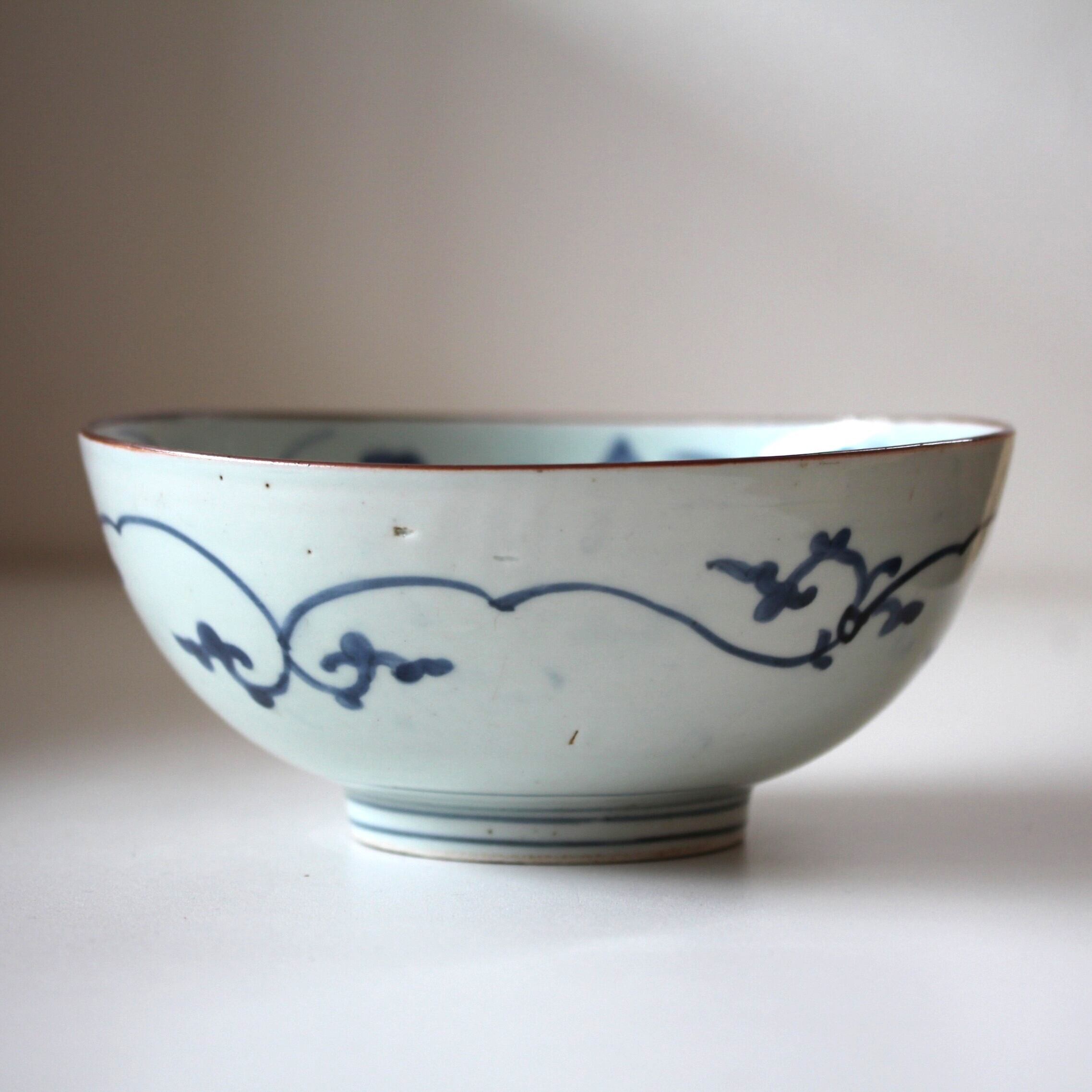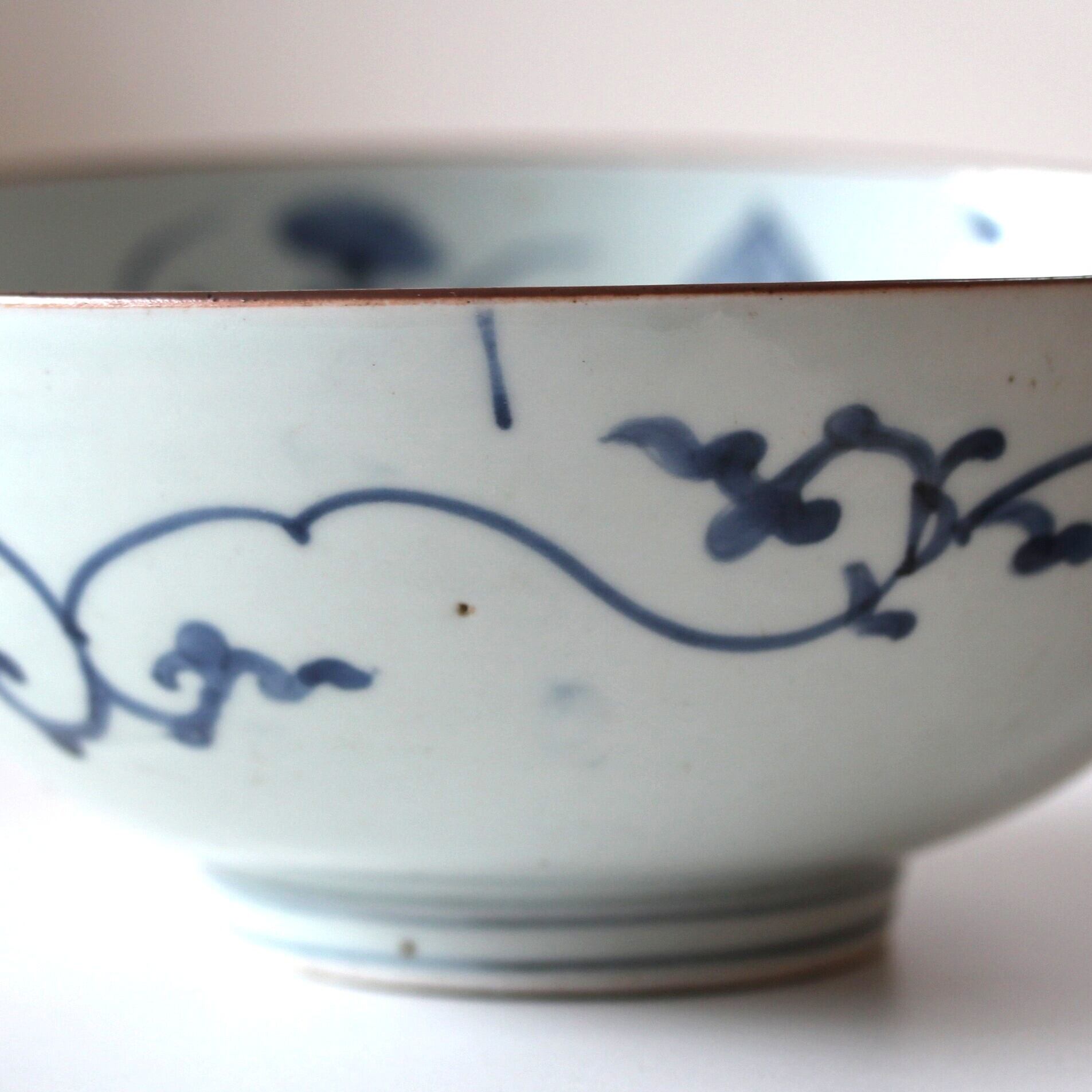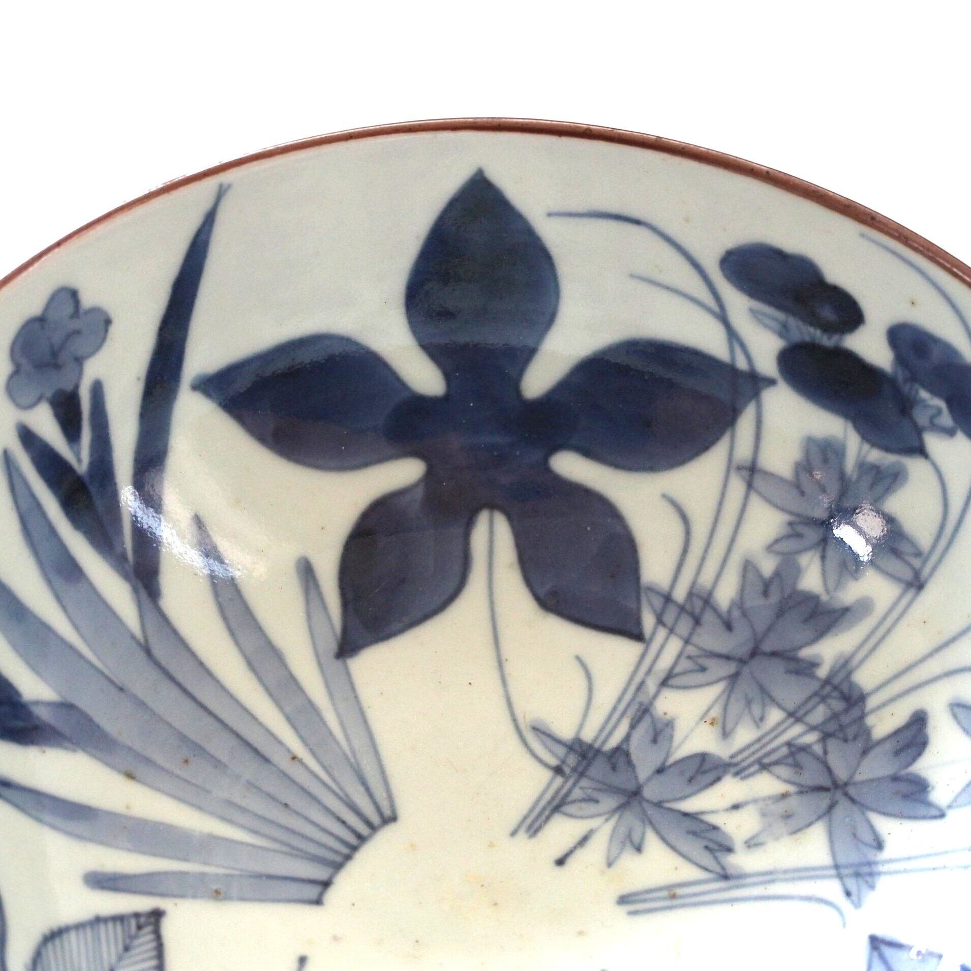 A charming blue and white porcelain bowl with design of flowers and leaves. Synmetry might be considered. Supposedly, chrysanthemums, daffodils, and fujibakama thoroughwort, as flowers and yatsude fatsia japonica as leaves.