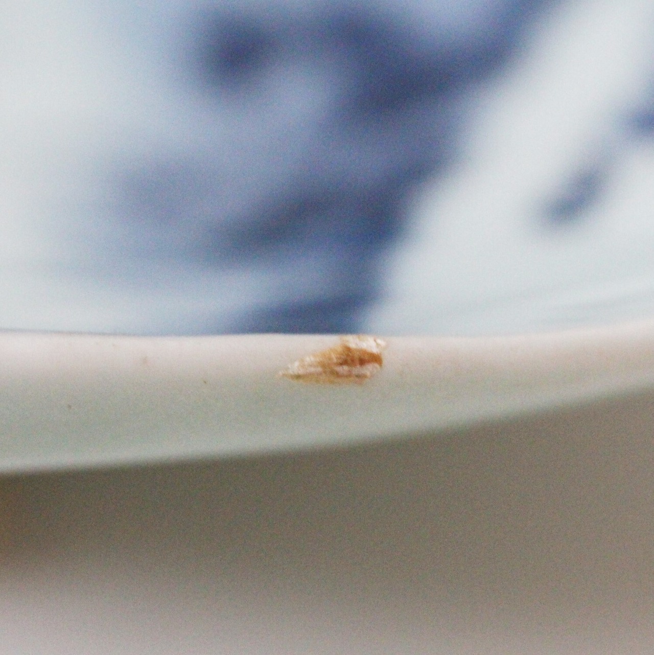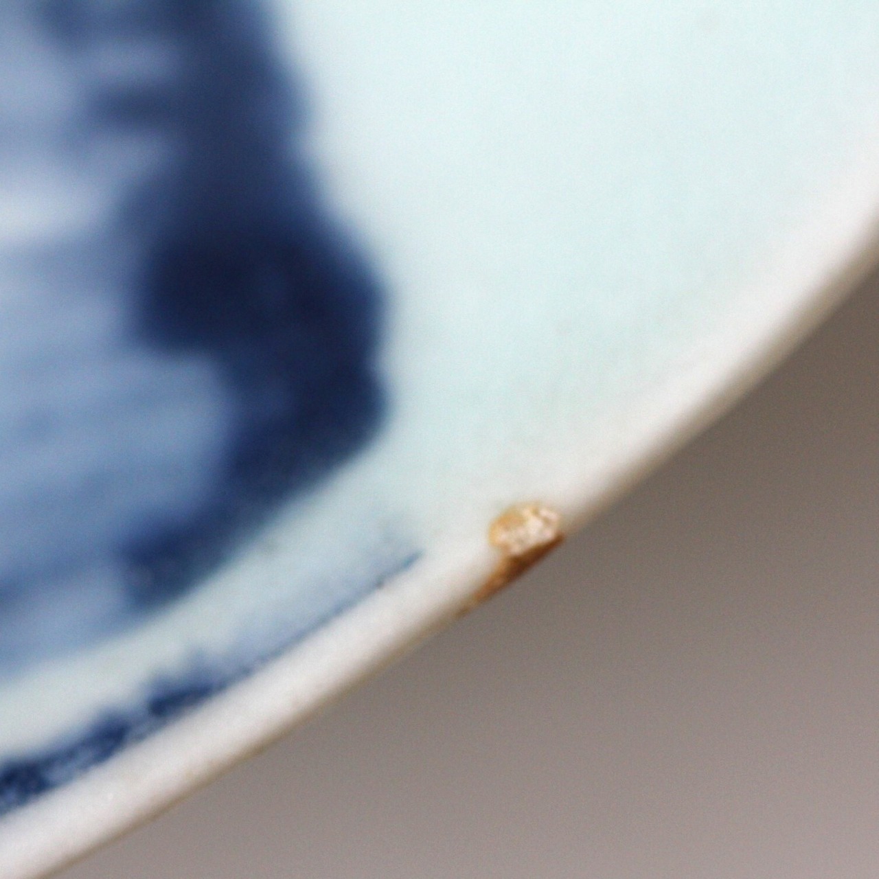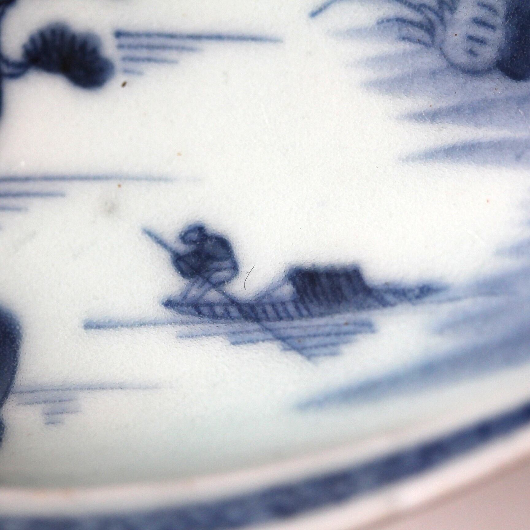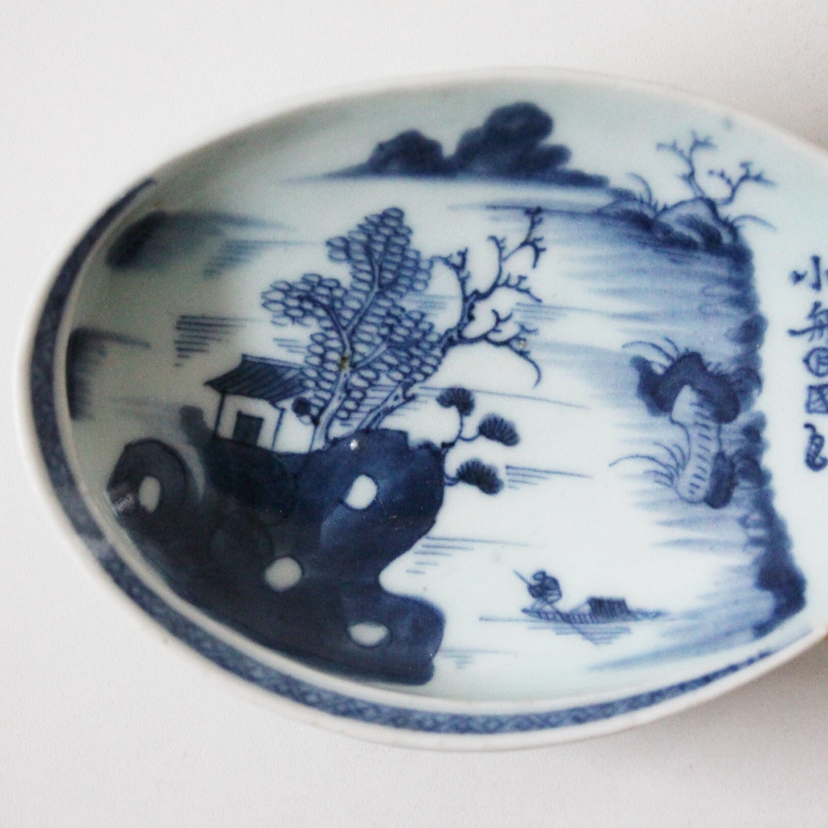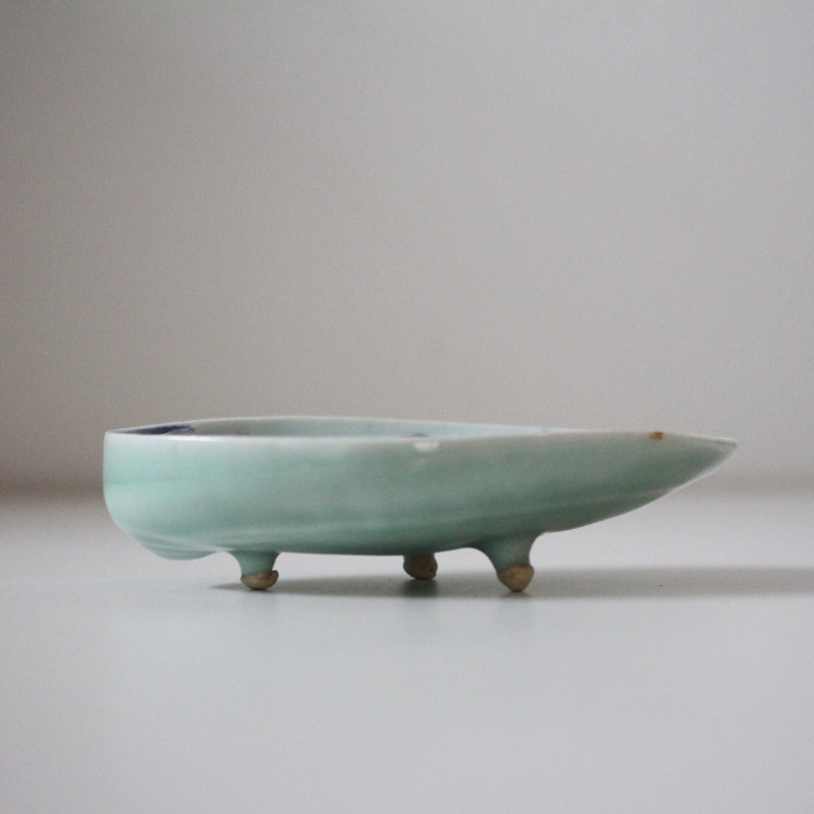 新渡染付青磁山水文鮑形三足向付 d14.7cm Blue and White Celadon Abalone Shaped Three Footed Dish, Landscape Design 18th-19th C | HANAFUDA