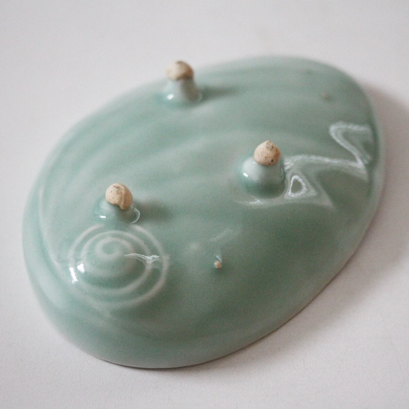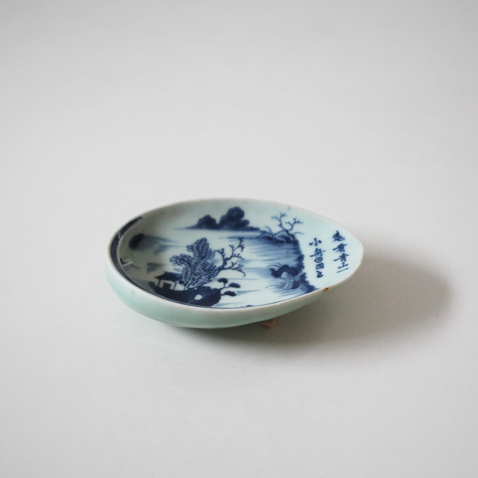 A charming abolone shaped mukozuke dish with three legs. Landscape design with Chinese poem on the front side, and celadon glaze on the backside.