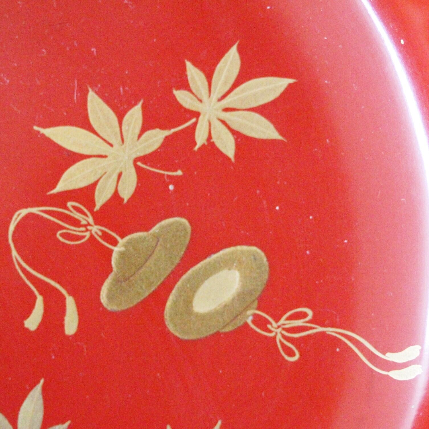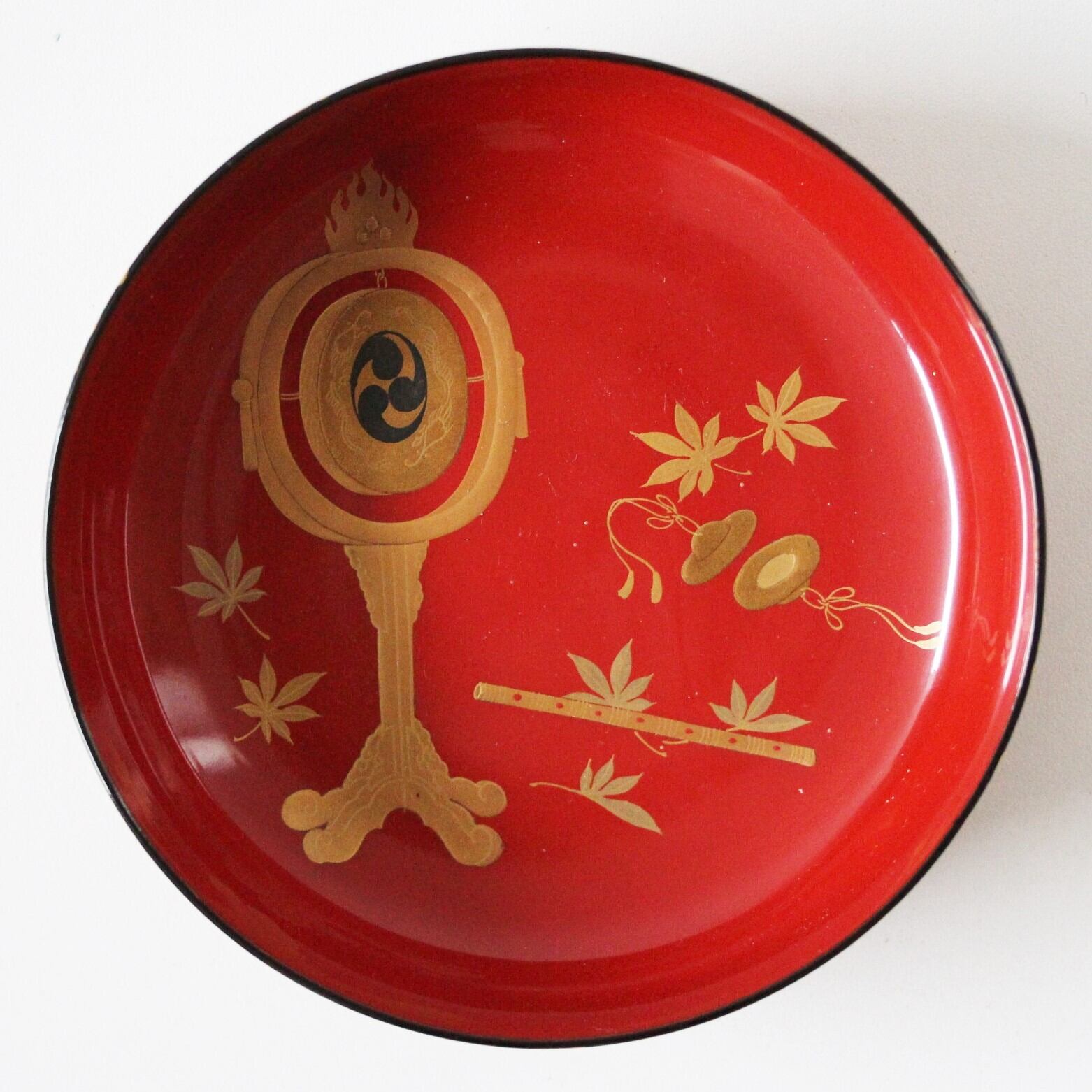 A gorgeous red lacquered wooden dish with design of gagaku musical instruments. Gagaku is the traditional Japanese court dance and music.