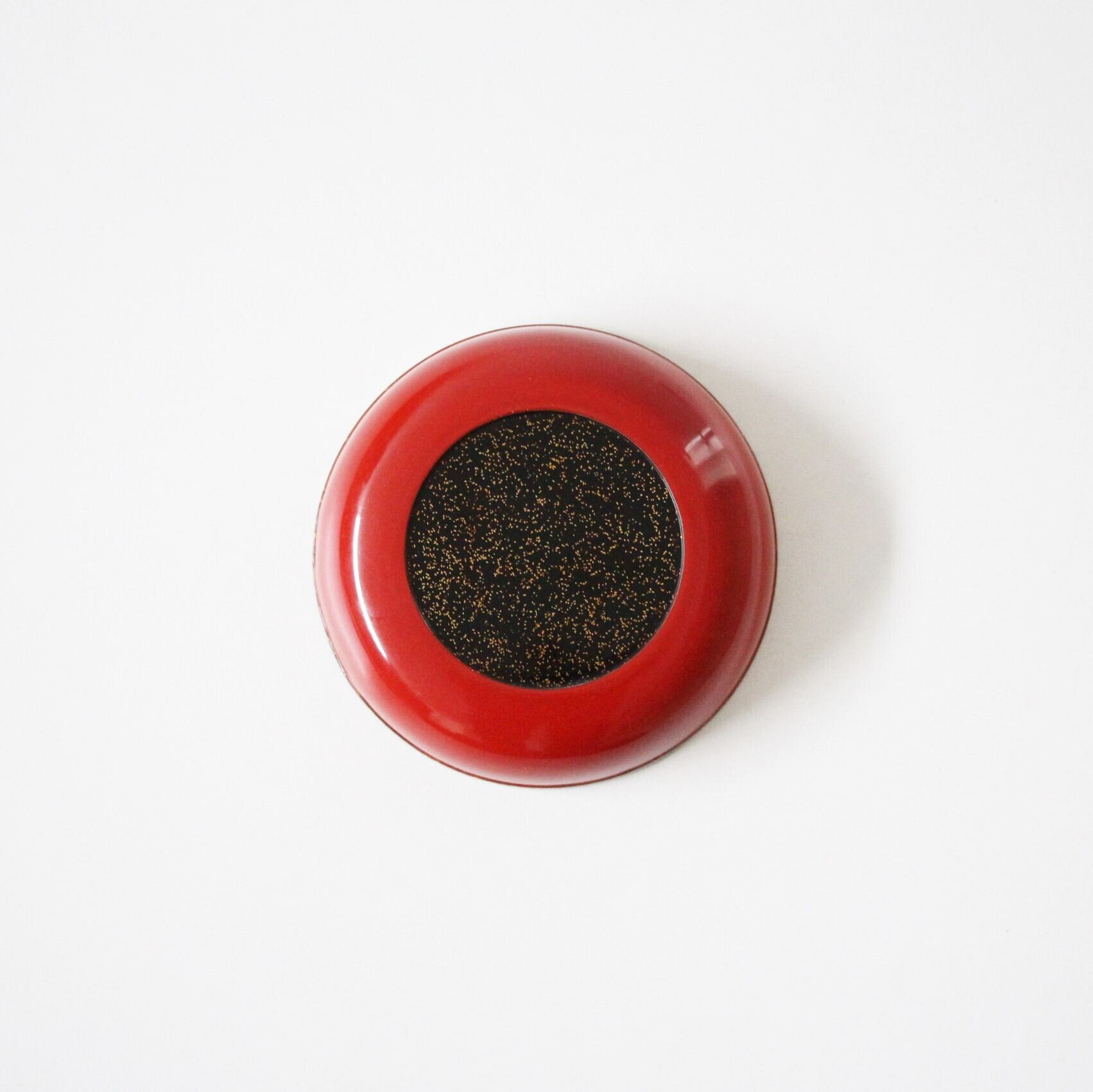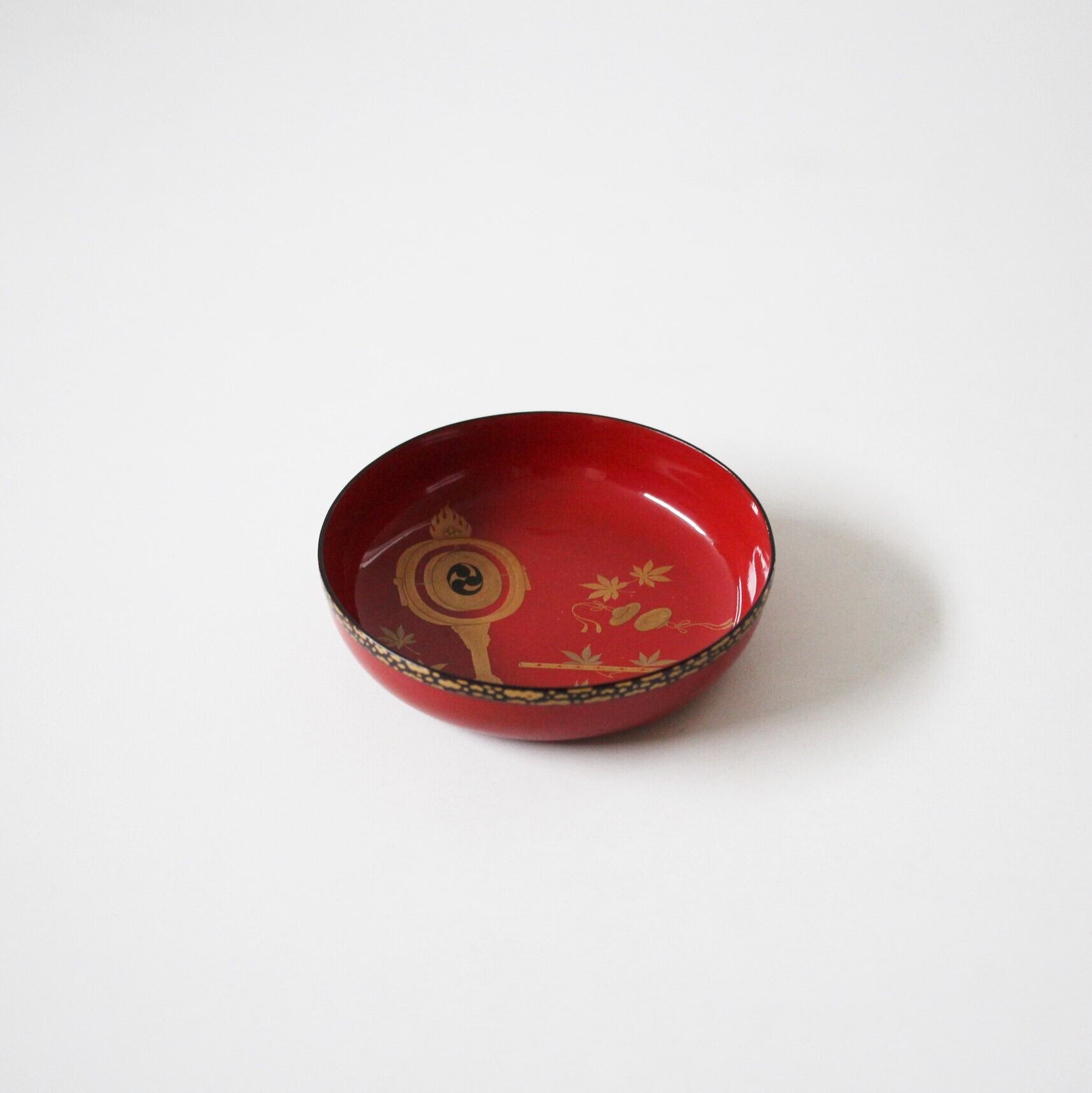 蒔絵雅楽器文木皿(その1)d11.9cm Red and Black Lacquered Wooden Small Dish, Design of Musical Instruments in Gold Makie 19th-20th C | HANAFUDA