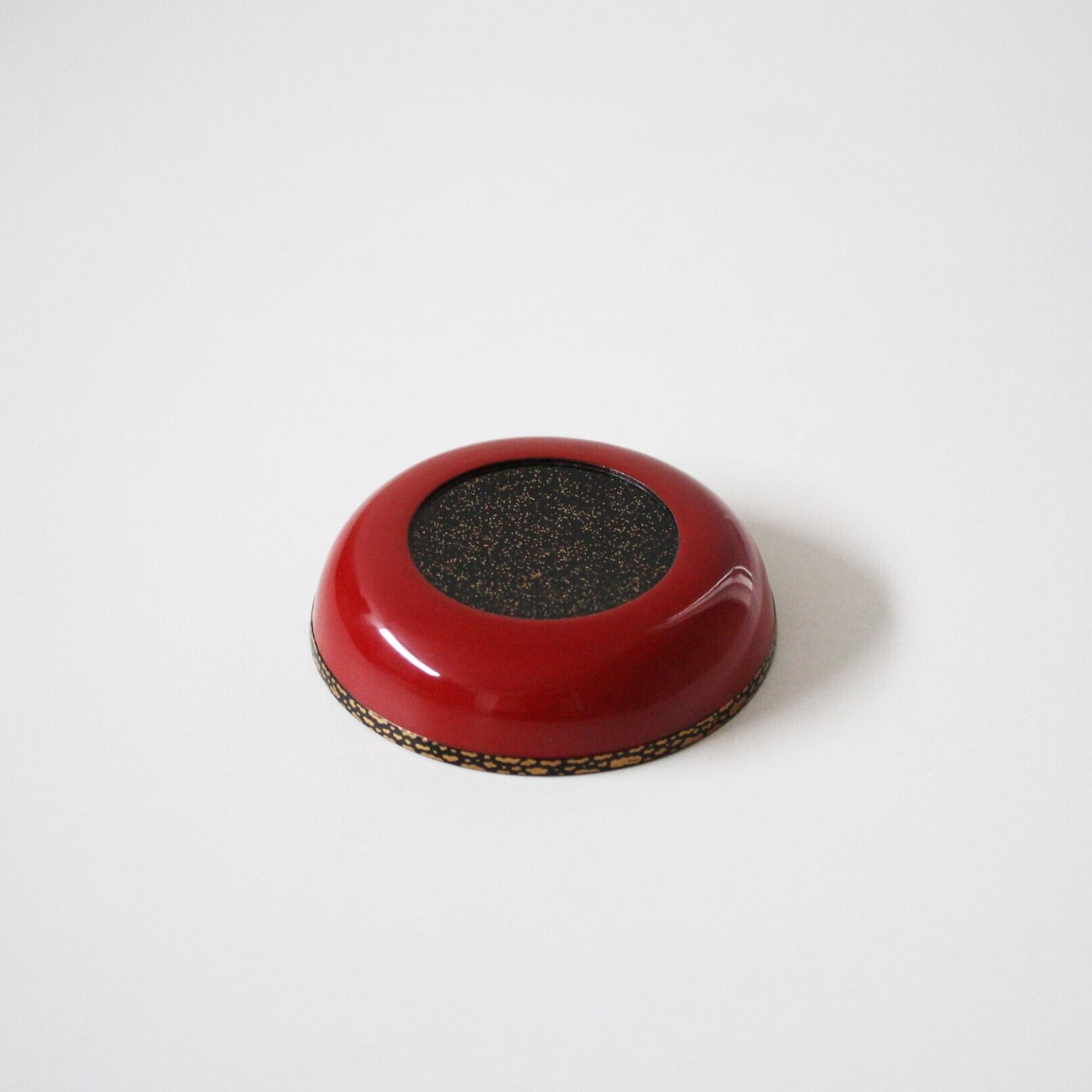 蒔絵雅楽器文木皿(その2)d11.9cm Red and Black Lacquered Wooden Small Dish, Design of Musical Instruments in Gold Makie 19th-20th C | HANAFUDA