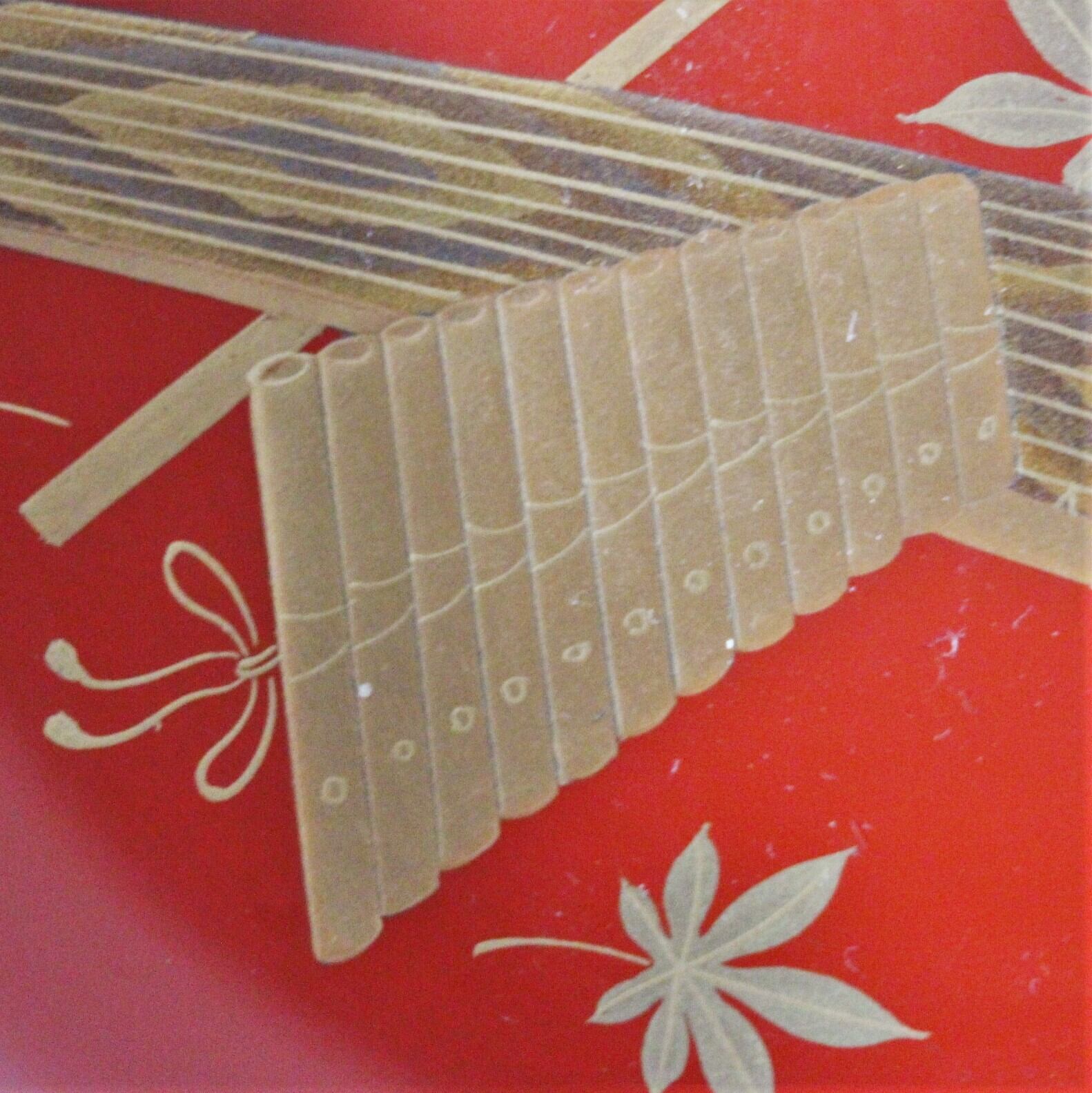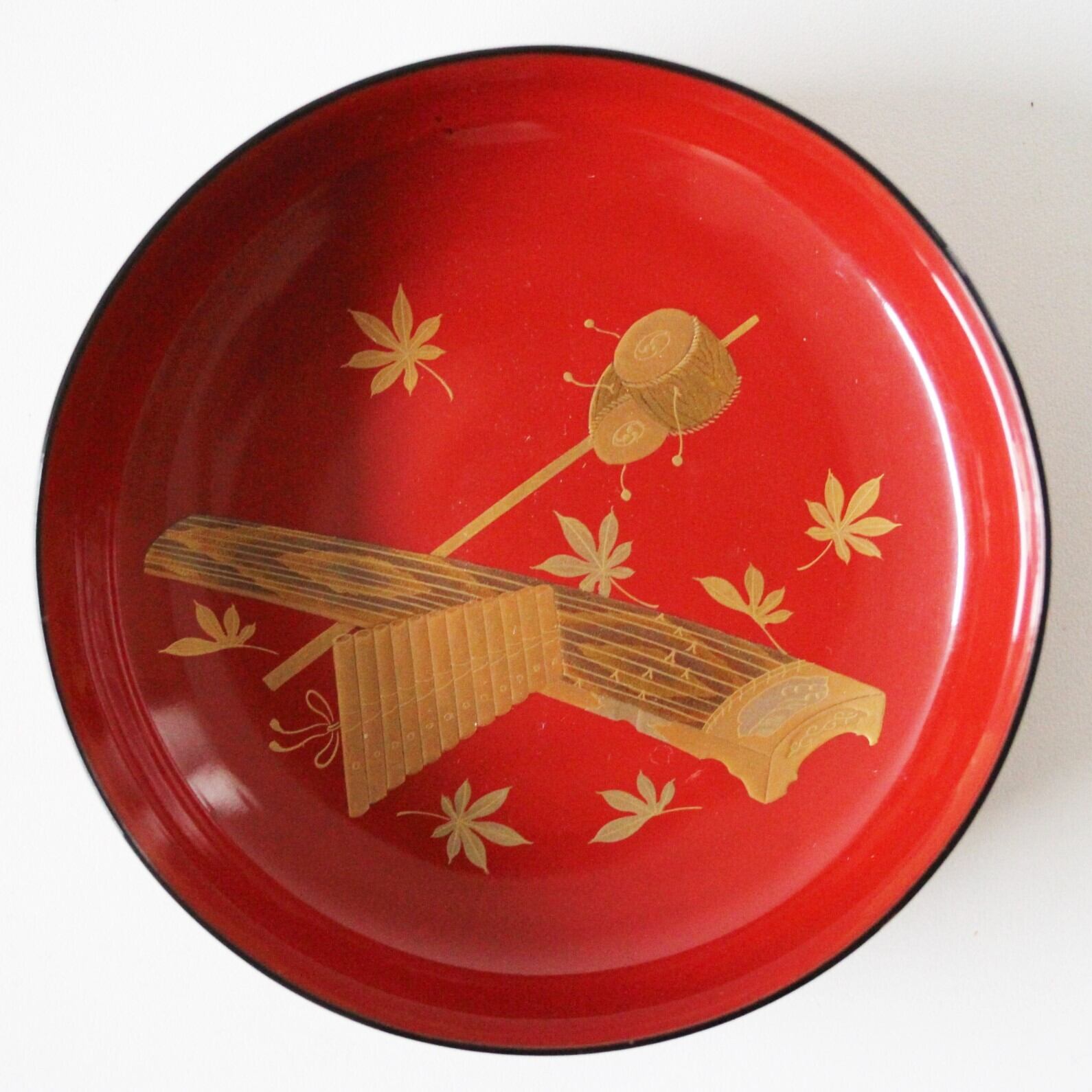 A gorgeous red lacquered wooden dish with design of gagaku musical instruments. Gagaku is the traditional Japanese court dance and music.