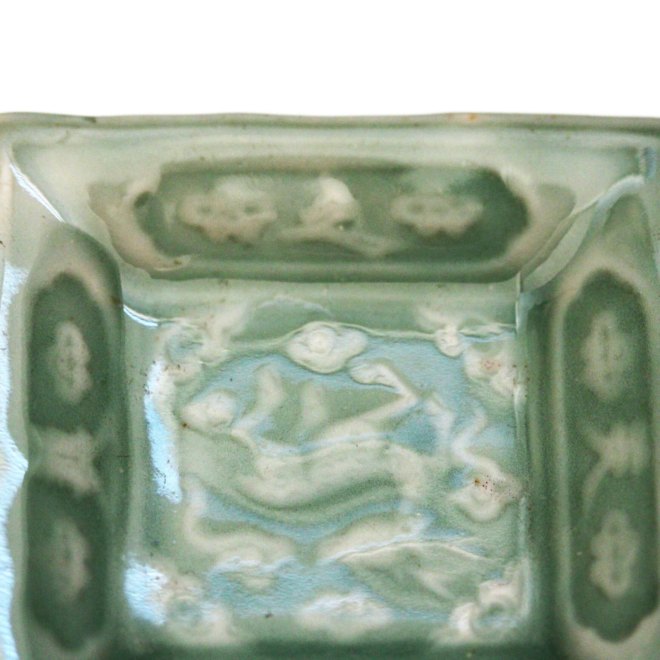 A charming celadon square small plate, with embossed design of a deer in the center. Around the deer four Chinese characters are embossed, which mean "Wine is Heaven's boon to man.".