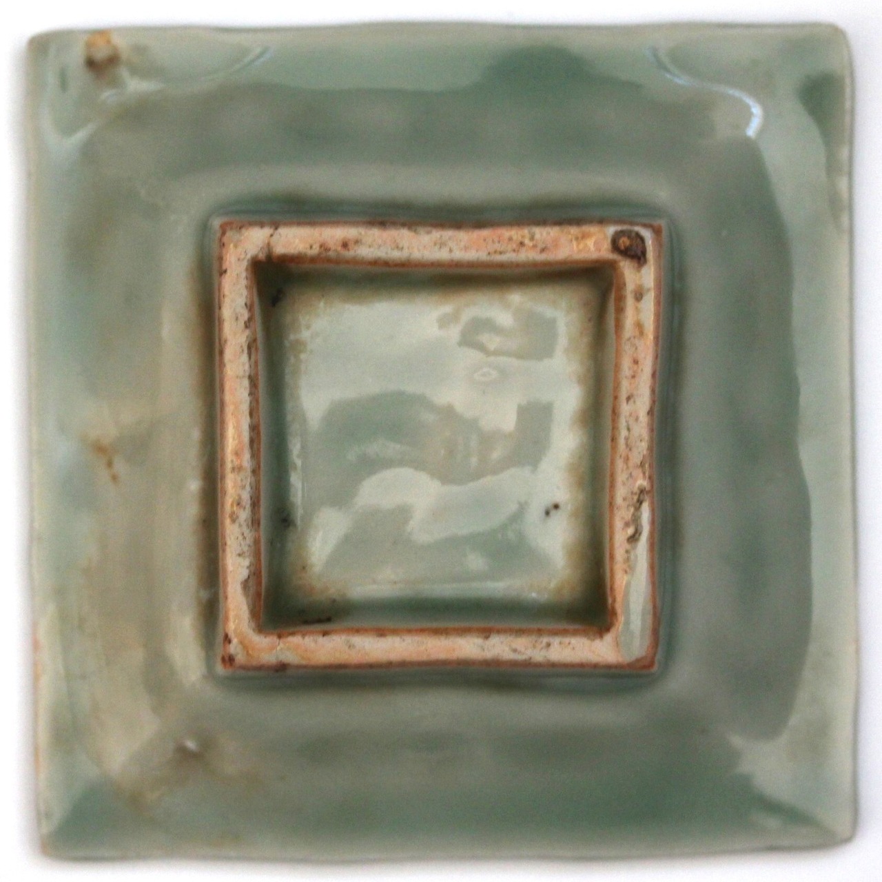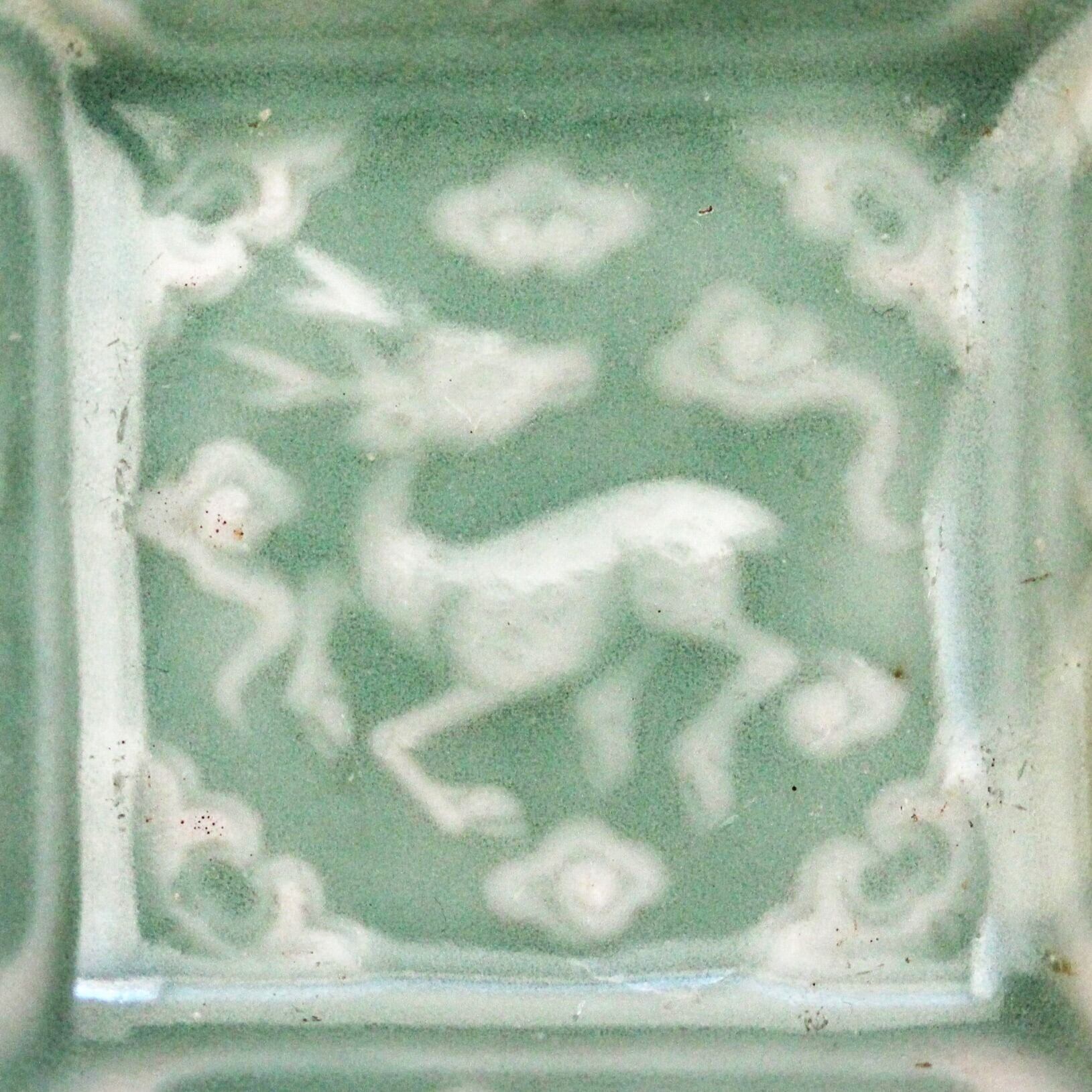 三田青磁陽刻「天之美禄」文角豆皿(その1)d7.4cm Sanda Celadon Square Small Dish, Embossed Design of Deer and Four Chinese Characters 19th C | HANAFUDA