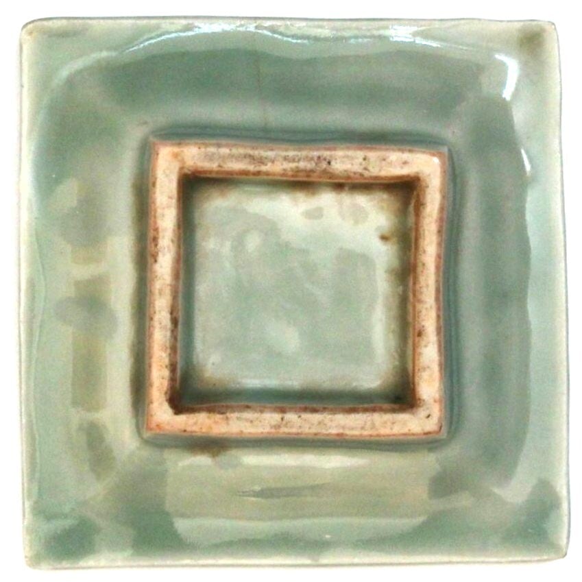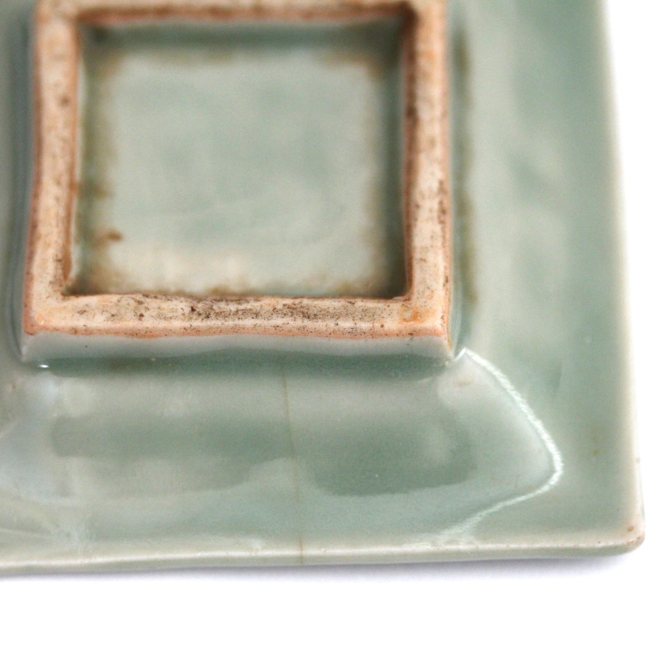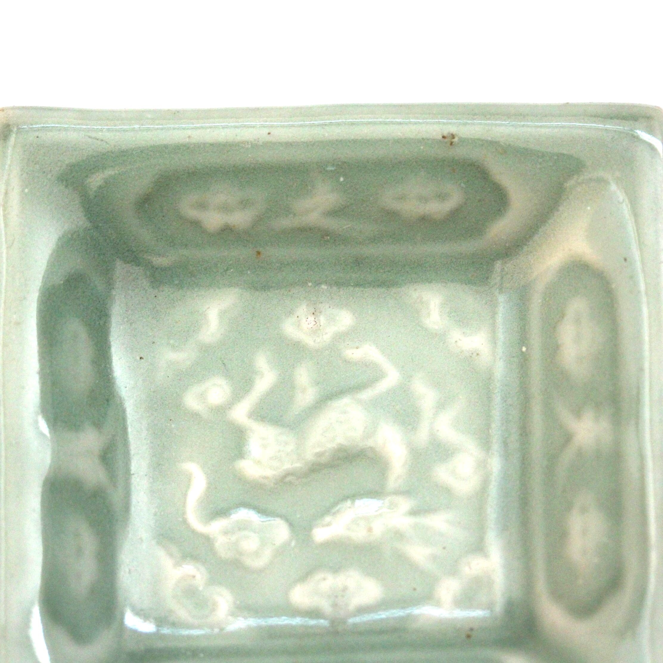 三田青磁陽刻「天之美禄」文角豆皿(その7)d7.4cm Sanda Celadon Square Small Dish, Embossed Design of Deer and Four Chinese Characters 19th C | HANAFUDA