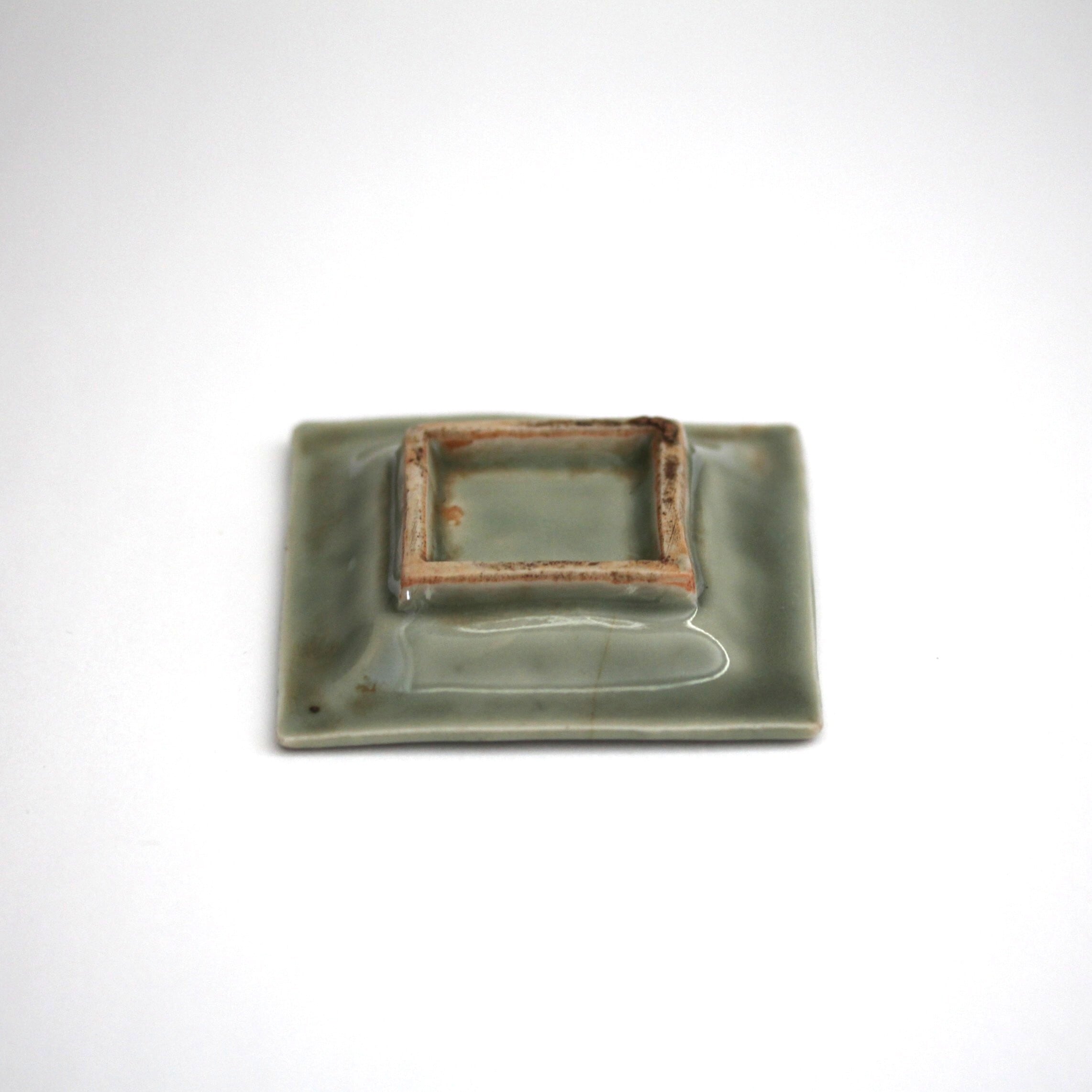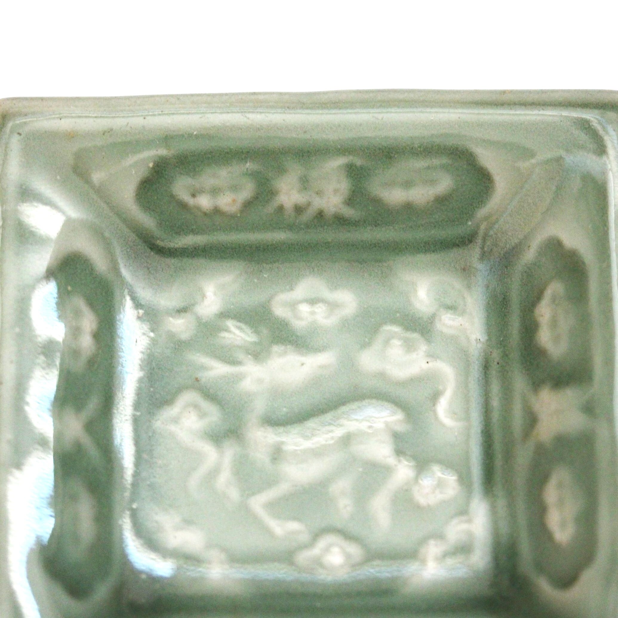 三田青磁陽刻「天之美禄」文角豆皿(その8)d7.4cm Sanda Celadon Square Small Dish, Embossed Design of Deer and Four Chinese Characters 19th C | HANAFUDA