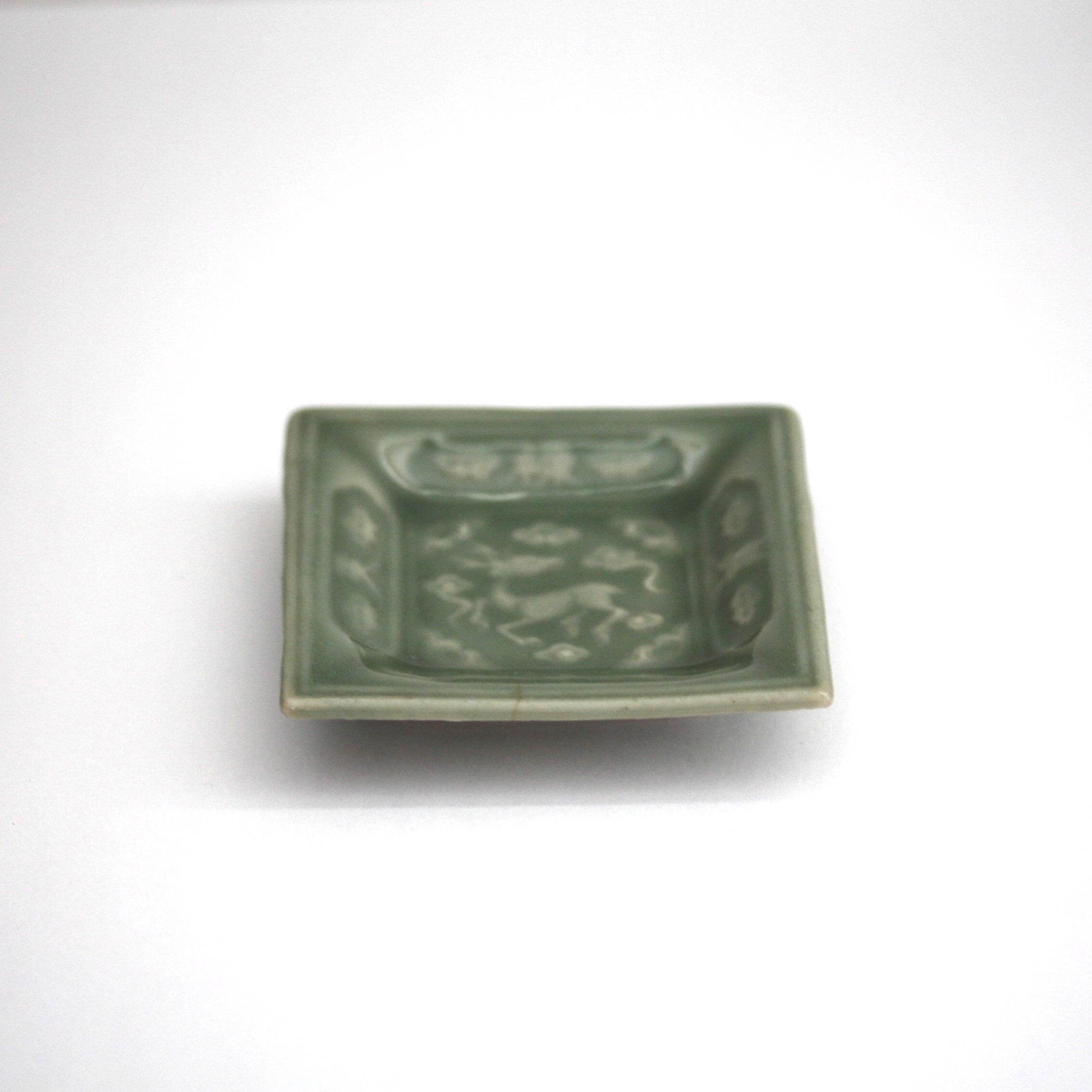 A charming celadon square small plate, with embossed design of a deer in the center. Around the deer four Chinese characters are embossed, which mean "Wine is Heaven's boon to man.".