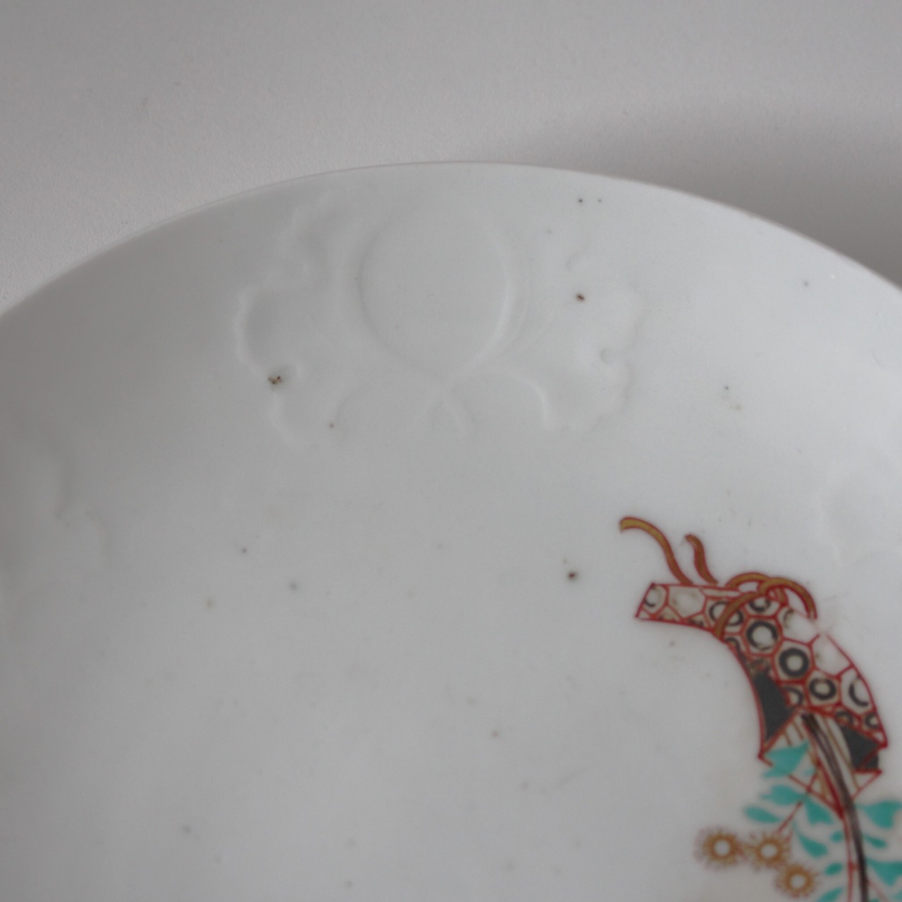 A beautiful enameled dish, with design of hana-noshi, or flowers in noshi wrapping paper in overglaze enamels, gold and silver.
