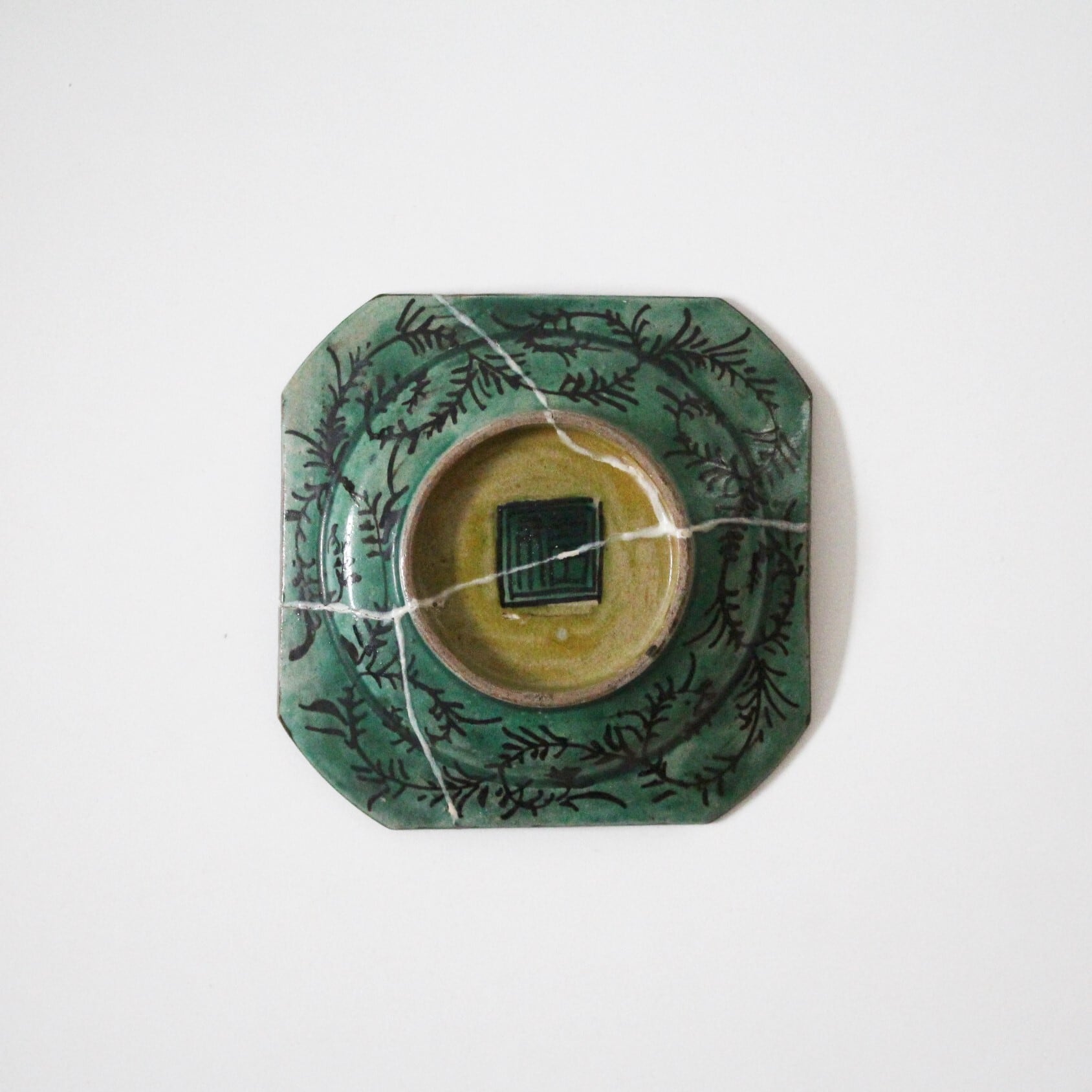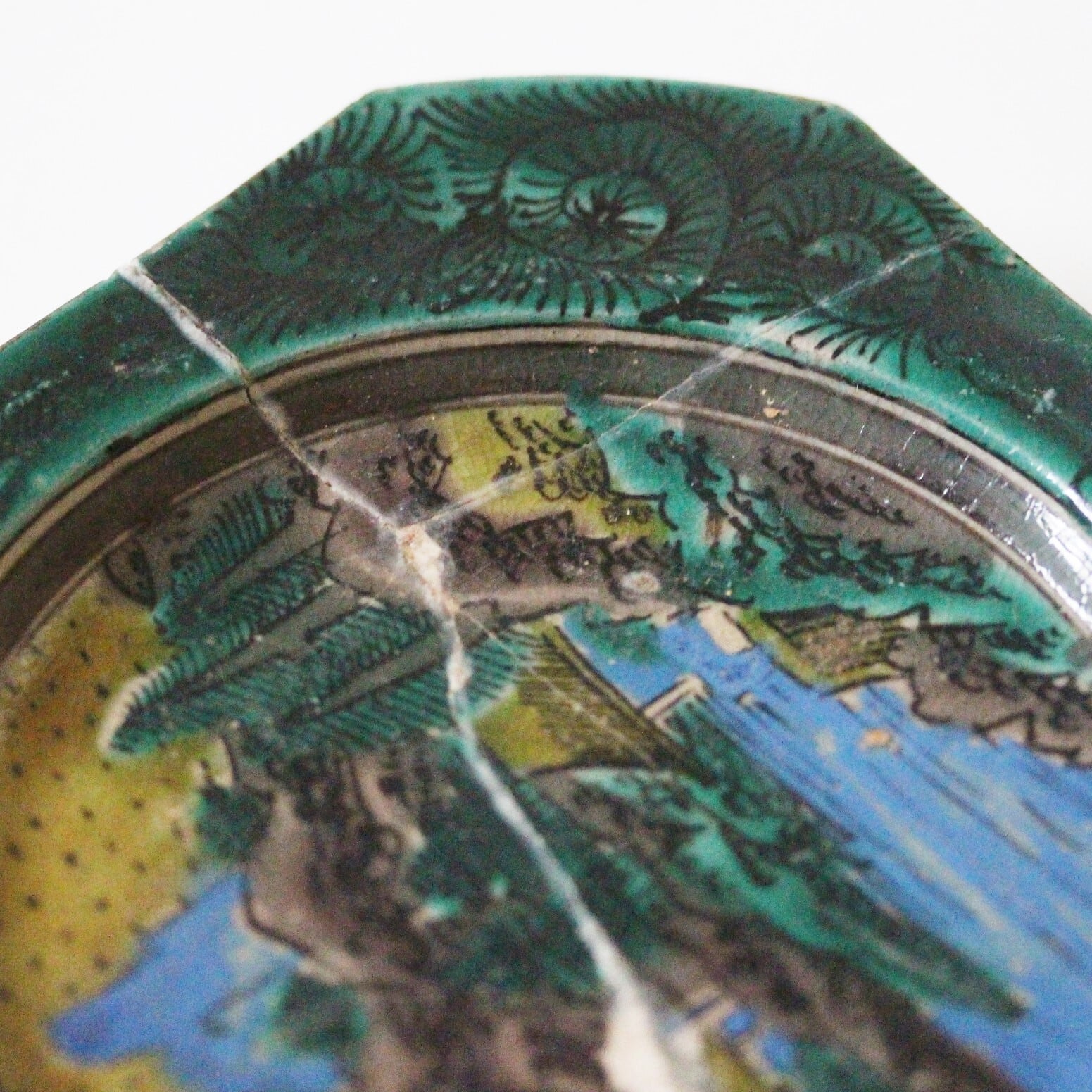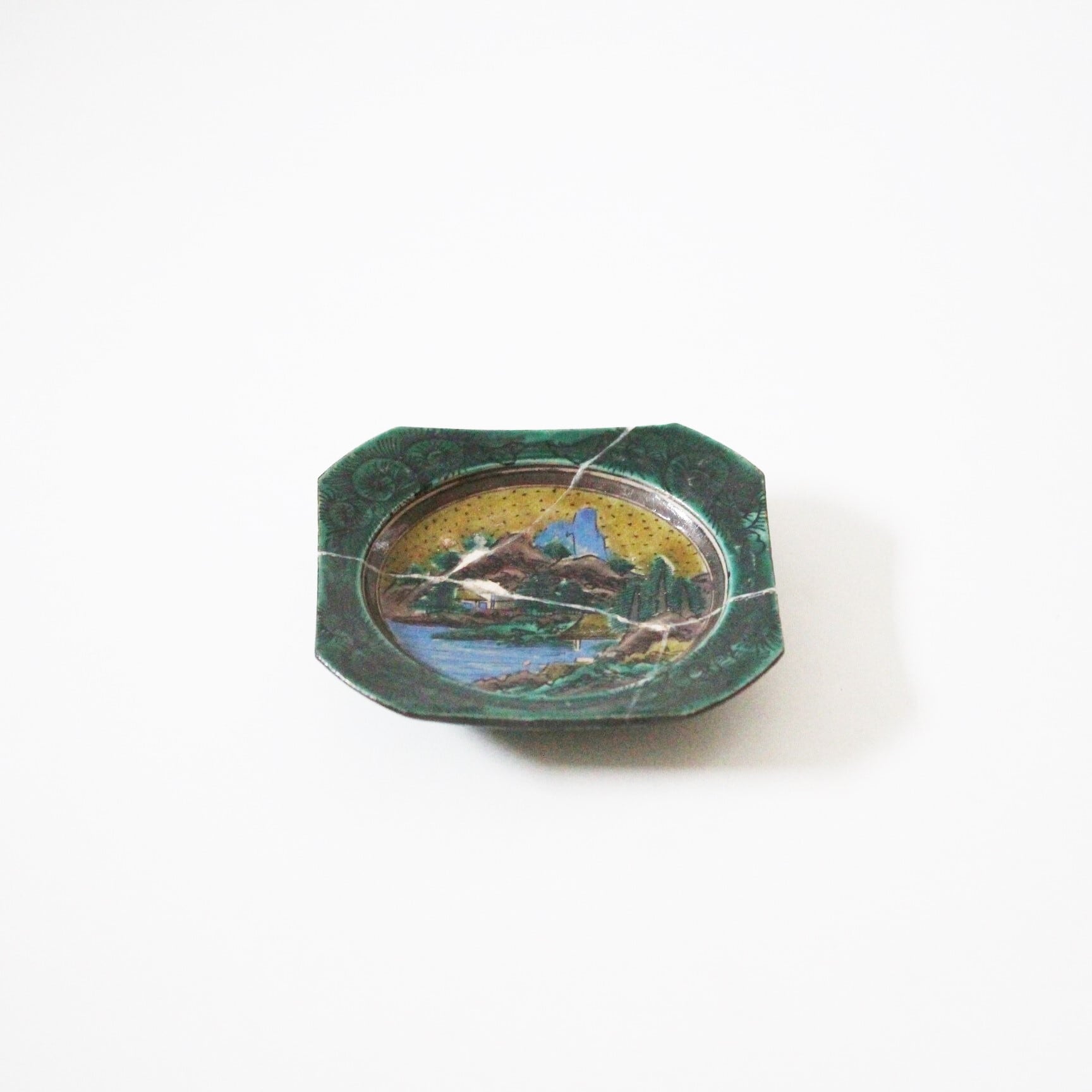 青九谷山水文隅切皿 d12.7cm Kutani Enameled Square Dish with Cut-Off Corners, Landscape Design 19th C | HANAFUDA