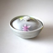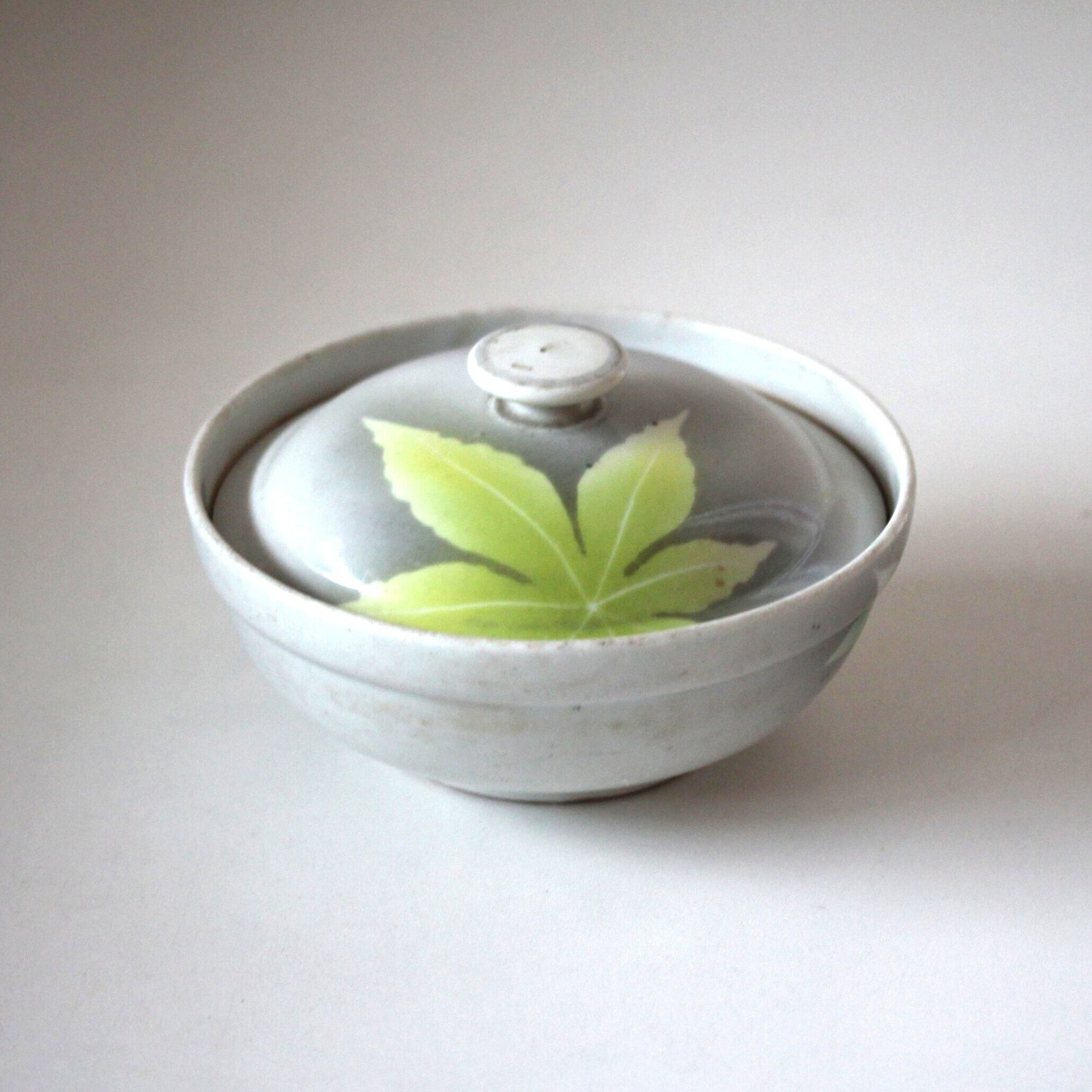 A charming enameled porcelain covered bowl, with design of momiji maple leaves in different size colors.
