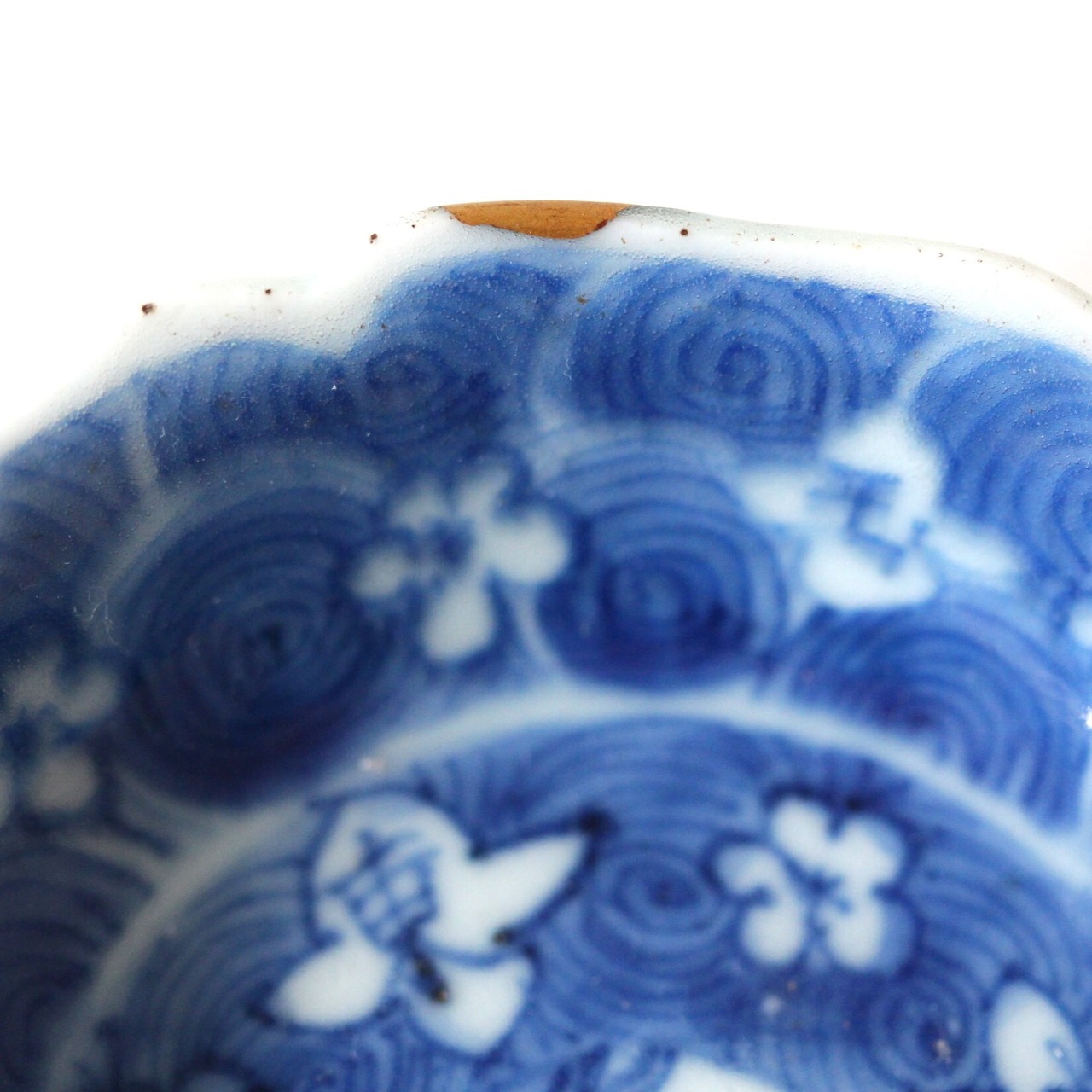 A kintsugi repaired charming blue and white small dish with design of a rabbit and Chinese letters around. It can be used as a sake cup too.
