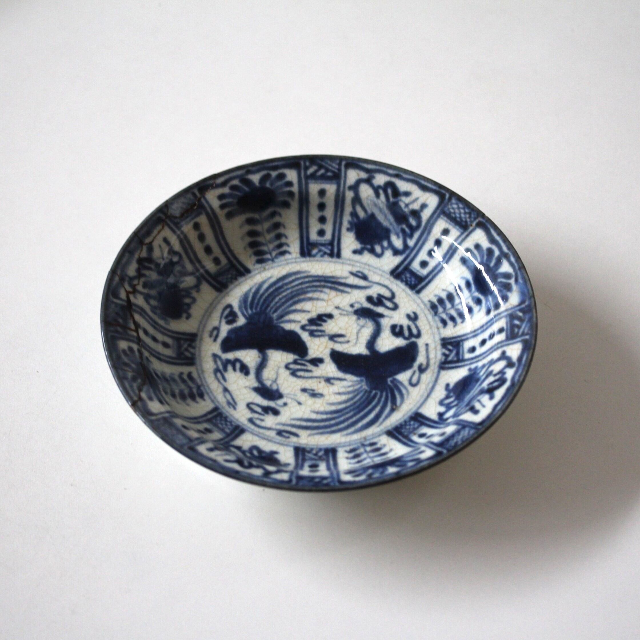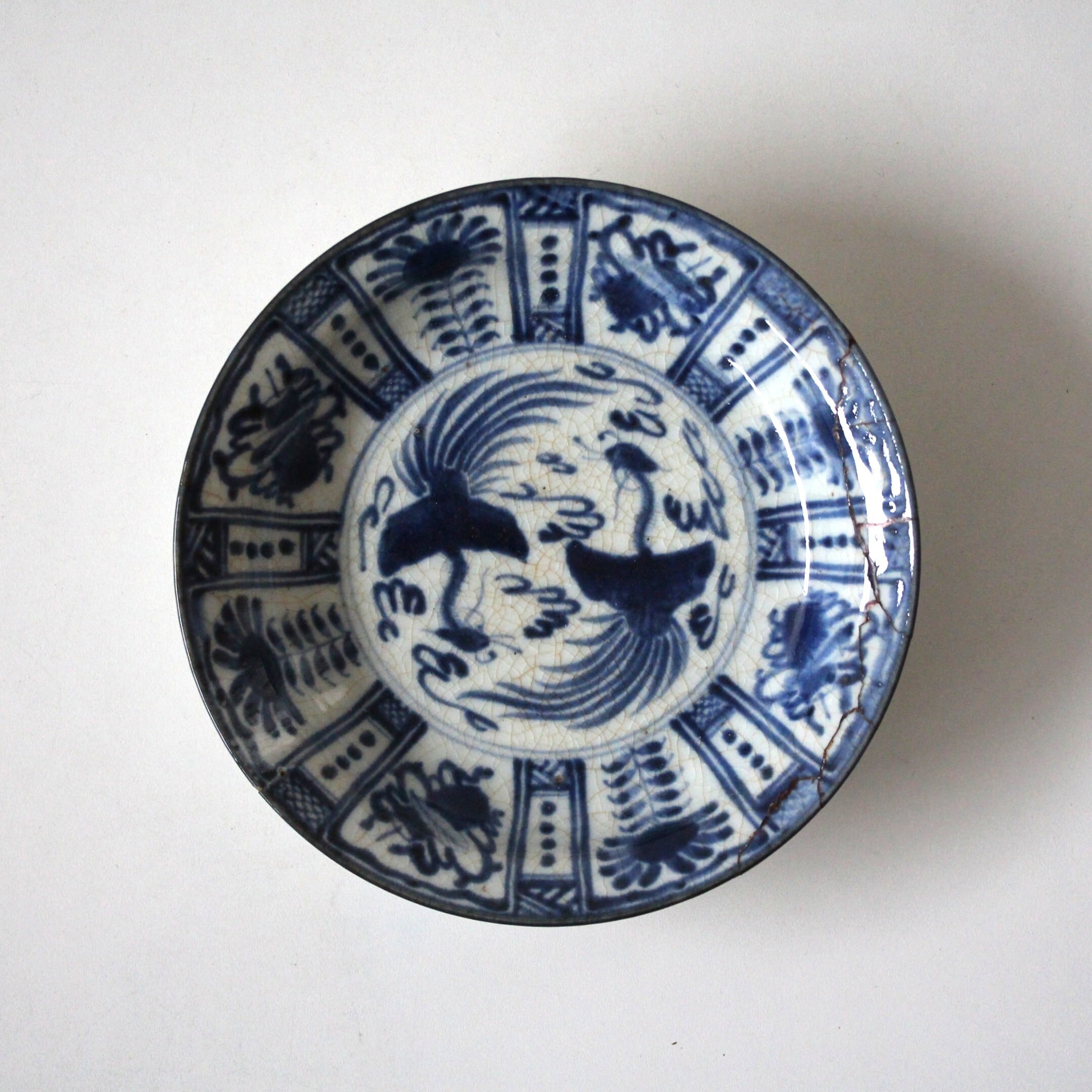 九谷若杉染付芙蓉手鳳凰宝尽文皿 d18.4cm Kutani Blue and White Kraak Pattern Dish, Design of Double Phoenix and Treasures 19th C | HANAFUDA