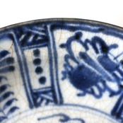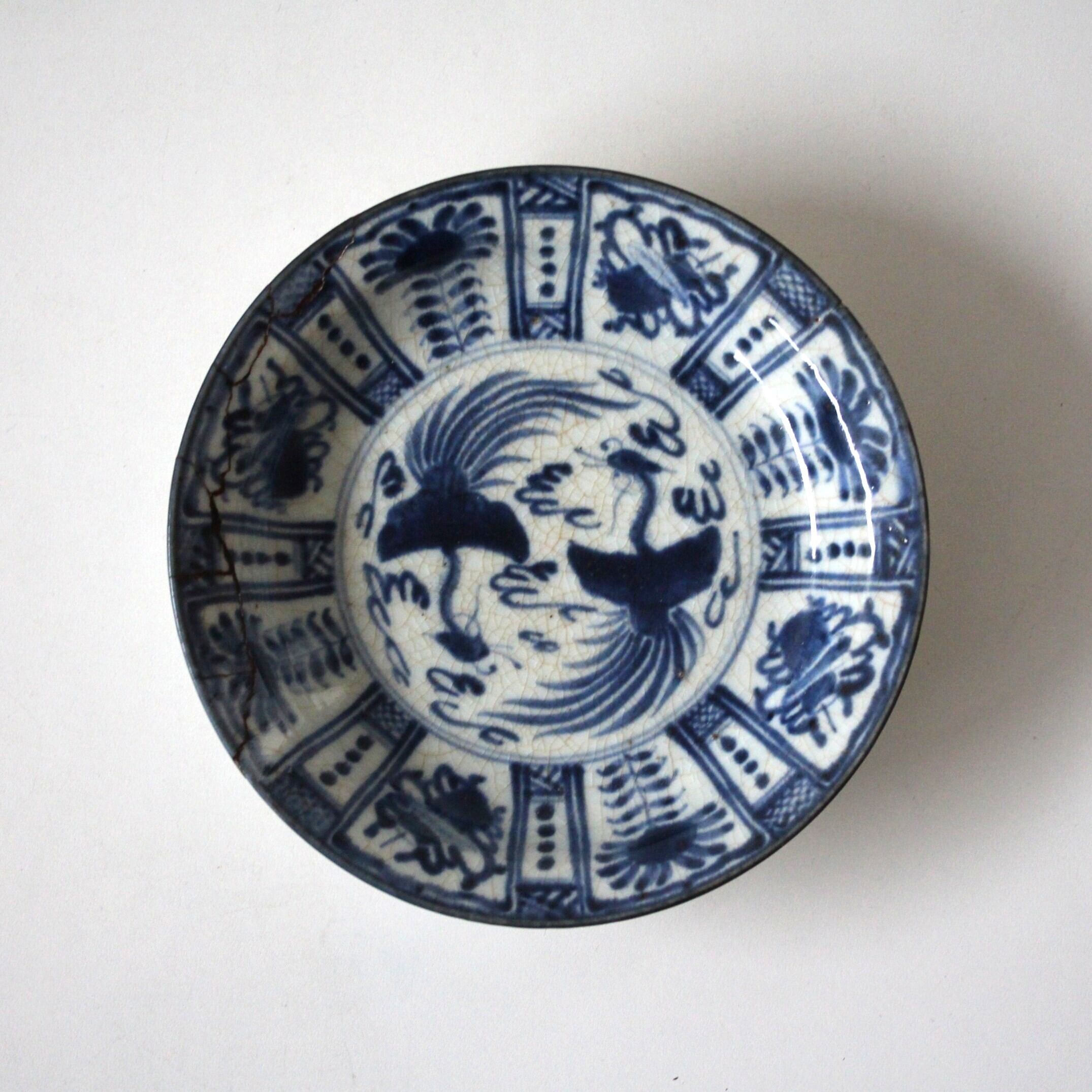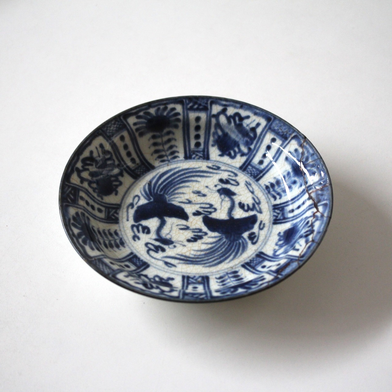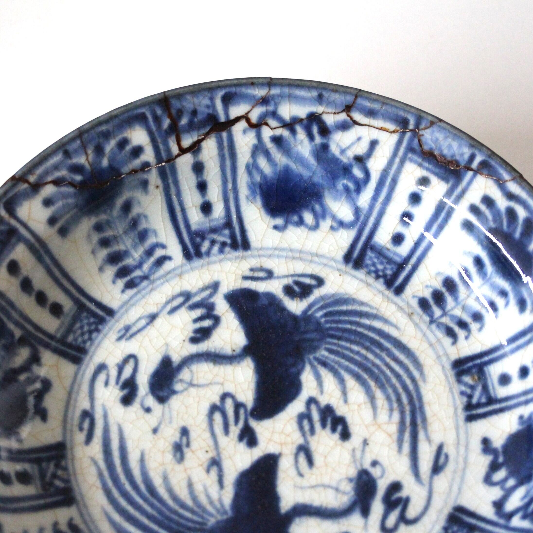 A lacquer repaired porcelain plate with kraak pattern, with double phoenixes in the center. Treasures are painted around. The design is influenced by Chinese Late Ming porcelain plates.