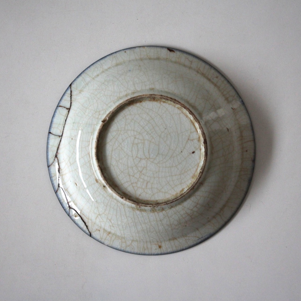 状態:口縁の割れを漆継ぎ。口縁にうすいニュウ。高台にホツ。シミ汚れ。