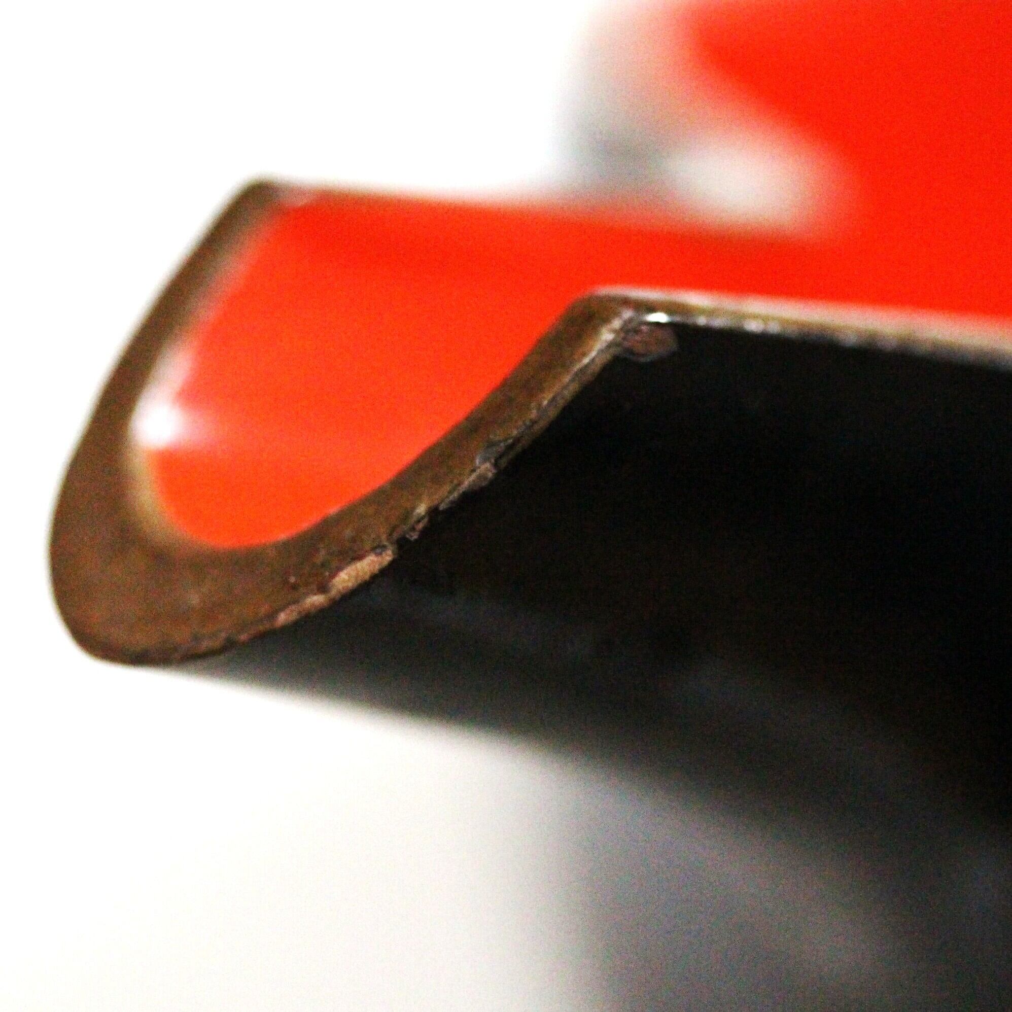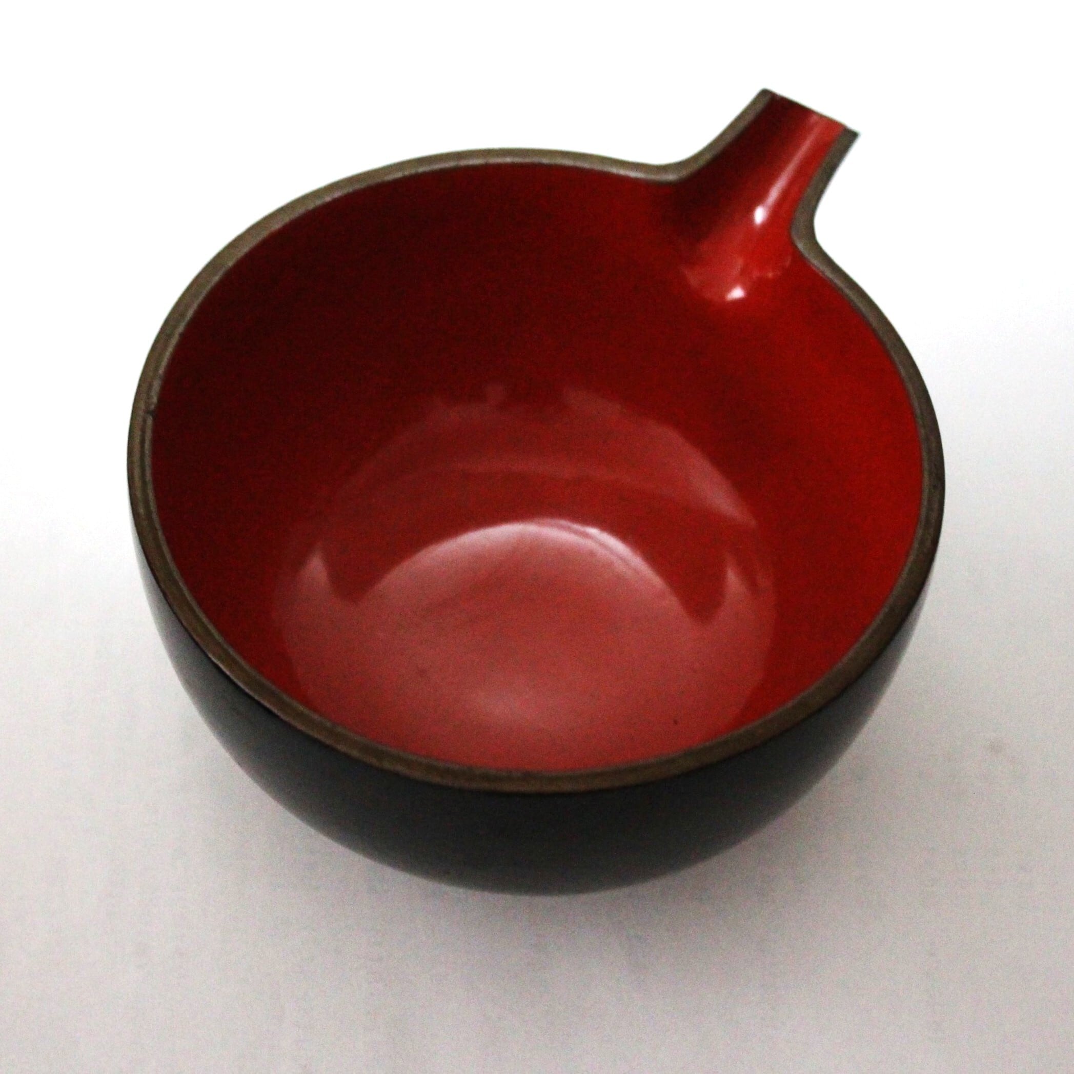 A scuffed and minor chipped lacquered wooden katakuchi bowl. Black lacquered outside and red lacquered inside.