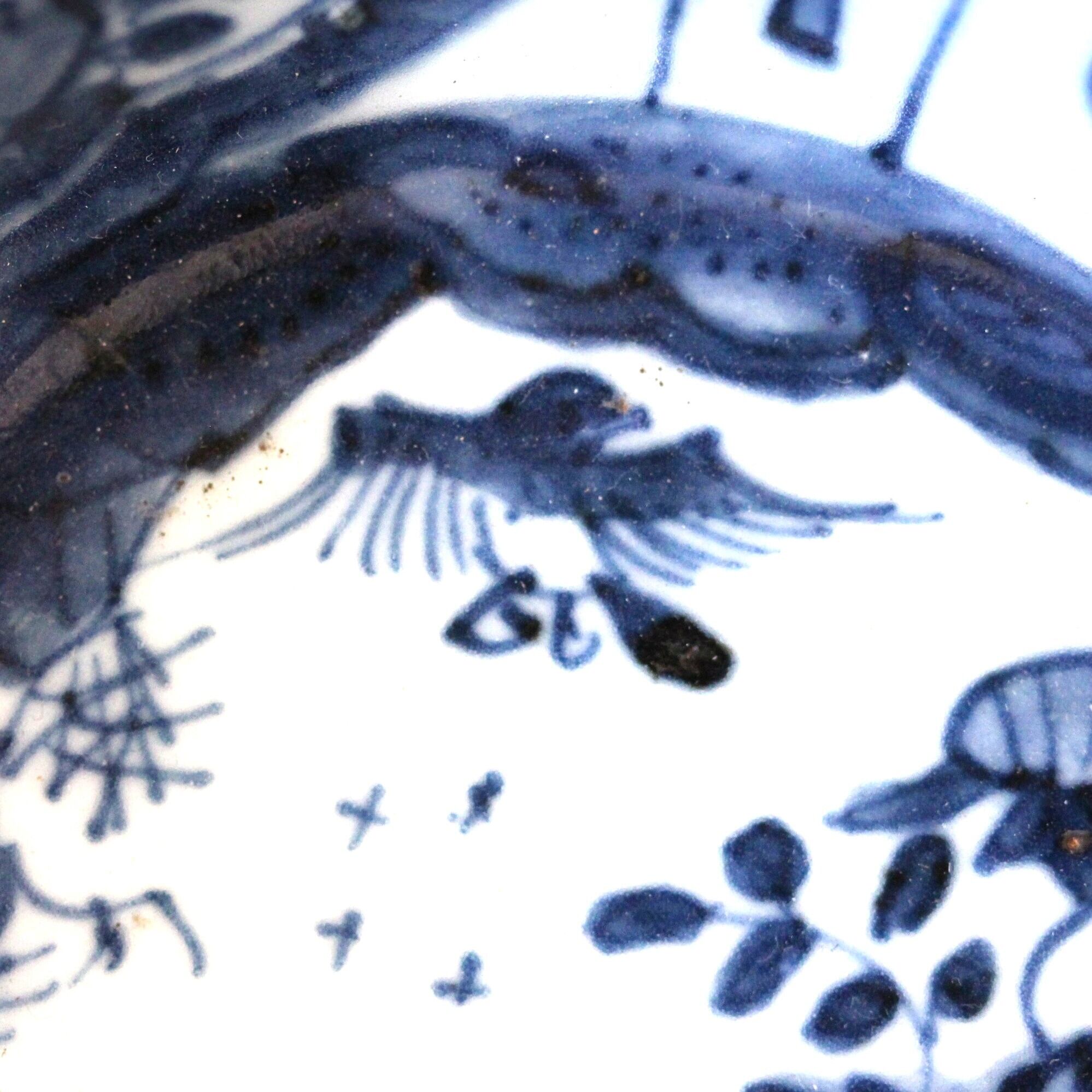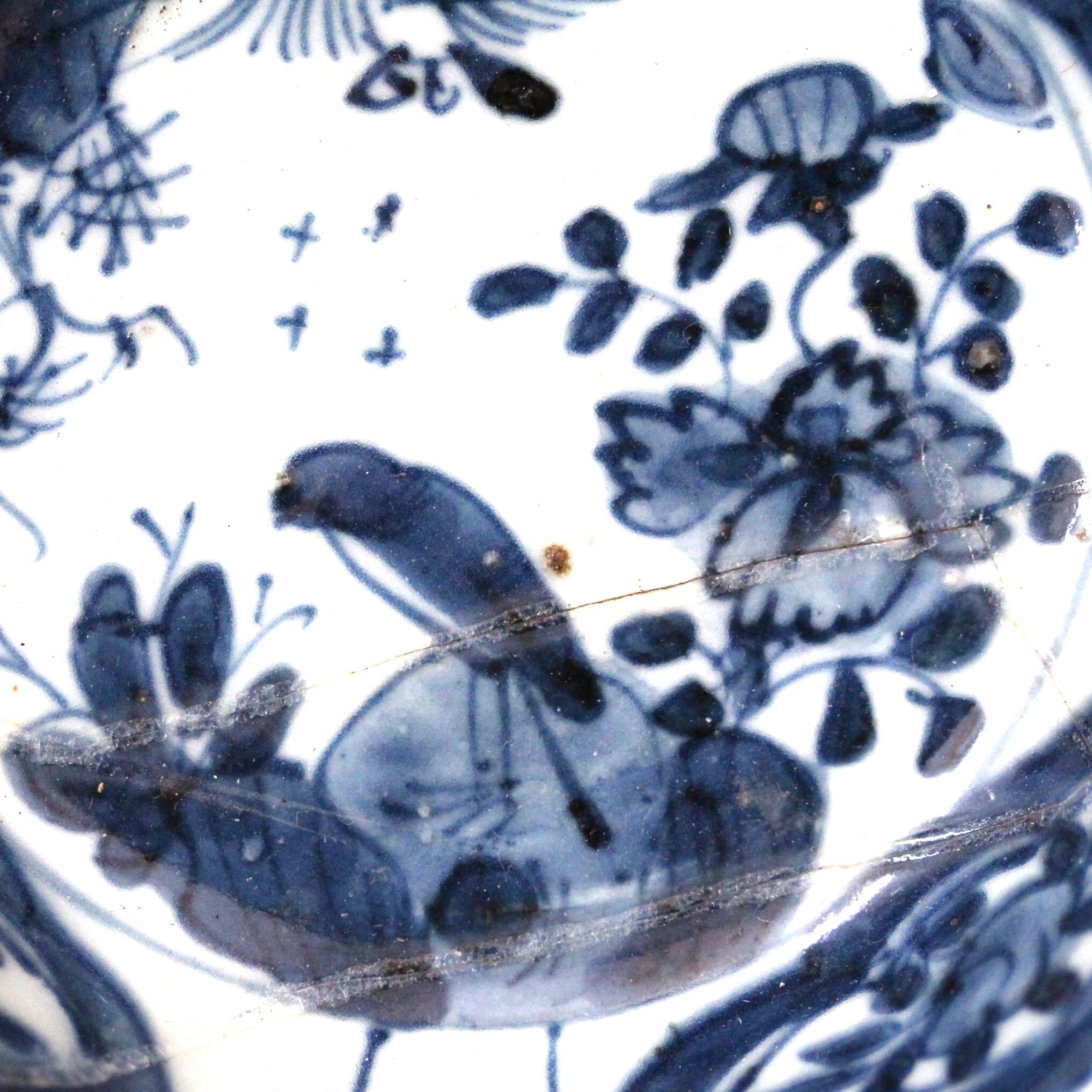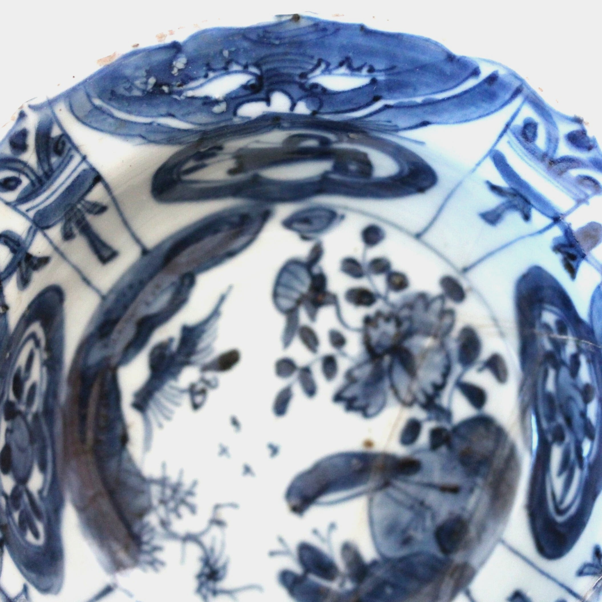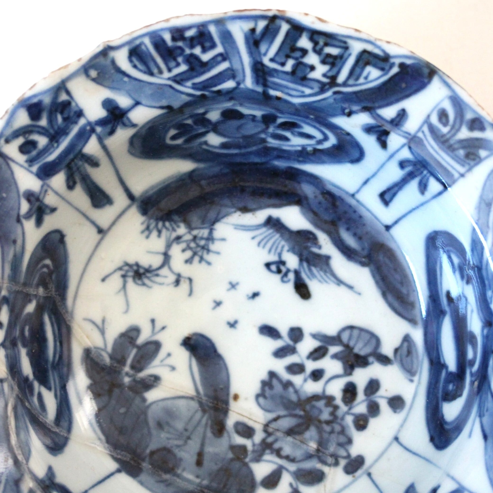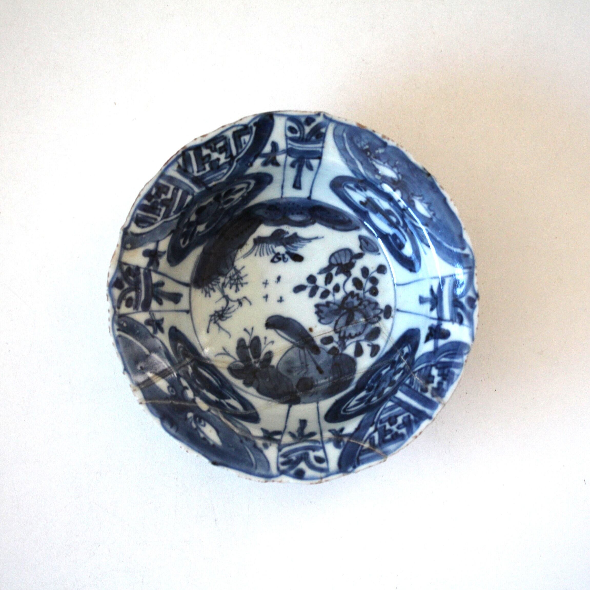 古染付花鳥文兜鉢 d15.1cm Jingdezhen Blue and White Klapmuts Bowl, Design of Birds and Flowers 17th C | HANAFUDA