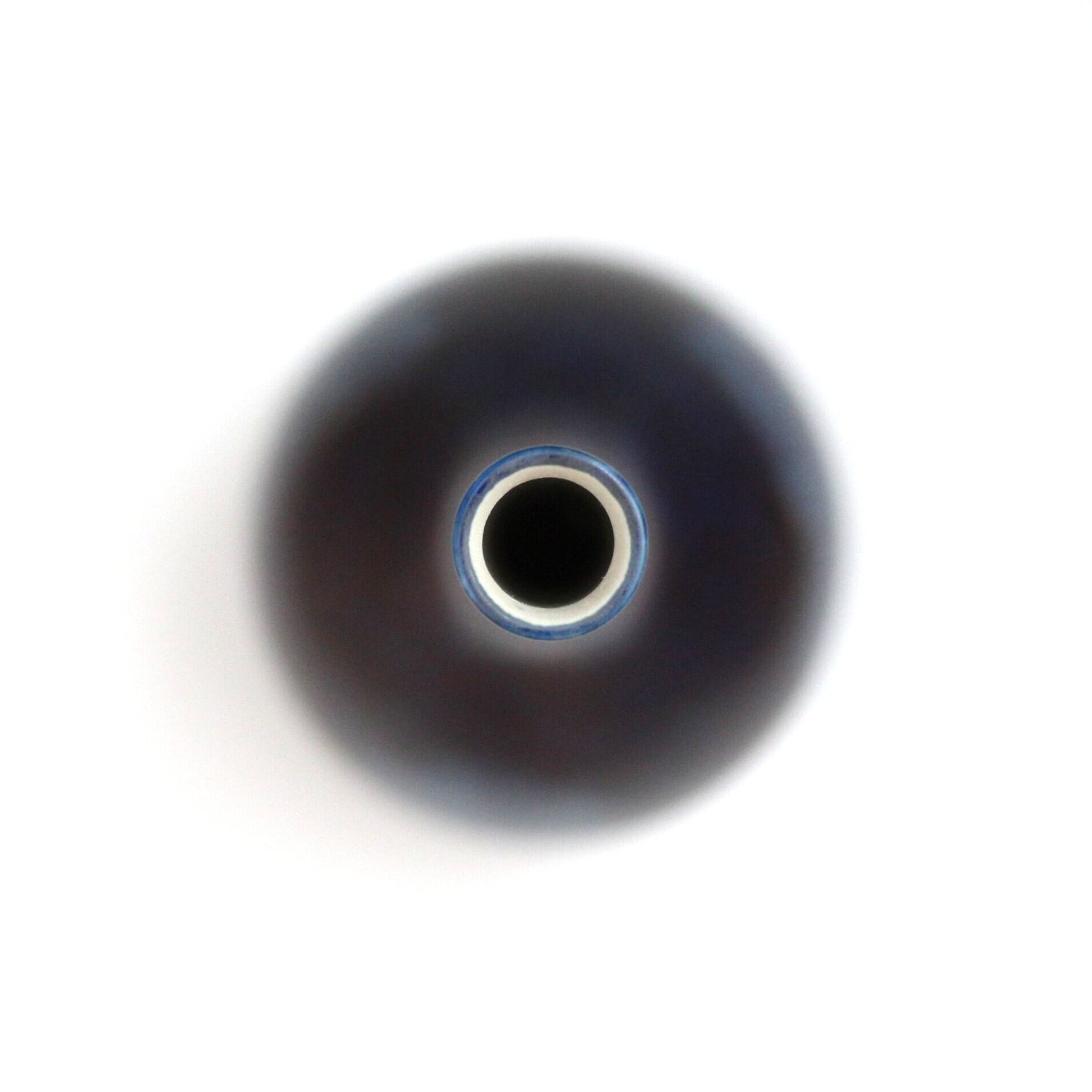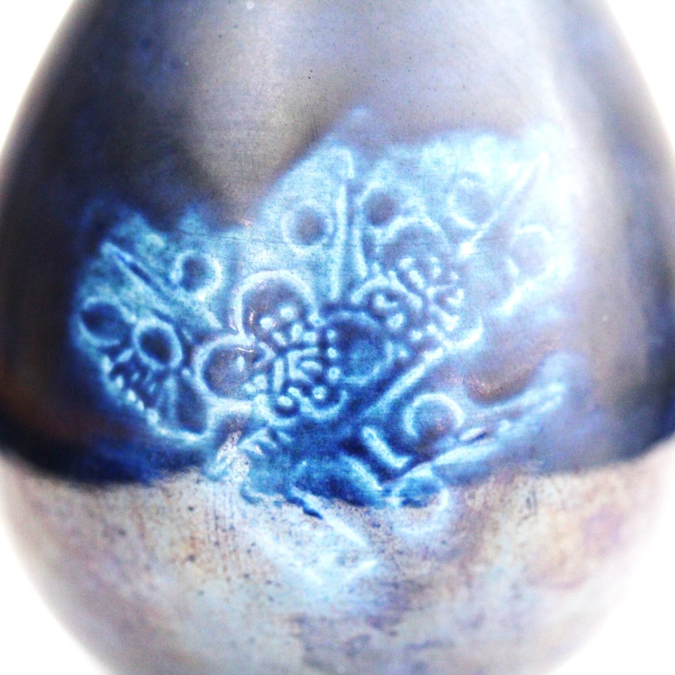 ふくらんだ胴の3面には松、竹、梅の文様が施され、(底部をのぞく)全面に深い瑠璃色の釉薬が掛けられています。