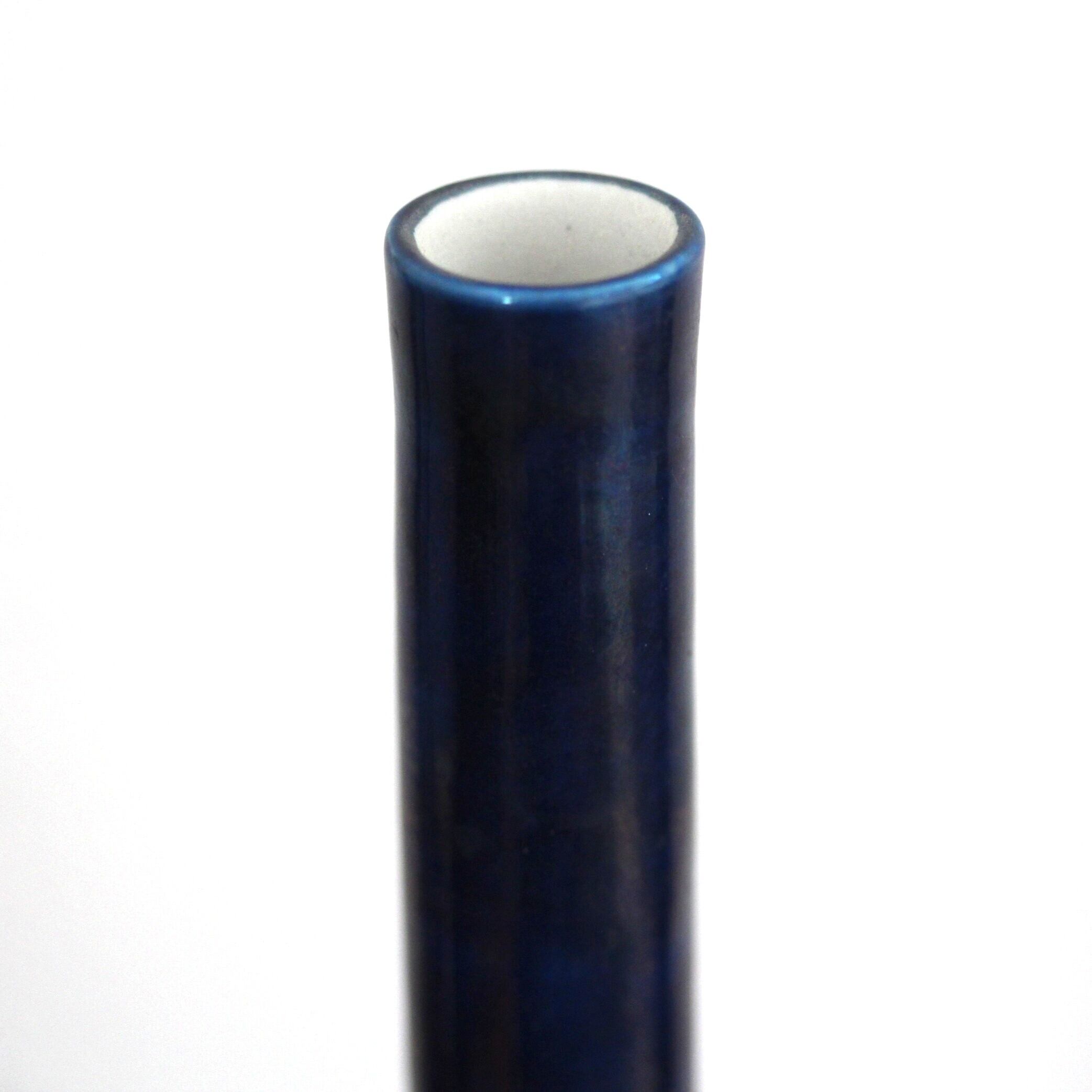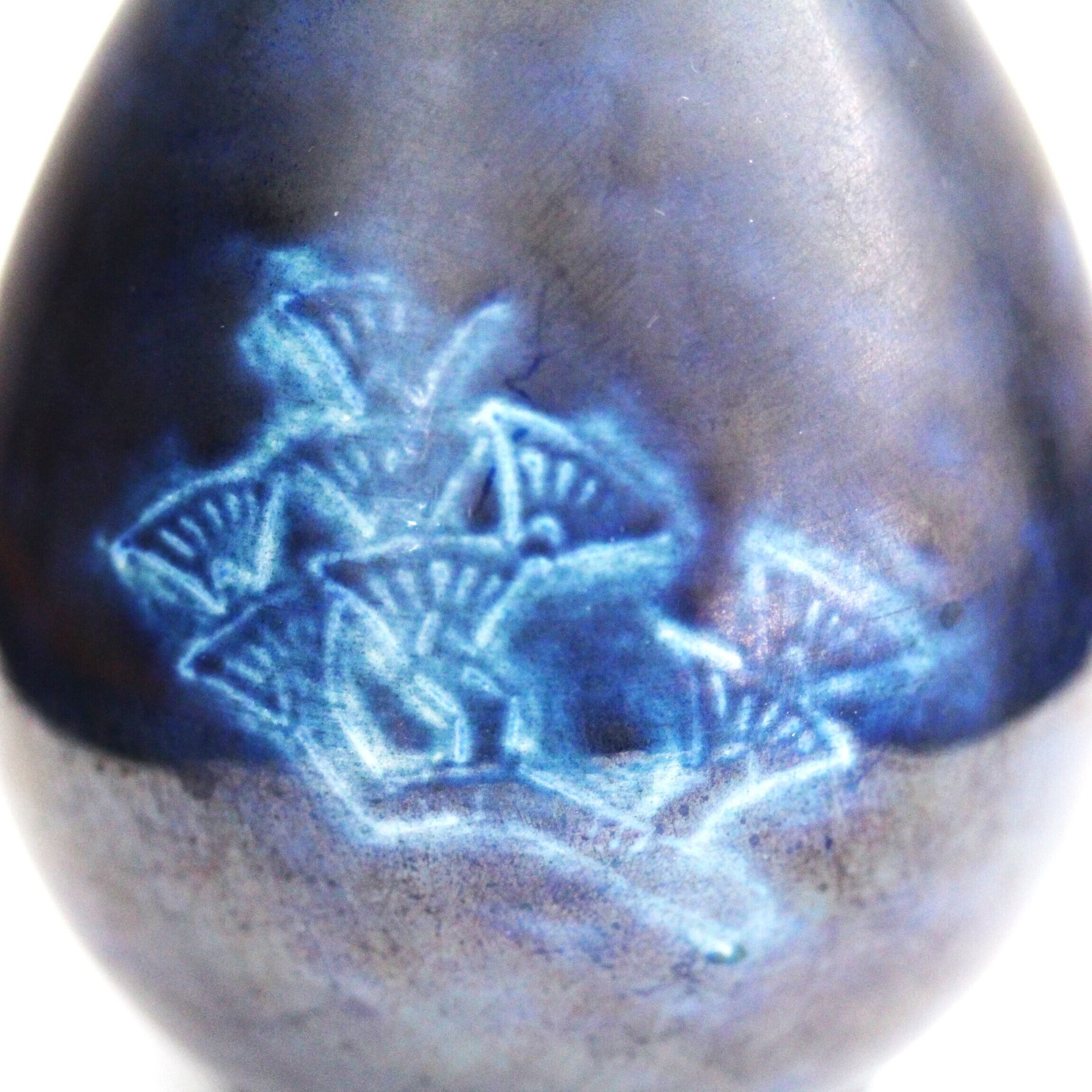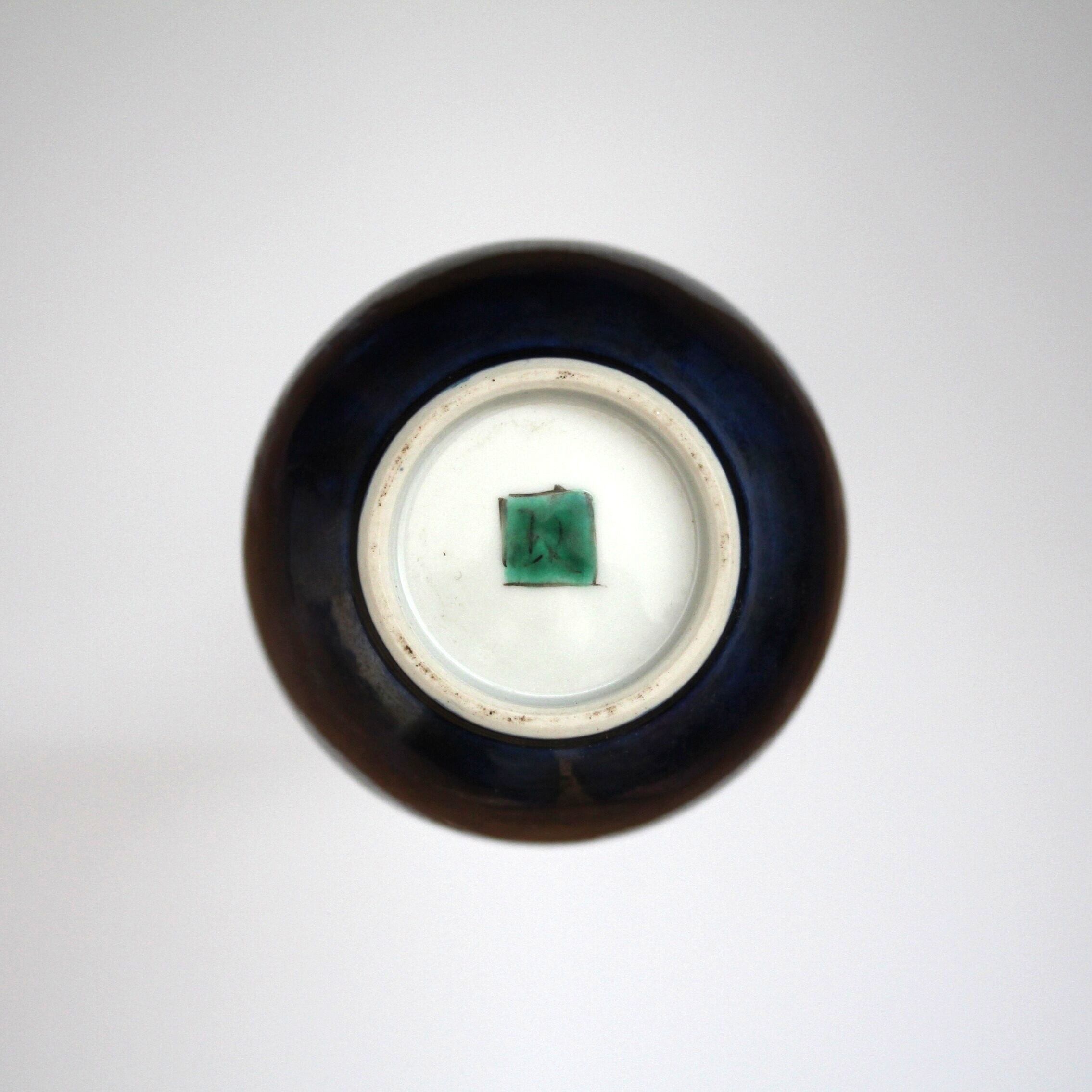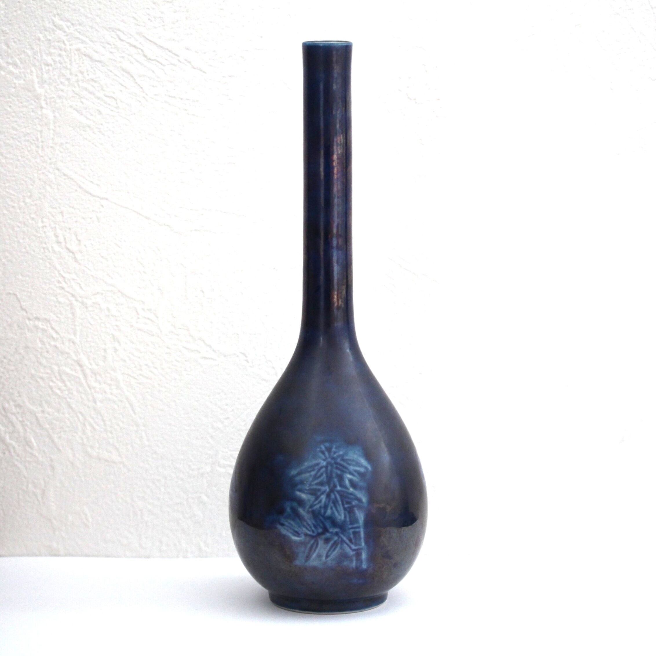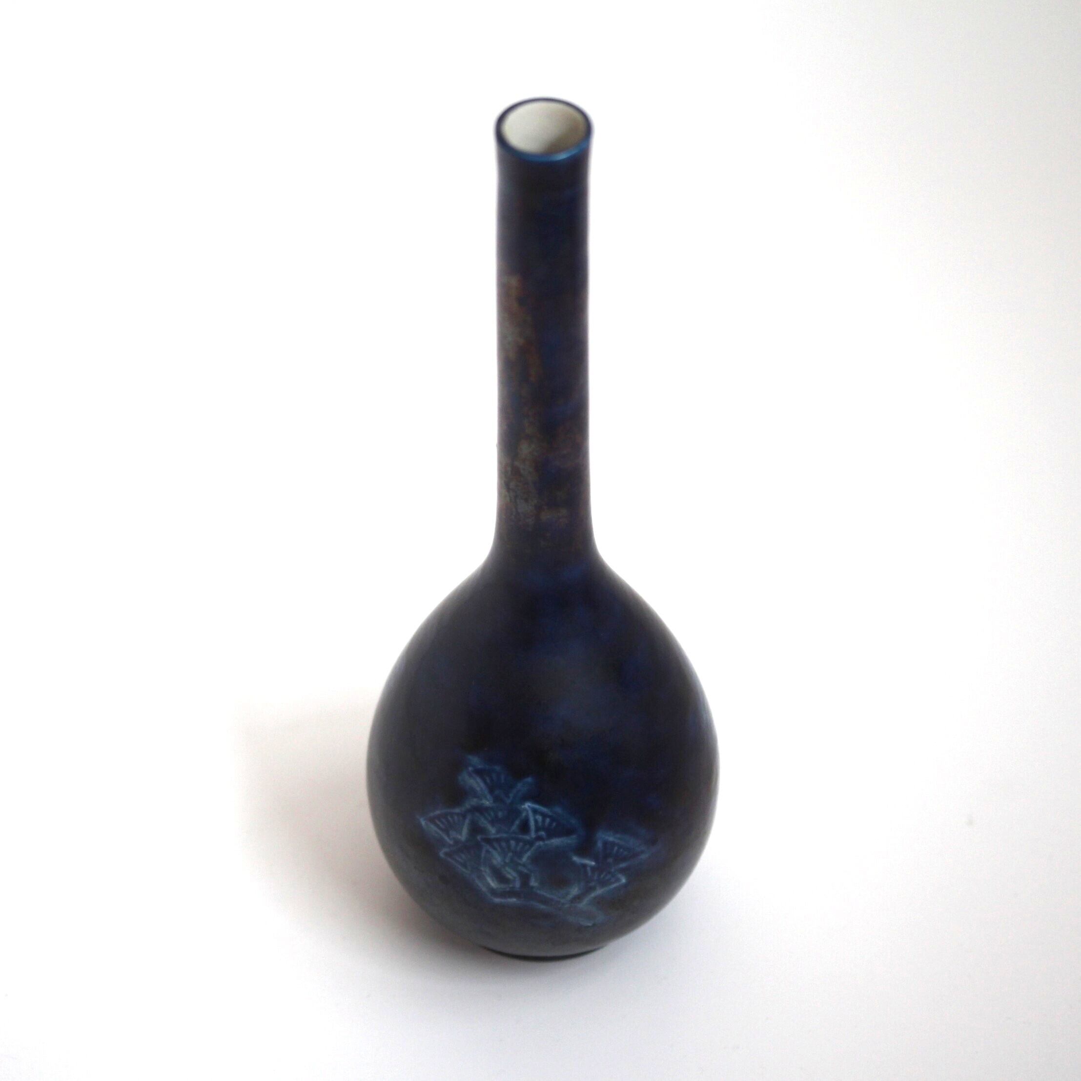 九谷瑠璃釉陰刻松竹梅文鶴首花入 h22.5cm Kutani Dark Blue Glazed Lang Neck Vase, Embossed Design of Shochikubai 20th C | HANAFUDA