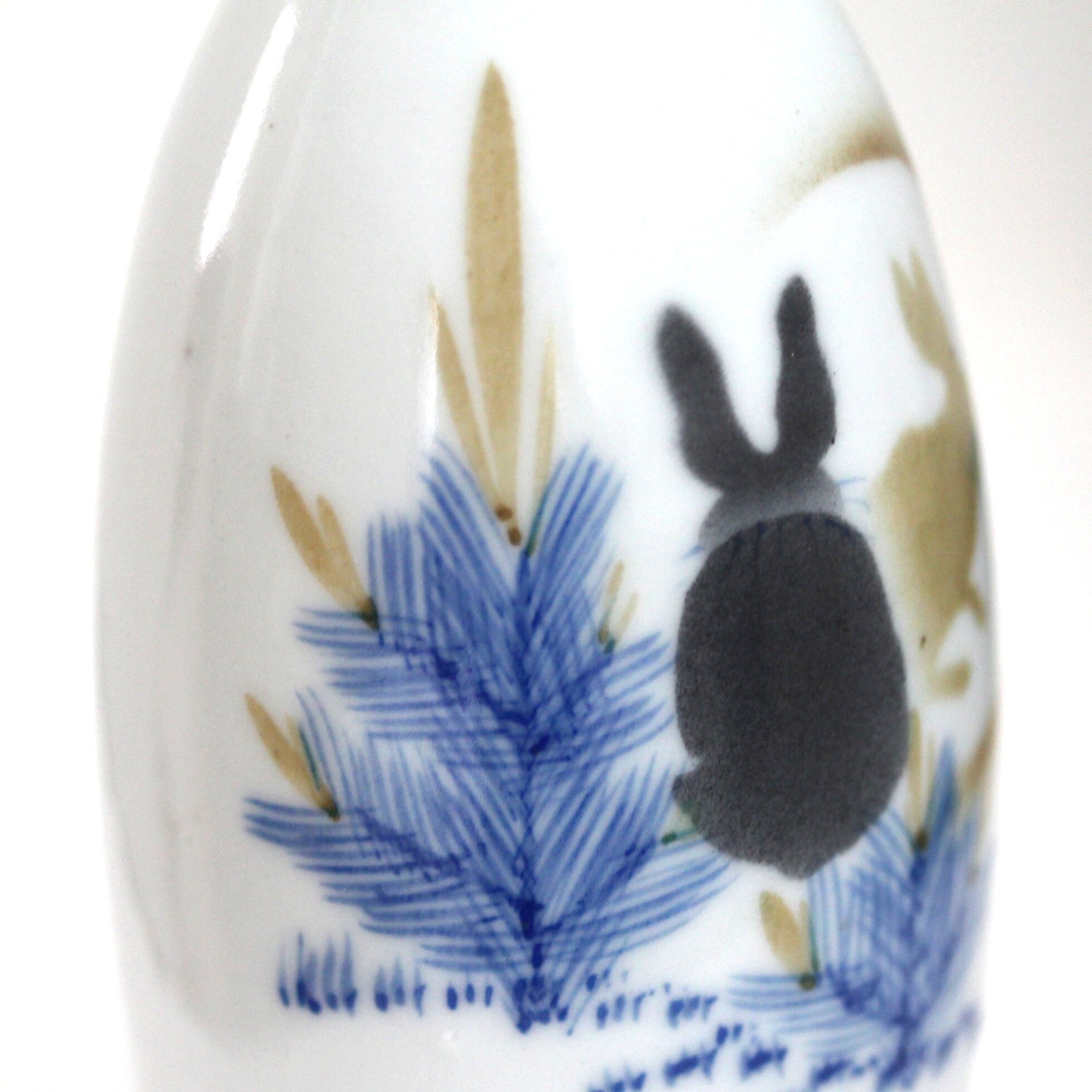 A charming porcelain bottle, with design of young pines, rabbits and the Moon. Pines are painted in underglaze blue, while rabbits and the Moon are painres in underglaze enamels with fukizumi spray technique.