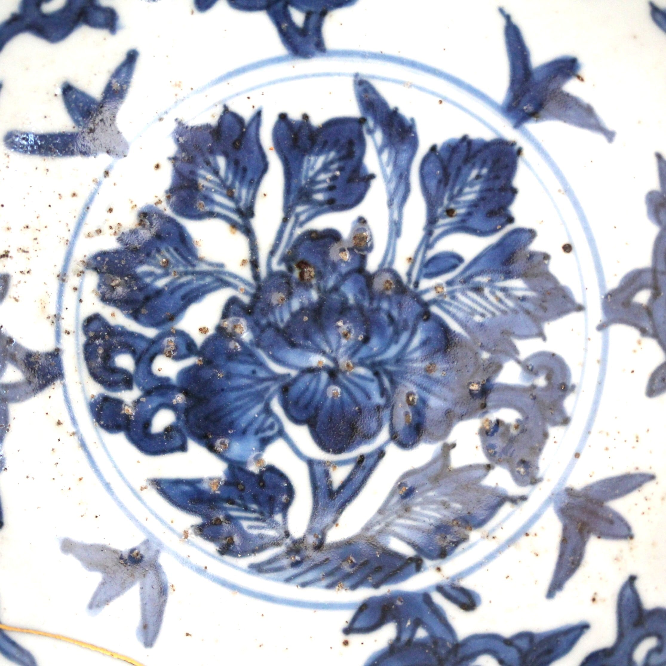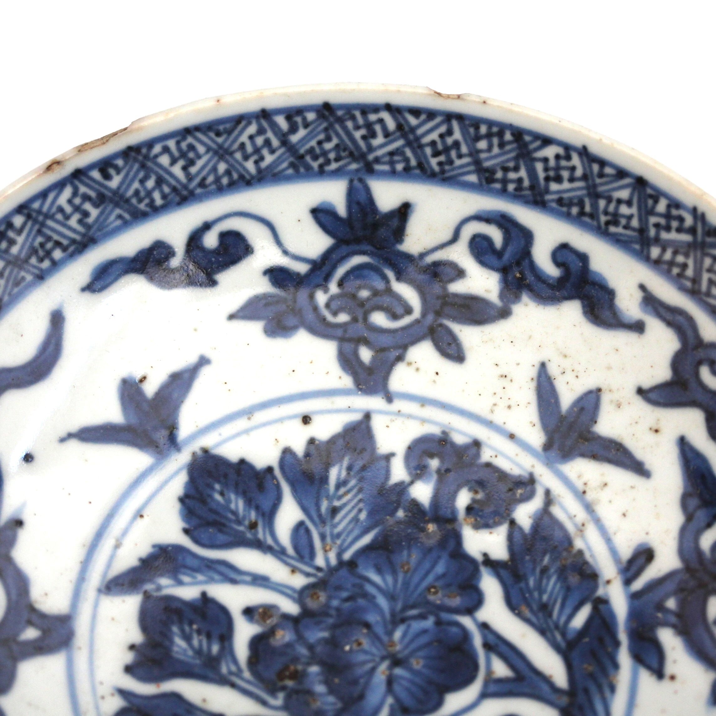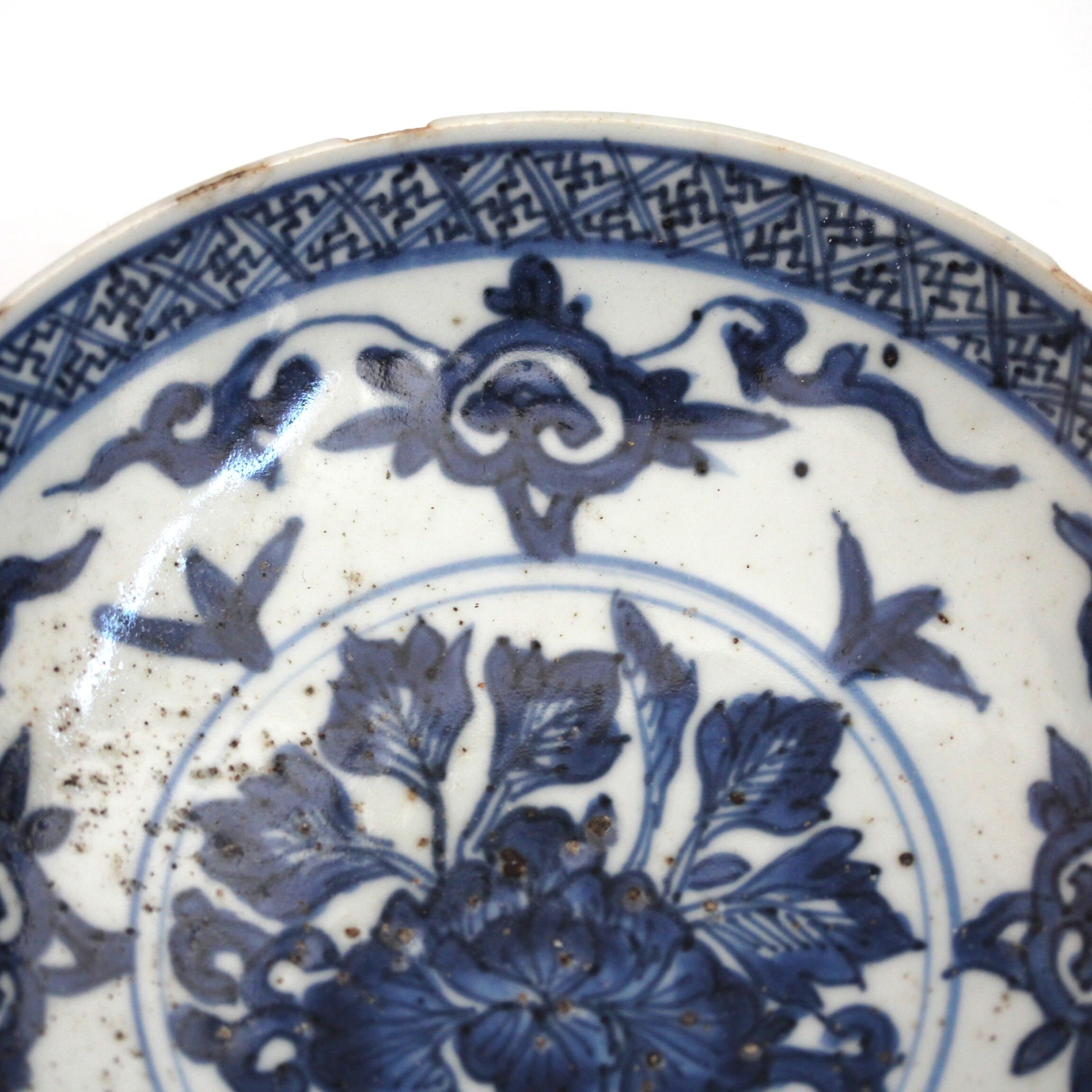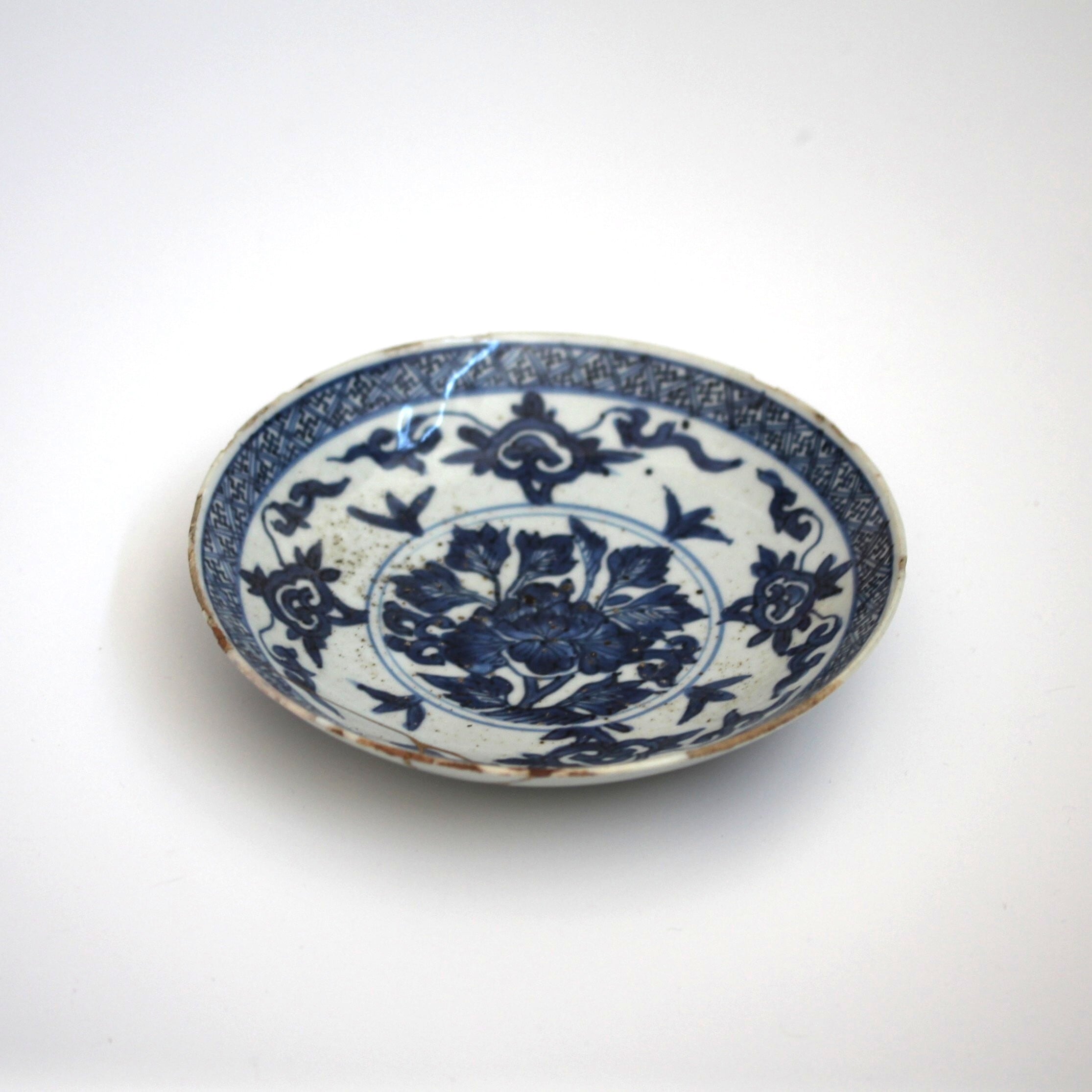 古染付牡丹如意頭唐草文皿 d15.8cm Jingdezhen Blue and White Dish, Peony Design and Nyoito Pattern 17th C | HANAFUDA