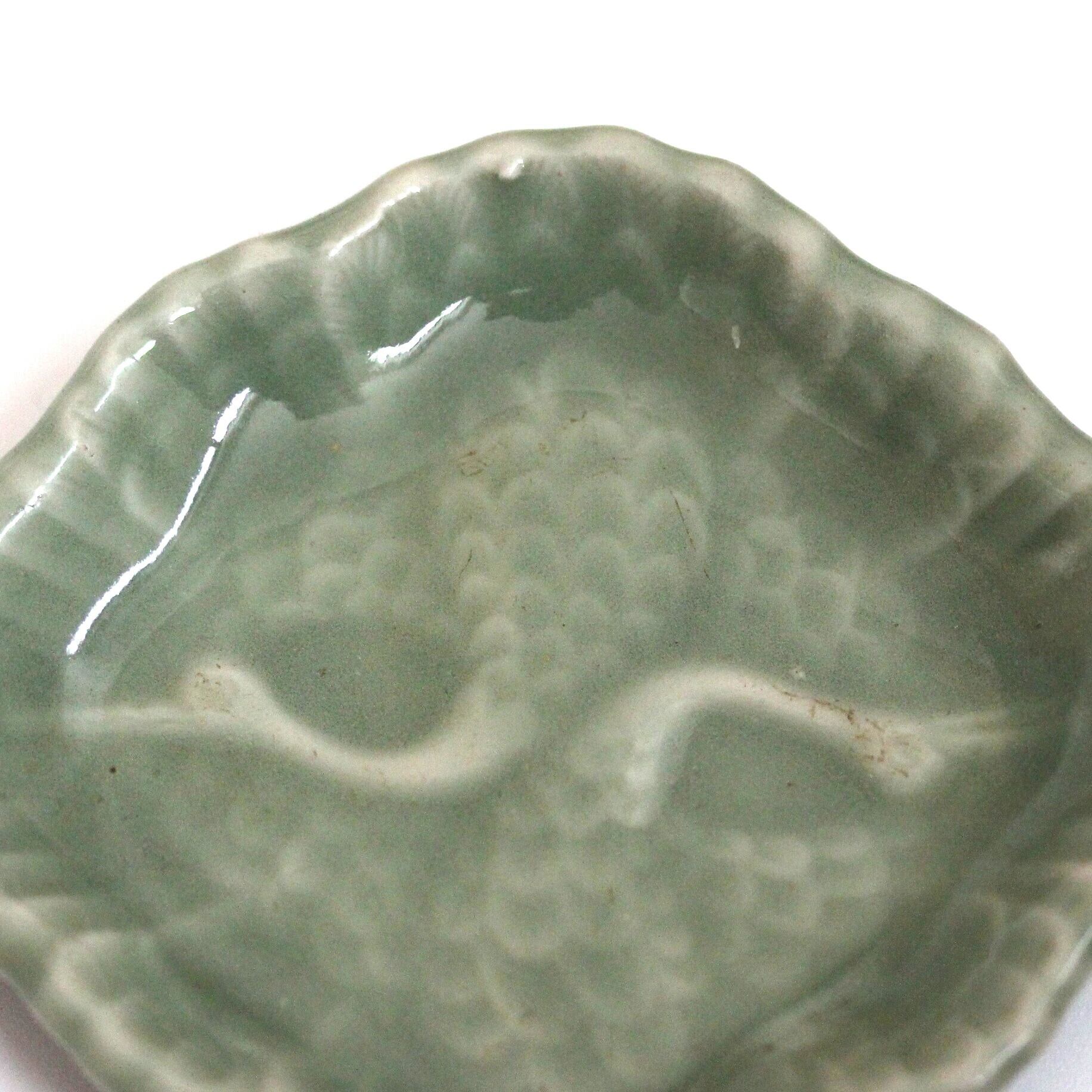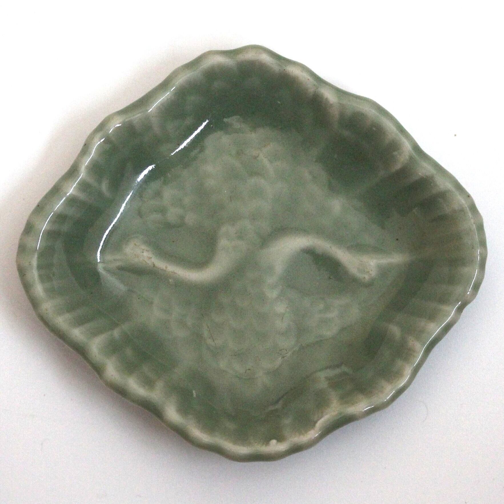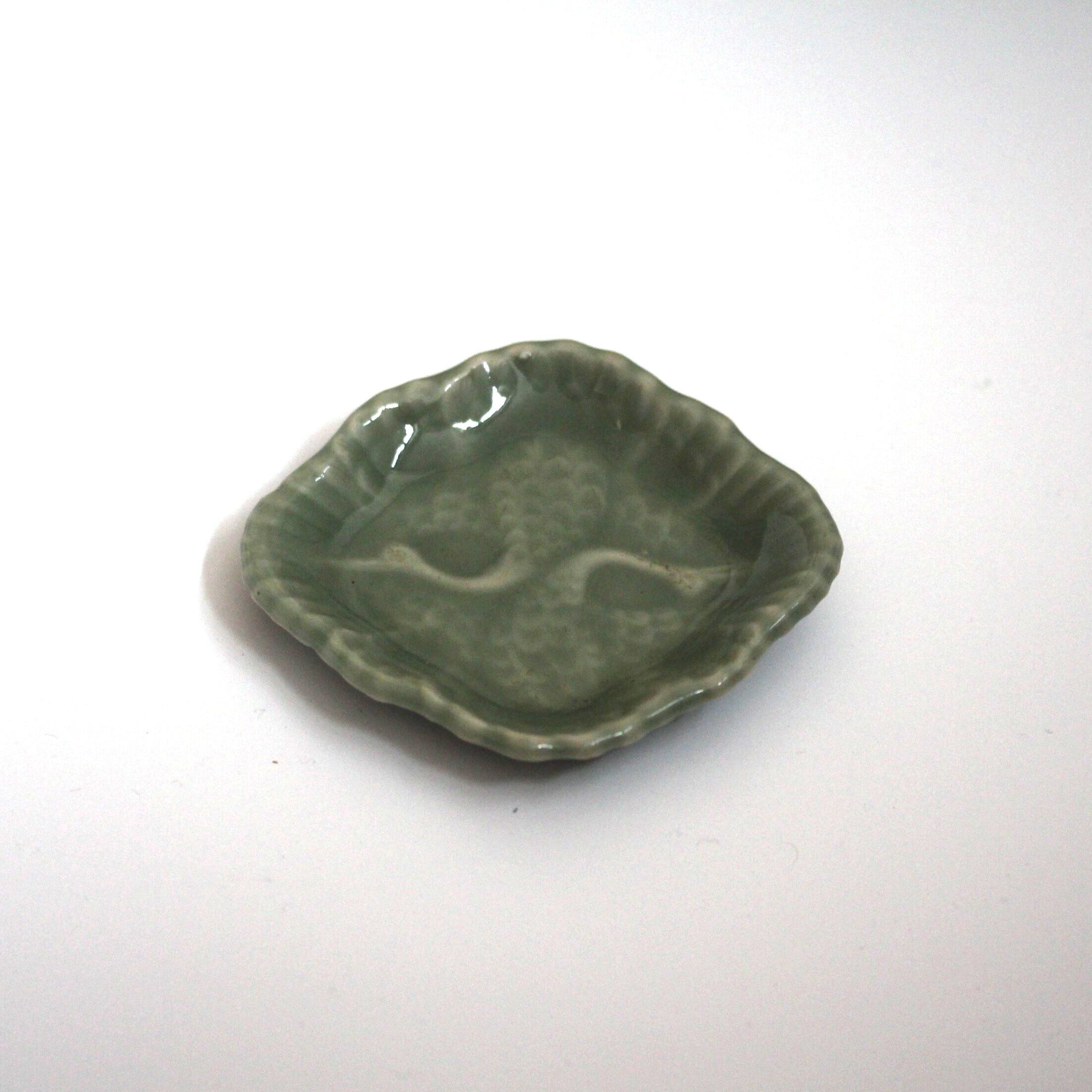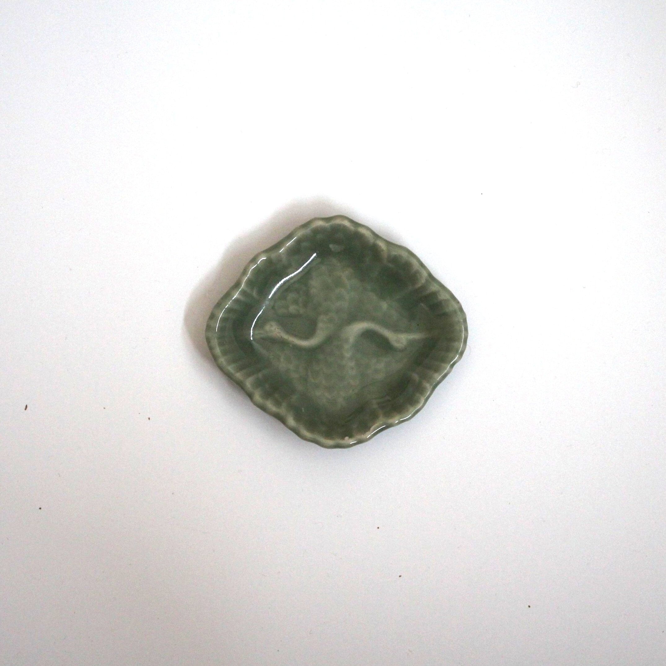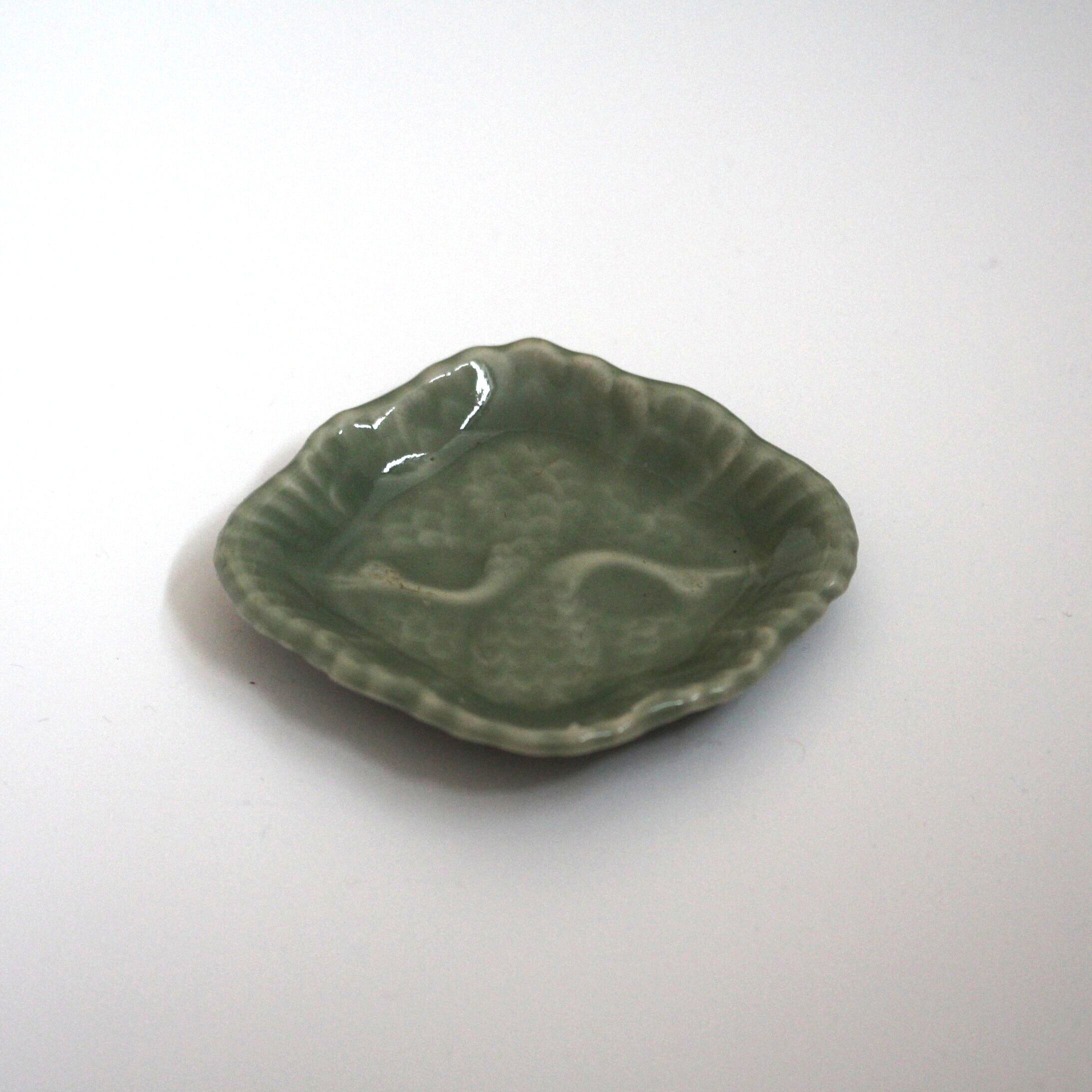 三田青磁陽刻双鶴文菱小皿(その3)d9.8cm Sanda Celadon Rhombus Small Dish, Embossed Design of Cranes 19th C | HANAFUDA
