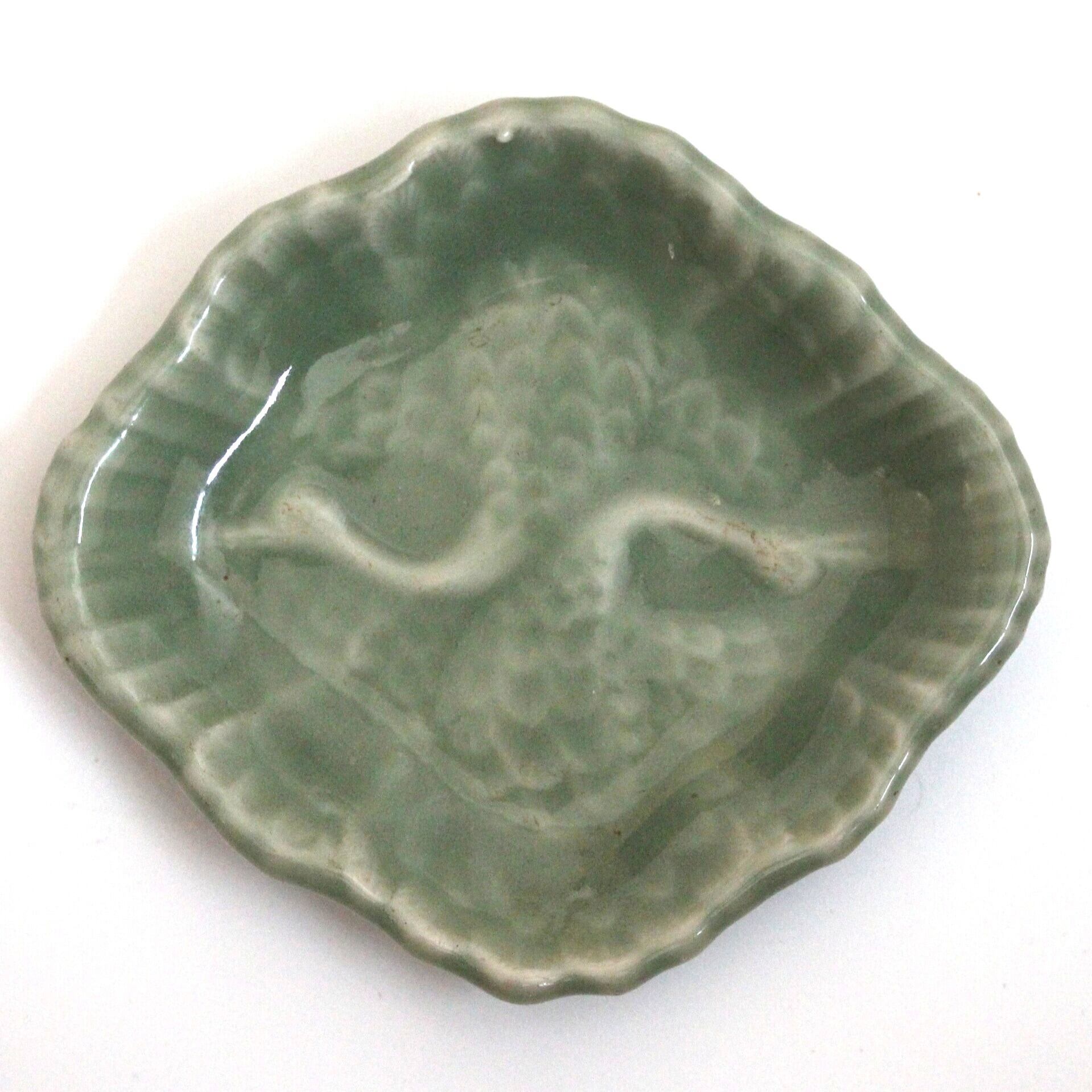 A charming celadon glazed porcelain rhmbus shaped small dish with design of flying cranes. Four small legs on the bottom.
